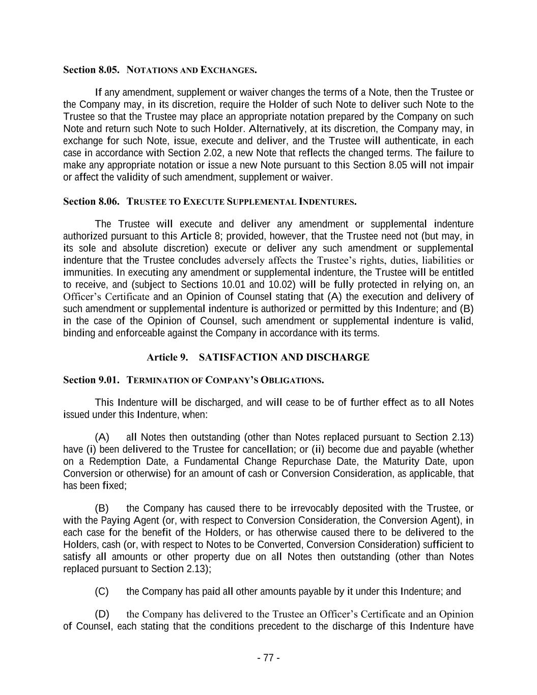 - 77 - Section 8.05. NOTATIONS AND EXCHANGES. If any amendment, supplement or waiver changes the terms of a Note, then the Trustee or the Company may, in its discretion, require the Holder of such Note to deliver such Note to the Trustee so that the Trustee may place an appropriate notation prepared by the Company on such Note and return such Note to such Holder. Alternatively, at its discretion, the Company may, in exchange for such Note, issue, execute and deliver, and the Trustee will authenticate, in each case in accordance with Section 2.02, a new Note that reflects the changed terms. The failure to make any appropriate notation or issue a new Note pursuant to this Section 8.05 will not impair or affect the validity of such amendment, supplement or waiver. Section 8.06. TRUSTEE TO EXECUTE SUPPLEMENTAL INDENTURES. The Trustee will execute and deliver any amendment or supplemental indenture authorized pursuant to this Article 8; provided, however, that the Trustee need not (but may, in its sole and absolute discretion) execute or deliver any such amendment or supplemental indenture that the Trustee concludes adversely affects the Trustee’s rights, duties, liabilities or immunities. In executing any amendment or supplemental indenture, the Trustee will be entitled to receive, and (subject to Sections 10.01 and 10.02) will be fully protected in relying on, an Officer’s Certificate and an Opinion of Counsel stating that (A) the execution and delivery of such amendment or supplemental indenture is authorized or permitted by this Indenture; and (B) in the case of the Opinion of Counsel, such amendment or supplemental indenture is valid, binding and enforceable against the Company in accordance with its terms. Article 9. SATISFACTION AND DISCHARGE Section 9.01. TERMINATION OF COMPANY’S OBLIGATIONS. This Indenture will be discharged, and will cease to be of further effect as to all Notes issued under this Indenture, when: (A) all Notes then outstanding (other than Notes replaced pursuant to Section 2.13) have (i) been delivered to the Trustee for cancellation; or (ii) become due and payable (whether on a Redemption Date, a Fundamental Change Repurchase Date, the Maturity Date, upon Conversion or otherwise) for an amount of cash or Conversion Consideration, as applicable, that has been fixed; (B) the Company has caused there to be irrevocably deposited with the Trustee, or with the Paying Agent (or, with respect to Conversion Consideration, the Conversion Agent), in each case for the benefit of the Holders, or has otherwise caused there to be delivered to the Holders, cash (or, with respect to Notes to be Converted, Conversion Consideration) sufficient to satisfy all amounts or other property due on all Notes then outstanding (other than Notes replaced pursuant to Section 2.13); (C) the Company has paid all other amounts payable by it under this Indenture; and (D) the Company has delivered to the Trustee an Officer’s Certificate and an Opinion of Counsel, each stating that the conditions precedent to the discharge of this Indenture have