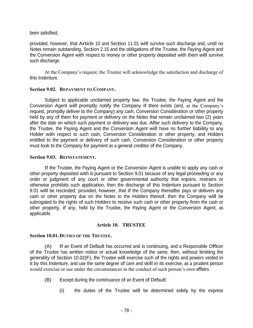 - 78 - been satisfied; provided, however, that Article 10 and Section 11.01 will survive such discharge and, until no Notes remain outstanding, Section 2.15 and the obligations of the Trustee, the Paying Agent and the Conversion Agent with respect to money or other property deposited with them will survive such discharge. At the Company’s request, the Trustee will acknowledge the satisfaction and discharge of this Indenture. Section 9.02. REPAYMENT TO COMPANY. Subject to applicable unclaimed property law, the Trustee, the Paying Agent and the Conversion Agent will promptly notify the Company if there exists (and, at the Company’s request, promptly deliver to the Company) any cash, Conversion Consideration or other property held by any of them for payment or delivery on the Notes that remain unclaimed two (2) years after the date on which such payment or delivery was due. After such delivery to the Company, the Trustee, the Paying Agent and the Conversion Agent will have no further liability to any Holder with respect to such cash, Conversion Consideration or other property, and Holders entitled to the payment or delivery of such cash, Conversion Consideration or other property must look to the Company for payment as a general creditor of the Company. Section 9.03. REINSTATEMENT. If the Trustee, the Paying Agent or the Conversion Agent is unable to apply any cash or other property deposited with it pursuant to Section 9.01 because of any legal proceeding or any order or judgment of any court or other governmental authority that enjoins, restrains or otherwise prohibits such application, then the discharge of this Indenture pursuant to Section 9.01 will be rescinded; provided, however, that if the Company thereafter pays or delivers any cash or other property due on the Notes to the Holders thereof, then the Company will be subrogated to the rights of such Holders to receive such cash or other property from the cash or other property, if any, held by the Trustee, the Paying Agent or the Conversion Agent, as applicable. Article 10. TRUSTEE Section 10.01. DUTIES OF THE TRUSTEE. (A) If an Event of Default has occurred and is continuing, and a Responsible Officer of the Trustee has written notice or actual knowledge of the same, then, without limiting the generality of Section 10.02(F), the Trustee will exercise such of the rights and powers vested in it by this Indenture, and use the same degree of care and skill in its exercise, as a prudent person would exercise or use under the circumstances in the conduct of such person’s own affairs. (B) Except during the continuance of an Event of Default: (i) the duties of the Trustee will be determined solely by the express