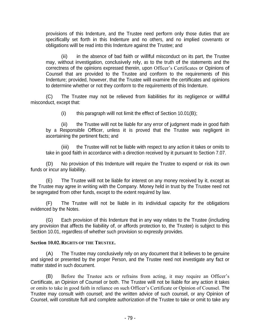 - 79 - provisions of this Indenture, and the Trustee need perform only those duties that are specifically set forth in this Indenture and no others, and no implied covenants or obligations will be read into this Indenture against the Trustee; and (ii) in the absence of bad faith or willful misconduct on its part, the Trustee may, without investigation, conclusively rely, as to the truth of the statements and the correctness of the opinions expressed therein, upon Officer’s Certificates or Opinions of Counsel that are provided to the Trustee and conform to the requirements of this Indenture; provided, however, that the Trustee will examine the certificates and opinions to determine whether or not they conform to the requirements of this Indenture. (C) The Trustee may not be relieved from liabilities for its negligence or willful misconduct, except that: (i) this paragraph will not limit the effect of Section 10.01(B); (ii) the Trustee will not be liable for any error of judgment made in good faith by a Responsible Officer, unless it is proved that the Trustee was negligent in ascertaining the pertinent facts; and (iii) the Trustee will not be liable with respect to any action it takes or omits to take in good faith in accordance with a direction received by it pursuant to Section 7.07. (D) No provision of this Indenture will require the Trustee to expend or risk its own funds or incur any liability. (E) The Trustee will not be liable for interest on any money received by it, except as the Trustee may agree in writing with the Company. Money held in trust by the Trustee need not be segregated from other funds, except to the extent required by law. (F) The Trustee will not be liable in its individual capacity for the obligations evidenced by the Notes. (G) Each provision of this Indenture that in any way relates to the Trustee (including any provision that affects the liability of, or affords protection to, the Trustee) is subject to this Section 10.01, regardless of whether such provision so expressly provides. Section 10.02. RIGHTS OF THE TRUSTEE. (A) The Trustee may conclusively rely on any document that it believes to be genuine and signed or presented by the proper Person, and the Trustee need not investigate any fact or matter stated in such document. (B) Before the Trustee acts or refrains from acting, it may require an Officer’s Certificate, an Opinion of Counsel or both. The Trustee will not be liable for any action it takes or omits to take in good faith in reliance on such Officer’s Certificate or Opinion of Counsel. The Trustee may consult with counsel; and the written advice of such counsel, or any Opinion of Counsel, will constitute full and complete authorization of the Trustee to take or omit to take any