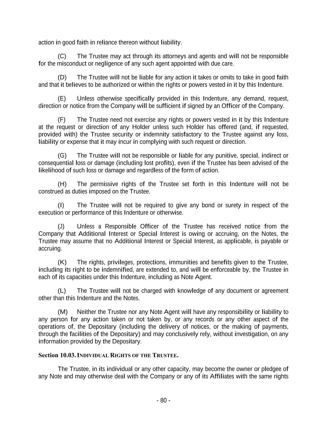 - 80 - action in good faith in reliance thereon without liability. (C) The Trustee may act through its attorneys and agents and will not be responsible for the misconduct or negligence of any such agent appointed with due care. (D) The Trustee will not be liable for any action it takes or omits to take in good faith and that it believes to be authorized or within the rights or powers vested in it by this Indenture. (E) Unless otherwise specifically provided in this Indenture, any demand, request, direction or notice from the Company will be sufficient if signed by an Officer of the Company. (F) The Trustee need not exercise any rights or powers vested in it by this Indenture at the request or direction of any Holder unless such Holder has offered (and, if requested, provided with) the Trustee security or indemnity satisfactory to the Trustee against any loss, liability or expense that it may incur in complying with such request or direction. (G) The Trustee will not be responsible or liable for any punitive, special, indirect or consequential loss or damage (including lost profits), even if the Trustee has been advised of the likelihood of such loss or damage and regardless of the form of action. (H) The permissive rights of the Trustee set forth in this Indenture will not be construed as duties imposed on the Trustee. (I) The Trustee will not be required to give any bond or surety in respect of the execution or performance of this Indenture or otherwise. (J) Unless a Responsible Officer of the Trustee has received notice from the Company that Additional Interest or Special Interest is owing or accruing, on the Notes, the Trustee may assume that no Additional Interest or Special Interest, as applicable, is payable or accruing. (K) The rights, privileges, protections, immunities and benefits given to the Trustee, including its right to be indemnified, are extended to, and will be enforceable by, the Trustee in each of its capacities under this Indenture, including as Note Agent. (L) The Trustee will not be charged with knowledge of any document or agreement other than this Indenture and the Notes. (M) Neither the Trustee nor any Note Agent will have any responsibility or liability to any person for any action taken or not taken by, or any records or any other aspect of the operations of, the Depositary (including the delivery of notices, or the making of payments, through the facilities of the Depositary) and may conclusively rely, without investigation, on any information provided by the Depositary. Section 10.03. INDIVIDUAL RIGHTS OF THE TRUSTEE. The Trustee, in its individual or any other capacity, may become the owner or pledgee of any Note and may otherwise deal with the Company or any of its Affiliates with the same rights