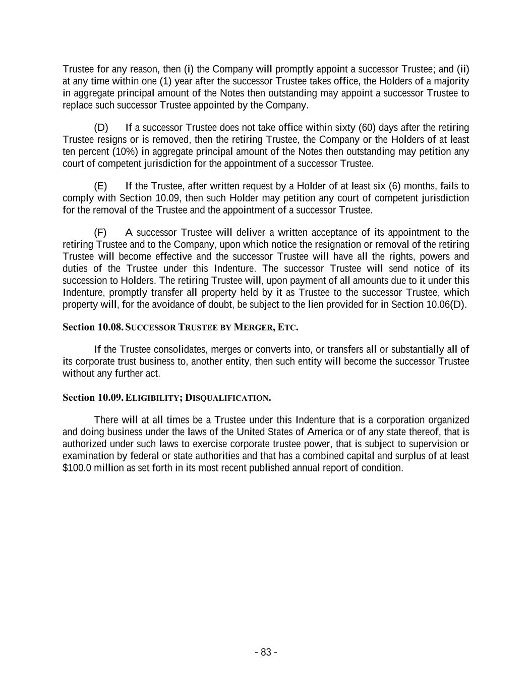- 83 - Trustee for any reason, then (i) the Company will promptly appoint a successor Trustee; and (ii) at any time within one (1) year after the successor Trustee takes office, the Holders of a majority in aggregate principal amount of the Notes then outstanding may appoint a successor Trustee to replace such successor Trustee appointed by the Company. (D) If a successor Trustee does not take office within sixty (60) days after the retiring Trustee resigns or is removed, then the retiring Trustee, the Company or the Holders of at least ten percent (10%) in aggregate principal amount of the Notes then outstanding may petition any court of competent jurisdiction for the appointment of a successor Trustee. (E) If the Trustee, after written request by a Holder of at least six (6) months, fails to comply with Section 10.09, then such Holder may petition any court of competent jurisdiction for the removal of the Trustee and the appointment of a successor Trustee. (F) A successor Trustee will deliver a written acceptance of its appointment to the retiring Trustee and to the Company, upon which notice the resignation or removal of the retiring Trustee will become effective and the successor Trustee will have all the rights, powers and duties of the Trustee under this Indenture. The successor Trustee will send notice of its succession to Holders. The retiring Trustee will, upon payment of all amounts due to it under this Indenture, promptly transfer all property held by it as Trustee to the successor Trustee, which property will, for the avoidance of doubt, be subject to the lien provided for in Section 10.06(D). Section 10.08. SUCCESSOR TRUSTEE BY MERGER, ETC. If the Trustee consolidates, merges or converts into, or transfers all or substantially all of its corporate trust business to, another entity, then such entity will become the successor Trustee without any further act. Section 10.09. ELIGIBILITY; DISQUALIFICATION. There will at all times be a Trustee under this Indenture that is a corporation organized and doing business under the laws of the United States of America or of any state thereof, that is authorized under such laws to exercise corporate trustee power, that is subject to supervision or examination by federal or state authorities and that has a combined capital and surplus of at least $100.0 million as set forth in its most recent published annual report of condition.
