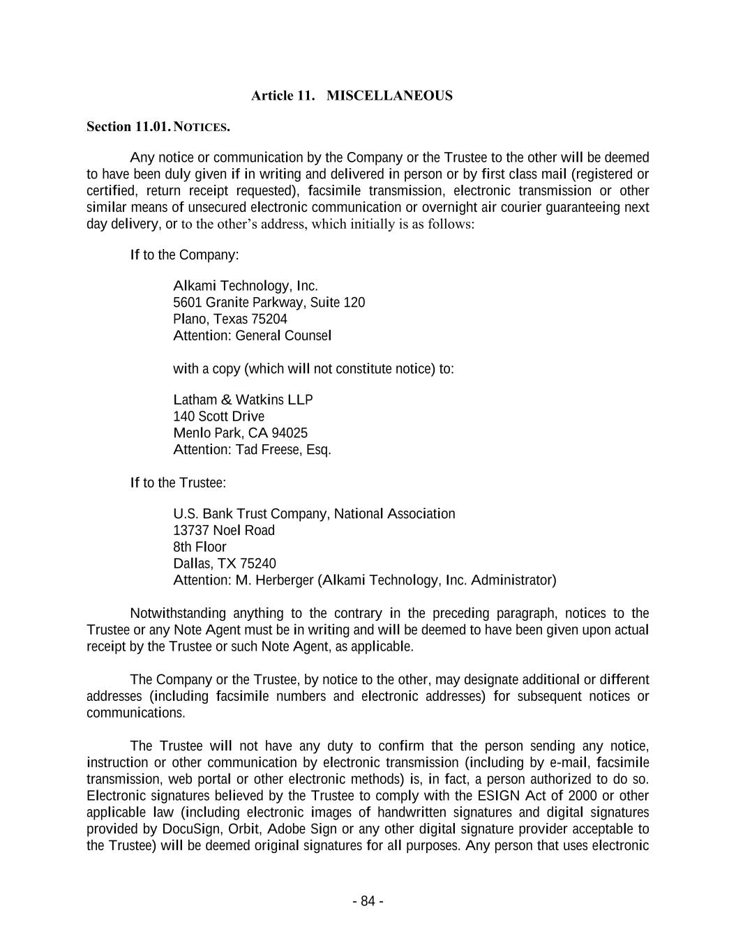 - 84 - Article 11. MISCELLANEOUS Section 11.01. NOTICES. Any notice or communication by the Company or the Trustee to the other will be deemed to have been duly given if in writing and delivered in person or by first class mail (registered or certified, return receipt requested), facsimile transmission, electronic transmission or other similar means of unsecured electronic communication or overnight air courier guaranteeing next day delivery, or to the other’s address, which initially is as follows: If to the Company: Alkami Technology, Inc. 5601 Granite Parkway, Suite 120 Plano, Texas 75204 Attention: General Counsel with a copy (which will not constitute notice) to: Latham & Watkins LLP 140 Scott Drive Menlo Park, CA 94025 Attention: Tad Freese, Esq. If to the Trustee: U.S. Bank Trust Company, National Association 13737 Noel Road 8th Floor Dallas, TX 75240 Attention: M. Herberger (Alkami Technology, Inc. Administrator) Notwithstanding anything to the contrary in the preceding paragraph, notices to the Trustee or any Note Agent must be in writing and will be deemed to have been given upon actual receipt by the Trustee or such Note Agent, as applicable. The Company or the Trustee, by notice to the other, may designate additional or different addresses (including facsimile numbers and electronic addresses) for subsequent notices or communications. The Trustee will not have any duty to confirm that the person sending any notice, instruction or other communication by electronic transmission (including by e-mail, facsimile transmission, web portal or other electronic methods) is, in fact, a person authorized to do so. Electronic signatures believed by the Trustee to comply with the ESIGN Act of 2000 or other applicable law (including electronic images of handwritten signatures and digital signatures provided by DocuSign, Orbit, Adobe Sign or any other digital signature provider acceptable to the Trustee) will be deemed original signatures for all purposes. Any person that uses electronic