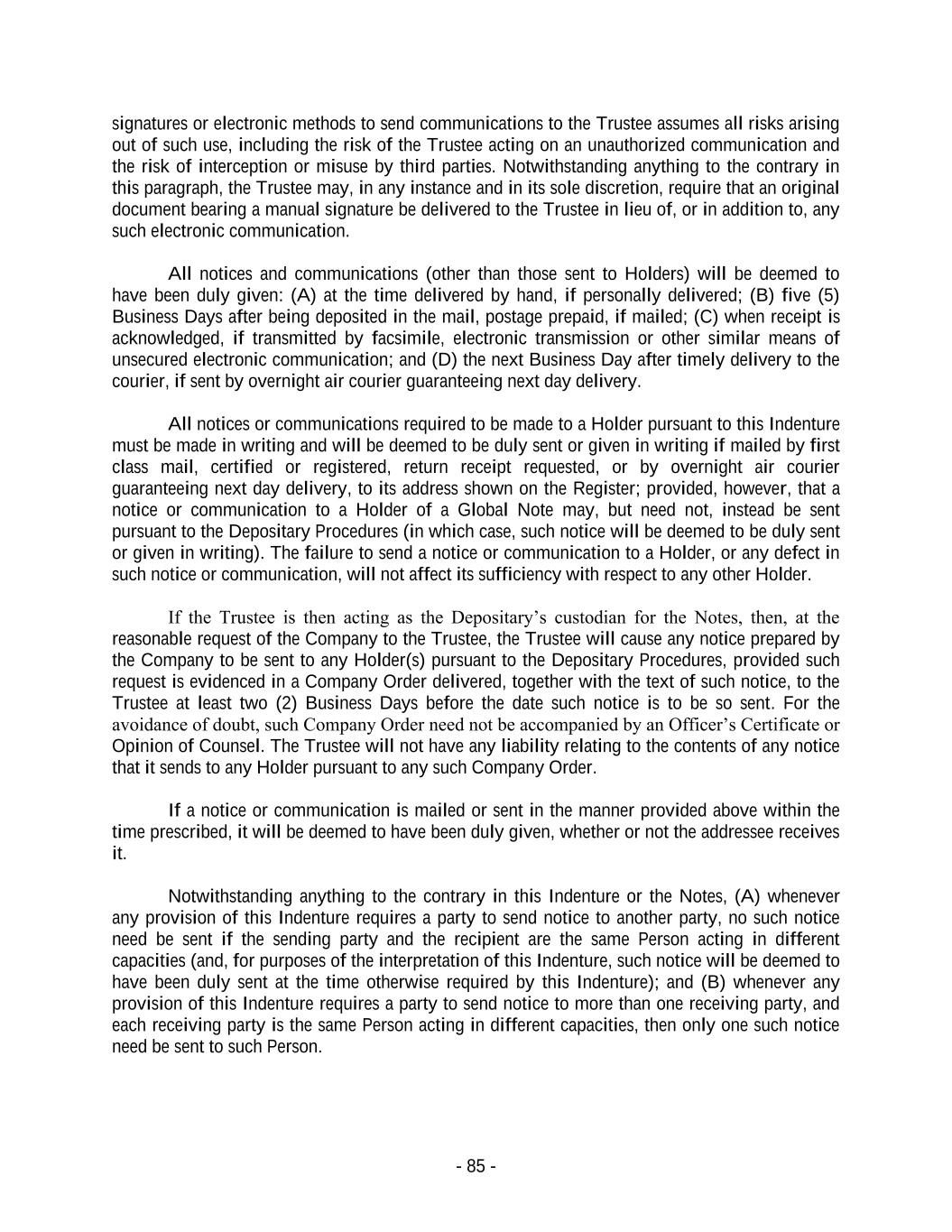 - 85 - signatures or electronic methods to send communications to the Trustee assumes all risks arising out of such use, including the risk of the Trustee acting on an unauthorized communication and the risk of interception or misuse by third parties. Notwithstanding anything to the contrary in this paragraph, the Trustee may, in any instance and in its sole discretion, require that an original document bearing a manual signature be delivered to the Trustee in lieu of, or in addition to, any such electronic communication. All notices and communications (other than those sent to Holders) will be deemed to have been duly given: (A) at the time delivered by hand, if personally delivered; (B) five (5) Business Days after being deposited in the mail, postage prepaid, if mailed; (C) when receipt is acknowledged, if transmitted by facsimile, electronic transmission or other similar means of unsecured electronic communication; and (D) the next Business Day after timely delivery to the courier, if sent by overnight air courier guaranteeing next day delivery. All notices or communications required to be made to a Holder pursuant to this Indenture must be made in writing and will be deemed to be duly sent or given in writing if mailed by first class mail, certified or registered, return receipt requested, or by overnight air courier guaranteeing next day delivery, to its address shown on the Register; provided, however, that a notice or communication to a Holder of a Global Note may, but need not, instead be sent pursuant to the Depositary Procedures (in which case, such notice will be deemed to be duly sent or given in writing). The failure to send a notice or communication to a Holder, or any defect in such notice or communication, will not affect its sufficiency with respect to any other Holder. If the Trustee is then acting as the Depositary’s custodian for the Notes, then, at the reasonable request of the Company to the Trustee, the Trustee will cause any notice prepared by the Company to be sent to any Holder(s) pursuant to the Depositary Procedures, provided such request is evidenced in a Company Order delivered, together with the text of such notice, to the Trustee at least two (2) Business Days before the date such notice is to be so sent. For the avoidance of doubt, such Company Order need not be accompanied by an Officer’s Certificate or Opinion of Counsel. The Trustee will not have any liability relating to the contents of any notice that it sends to any Holder pursuant to any such Company Order. If a notice or communication is mailed or sent in the manner provided above within the time prescribed, it will be deemed to have been duly given, whether or not the addressee receives it. Notwithstanding anything to the contrary in this Indenture or the Notes, (A) whenever any provision of this Indenture requires a party to send notice to another party, no such notice need be sent if the sending party and the recipient are the same Person acting in different capacities (and, for purposes of the interpretation of this Indenture, such notice will be deemed to have been duly sent at the time otherwise required by this Indenture); and (B) whenever any provision of this Indenture requires a party to send notice to more than one receiving party, and each receiving party is the same Person acting in different capacities, then only one such notice need be sent to such Person.