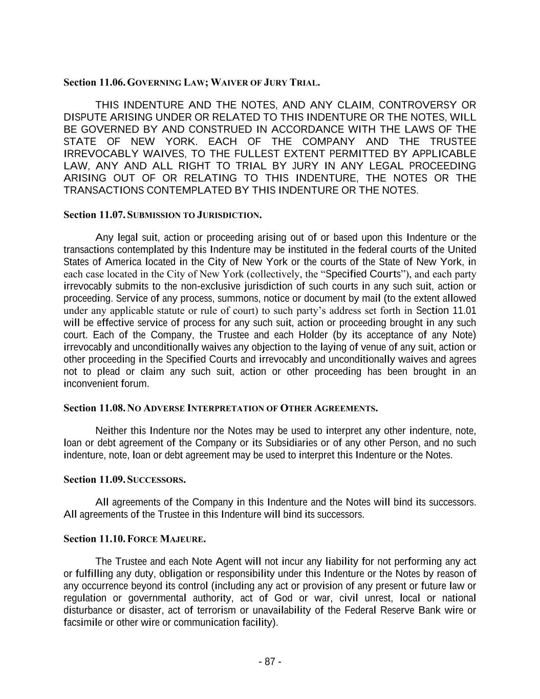 - 87 - Section 11.06. GOVERNING LAW; WAIVER OF JURY TRIAL. THIS INDENTURE AND THE NOTES, AND ANY CLAIM, CONTROVERSY OR DISPUTE ARISING UNDER OR RELATED TO THIS INDENTURE OR THE NOTES, WILL BE GOVERNED BY AND CONSTRUED IN ACCORDANCE WITH THE LAWS OF THE STATE OF NEW YORK. EACH OF THE COMPANY AND THE TRUSTEE IRREVOCABLY WAIVES, TO THE FULLEST EXTENT PERMITTED BY APPLICABLE LAW, ANY AND ALL RIGHT TO TRIAL BY JURY IN ANY LEGAL PROCEEDING ARISING OUT OF OR RELATING TO THIS INDENTURE, THE NOTES OR THE TRANSACTIONS CONTEMPLATED BY THIS INDENTURE OR THE NOTES. Section 11.07. SUBMISSION TO JURISDICTION. Any legal suit, action or proceeding arising out of or based upon this Indenture or the transactions contemplated by this Indenture may be instituted in the federal courts of the United States of America located in the City of New York or the courts of the State of New York, in each case located in the City of New York (collectively, the “Specified Courts”), and each party irrevocably submits to the non-exclusive jurisdiction of such courts in any such suit, action or proceeding. Service of any process, summons, notice or document by mail (to the extent allowed under any applicable statute or rule of court) to such party’s address set forth in Section 11.01 will be effective service of process for any such suit, action or proceeding brought in any such court. Each of the Company, the Trustee and each Holder (by its acceptance of any Note) irrevocably and unconditionally waives any objection to the laying of venue of any suit, action or other proceeding in the Specified Courts and irrevocably and unconditionally waives and agrees not to plead or claim any such suit, action or other proceeding has been brought in an inconvenient forum. Section 11.08. NO ADVERSE INTERPRETATION OF OTHER AGREEMENTS. Neither this Indenture nor the Notes may be used to interpret any other indenture, note, loan or debt agreement of the Company or its Subsidiaries or of any other Person, and no such indenture, note, loan or debt agreement may be used to interpret this Indenture or the Notes. Section 11.09. SUCCESSORS. All agreements of the Company in this Indenture and the Notes will bind its successors. All agreements of the Trustee in this Indenture will bind its successors. Section 11.10. FORCE MAJEURE. The Trustee and each Note Agent will not incur any liability for not performing any act or fulfilling any duty, obligation or responsibility under this Indenture or the Notes by reason of any occurrence beyond its control (including any act or provision of any present or future law or regulation or governmental authority, act of God or war, civil unrest, local or national disturbance or disaster, act of terrorism or unavailability of the Federal Reserve Bank wire or facsimile or other wire or communication facility).