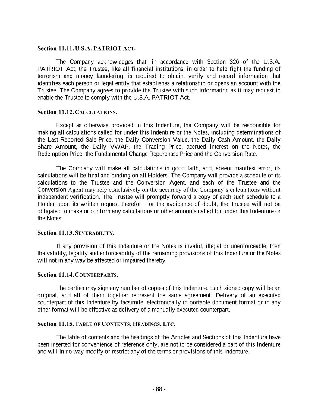- 88 - Section 11.11. U.S.A. PATRIOT ACT. The Company acknowledges that, in accordance with Section 326 of the U.S.A. PATRIOT Act, the Trustee, like all financial institutions, in order to help fight the funding of terrorism and money laundering, is required to obtain, verify and record information that identifies each person or legal entity that establishes a relationship or opens an account with the Trustee. The Company agrees to provide the Trustee with such information as it may request to enable the Trustee to comply with the U.S.A. PATRIOT Act. Section 11.12. CALCULATIONS. Except as otherwise provided in this Indenture, the Company will be responsible for making all calculations called for under this Indenture or the Notes, including determinations of the Last Reported Sale Price, the Daily Conversion Value, the Daily Cash Amount, the Daily Share Amount, the Daily VWAP, the Trading Price, accrued interest on the Notes, the Redemption Price, the Fundamental Change Repurchase Price and the Conversion Rate. The Company will make all calculations in good faith, and, absent manifest error, its calculations will be final and binding on all Holders. The Company will provide a schedule of its calculations to the Trustee and the Conversion Agent, and each of the Trustee and the Conversion Agent may rely conclusively on the accuracy of the Company’s calculations without independent verification. The Trustee will promptly forward a copy of each such schedule to a Holder upon its written request therefor. For the avoidance of doubt, the Trustee will not be obligated to make or confirm any calculations or other amounts called for under this Indenture or the Notes. Section 11.13. SEVERABILITY. If any provision of this Indenture or the Notes is invalid, illegal or unenforceable, then the validity, legality and enforceability of the remaining provisions of this Indenture or the Notes will not in any way be affected or impaired thereby. Section 11.14. COUNTERPARTS. The parties may sign any number of copies of this Indenture. Each signed copy will be an original, and all of them together represent the same agreement. Delivery of an executed counterpart of this Indenture by facsimile, electronically in portable document format or in any other format will be effective as delivery of a manually executed counterpart. Section 11.15. TABLE OF CONTENTS, HEADINGS, ETC. The table of contents and the headings of the Articles and Sections of this Indenture have been inserted for convenience of reference only, are not to be considered a part of this Indenture and will in no way modify or restrict any of the terms or provisions of this Indenture.
