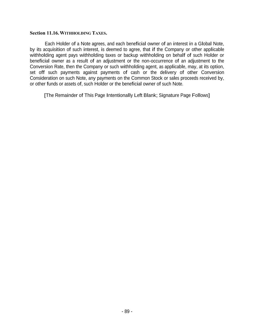 - 89 - Section 11.16. WITHHOLDING TAXES. Each Holder of a Note agrees, and each beneficial owner of an interest in a Global Note, by its acquisition of such interest, is deemed to agree, that if the Company or other applicable withholding agent pays withholding taxes or backup withholding on behalf of such Holder or beneficial owner as a result of an adjustment or the non-occurrence of an adjustment to the Conversion Rate, then the Company or such withholding agent, as applicable, may, at its option, set off such payments against payments of cash or the delivery of other Conversion Consideration on such Note, any payments on the Common Stock or sales proceeds received by, or other funds or assets of, such Holder or the beneficial owner of such Note. [The Remainder of This Page Intentionally Left Blank; Signature Page Follows]
