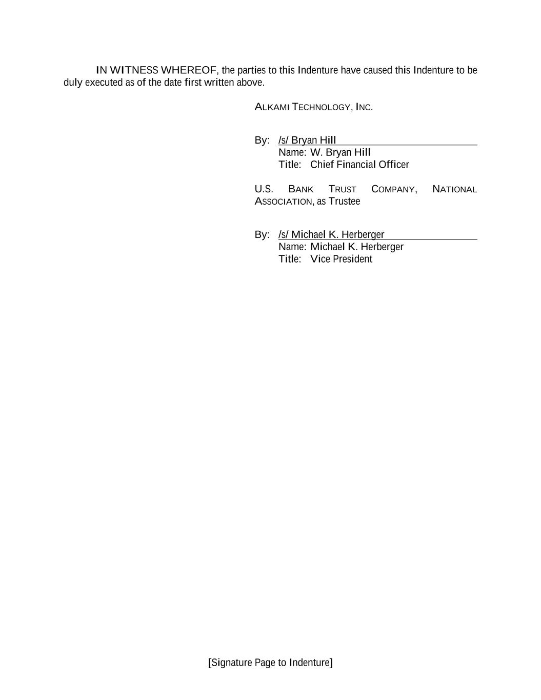 [Signature Page to Indenture] IN WITNESS WHEREOF, the parties to this Indenture have caused this Indenture to be duly executed as of the date first written above. ALKAMI TECHNOLOGY, INC. By: /s/ Bryan Hill Name: W. Bryan Hill Title: Chief Financial Officer U.S. BANK TRUST COMPANY, NATIONAL ASSOCIATION, as Trustee By: /s/ Michael K. Herberger Name: Michael K. Herberger Title: Vice President