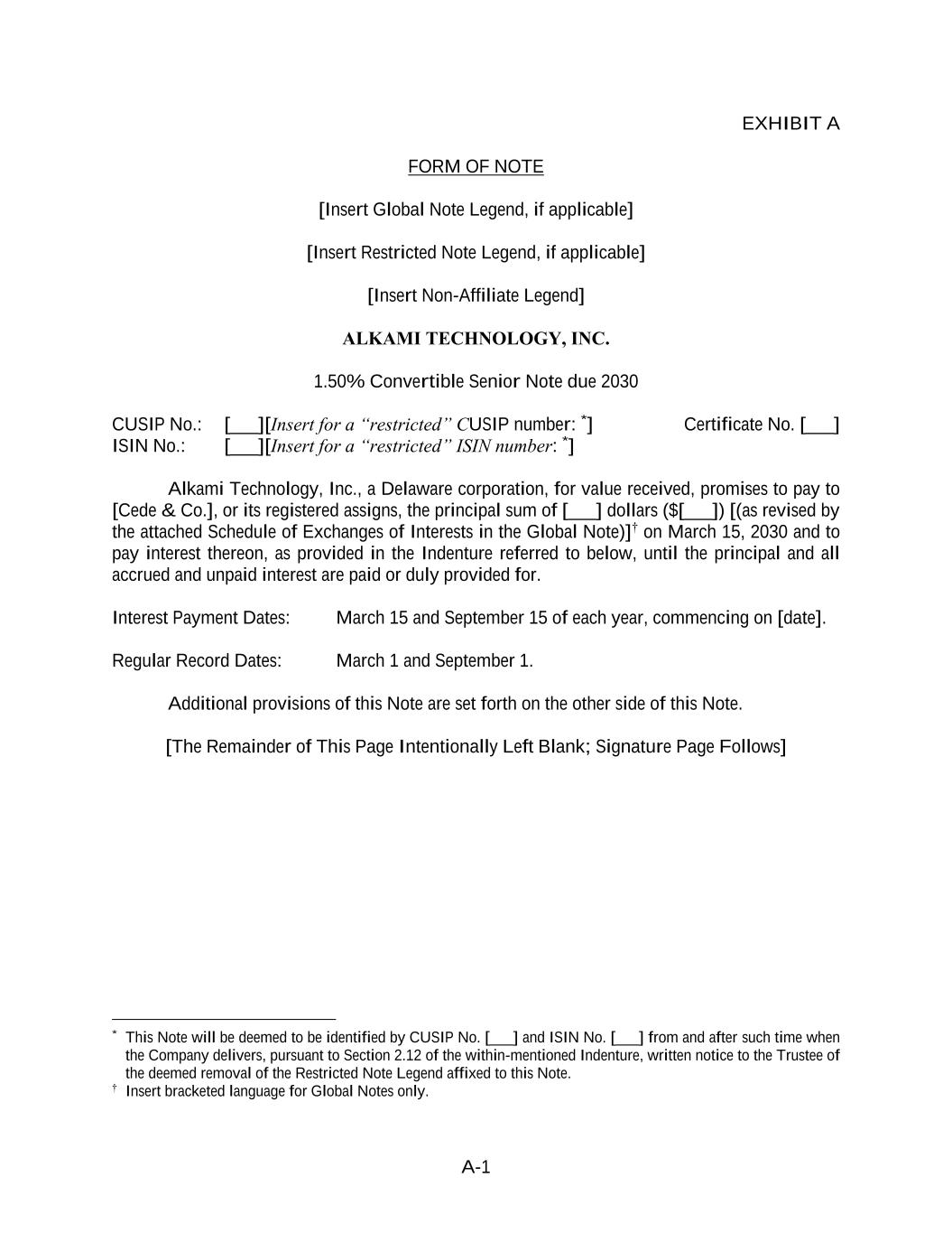 A-1 EXHIBIT A FORM OF NOTE [Insert Global Note Legend, if applicable] [Insert Restricted Note Legend, if applicable] [Insert Non-Affiliate Legend] ALKAMI TECHNOLOGY, INC. 1.50% Convertible Senior Note due 2030 CUSIP No.: [___][Insert for a “restricted” CUSIP number: *] Certificate No. [___] ISIN No.: [___][Insert for a “restricted” ISIN number: *] Alkami Technology, Inc., a Delaware corporation, for value received, promises to pay to [Cede & Co.], or its registered assigns, the principal sum of [___] dollars ($[___]) [(as revised by the attached Schedule of Exchanges of Interests in the Global Note)]† on March 15, 2030 and to pay interest thereon, as provided in the Indenture referred to below, until the principal and all accrued and unpaid interest are paid or duly provided for. Interest Payment Dates: March 15 and September 15 of each year, commencing on [date]. Regular Record Dates: March 1 and September 1. Additional provisions of this Note are set forth on the other side of this Note. [The Remainder of This Page Intentionally Left Blank; Signature Page Follows] * This Note will be deemed to be identified by CUSIP No. [___] and ISIN No. [___] from and after such time when the Company delivers, pursuant to Section 2.12 of the within-mentioned Indenture, written notice to the Trustee of the deemed removal of the Restricted Note Legend affixed to this Note. † Insert bracketed language for Global Notes only.