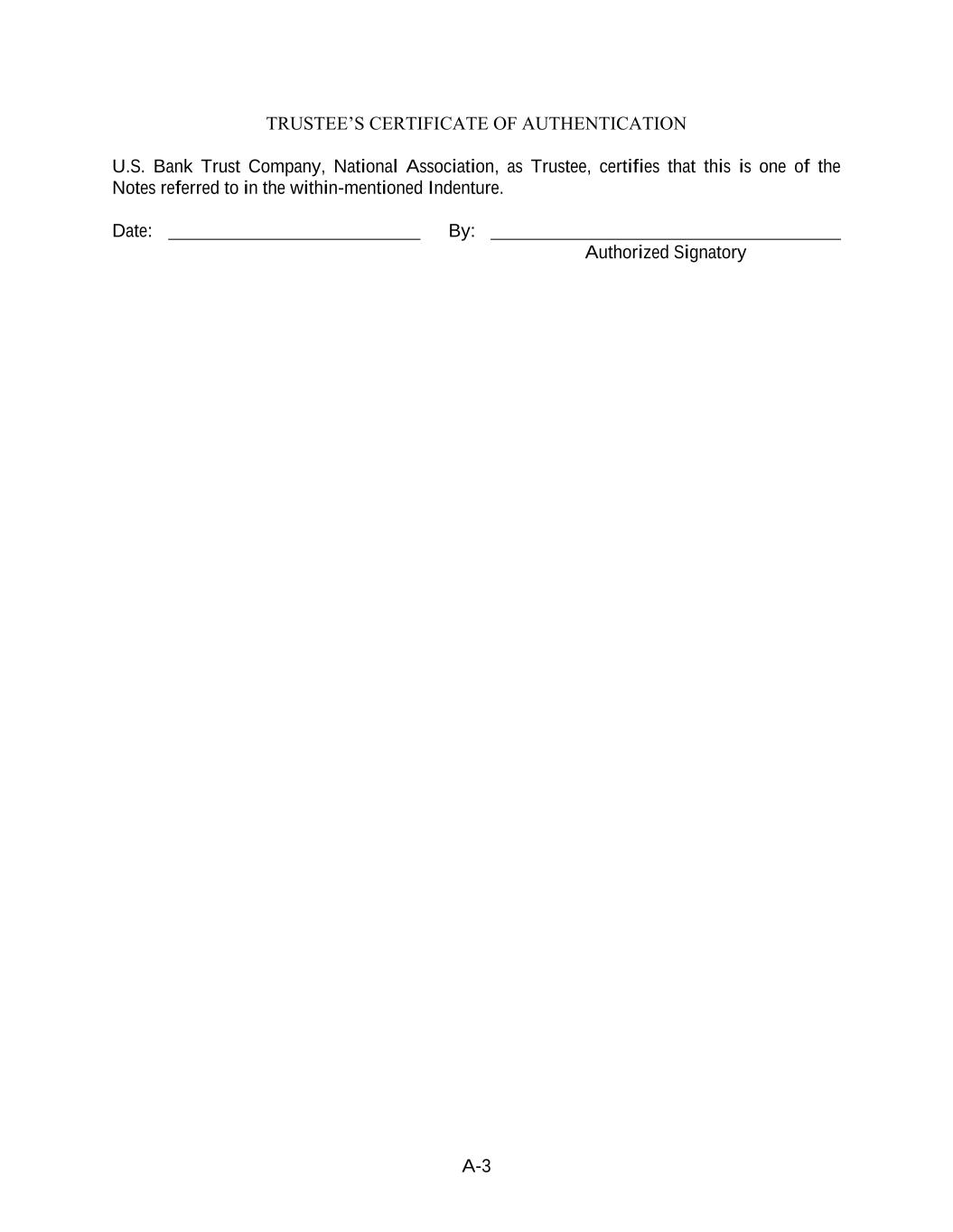 A-3 TRUSTEE’S CERTIFICATE OF AUTHENTICATION U.S. Bank Trust Company, National Association, as Trustee, certifies that this is one of the Notes referred to in the within-mentioned Indenture. Date: By: Authorized Signatory