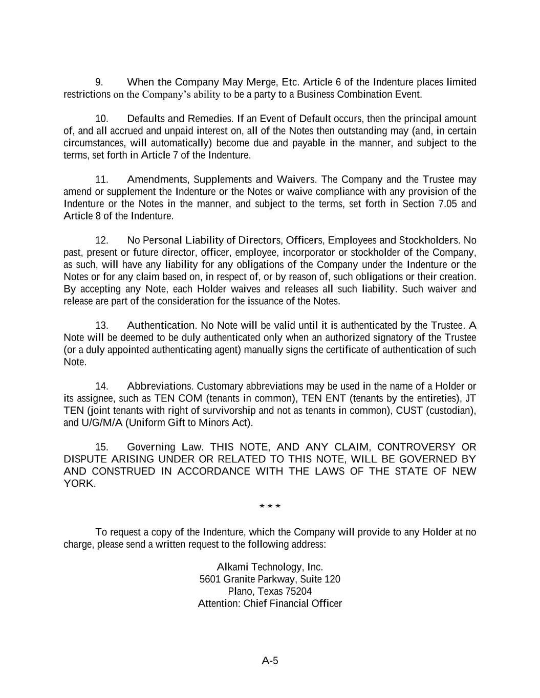 A-5 9. When the Company May Merge, Etc. Article 6 of the Indenture places limited restrictions on the Company’s ability to be a party to a Business Combination Event. 10. Defaults and Remedies. If an Event of Default occurs, then the principal amount of, and all accrued and unpaid interest on, all of the Notes then outstanding may (and, in certain circumstances, will automatically) become due and payable in the manner, and subject to the terms, set forth in Article 7 of the Indenture. 11. Amendments, Supplements and Waivers. The Company and the Trustee may amend or supplement the Indenture or the Notes or waive compliance with any provision of the Indenture or the Notes in the manner, and subject to the terms, set forth in Section 7.05 and Article 8 of the Indenture. 12. No Personal Liability of Directors, Officers, Employees and Stockholders. No past, present or future director, officer, employee, incorporator or stockholder of the Company, as such, will have any liability for any obligations of the Company under the Indenture or the Notes or for any claim based on, in respect of, or by reason of, such obligations or their creation. By accepting any Note, each Holder waives and releases all such liability. Such waiver and release are part of the consideration for the issuance of the Notes. 13. Authentication. No Note will be valid until it is authenticated by the Trustee. A Note will be deemed to be duly authenticated only when an authorized signatory of the Trustee (or a duly appointed authenticating agent) manually signs the certificate of authentication of such Note. 14. Abbreviations. Customary abbreviations may be used in the name of a Holder or its assignee, such as TEN COM (tenants in common), TEN ENT (tenants by the entireties), JT TEN (joint tenants with right of survivorship and not as tenants in common), CUST (custodian), and U/G/M/A (Uniform Gift to Minors Act). 15. Governing Law. THIS NOTE, AND ANY CLAIM, CONTROVERSY OR DISPUTE ARISING UNDER OR RELATED TO THIS NOTE, WILL BE GOVERNED BY AND CONSTRUED IN ACCORDANCE WITH THE LAWS OF THE STATE OF NEW YORK. * * * To request a copy of the Indenture, which the Company will provide to any Holder at no charge, please send a written request to the following address: Alkami Technology, Inc. 5601 Granite Parkway, Suite 120 Plano, Texas 75204 Attention: Chief Financial Officer