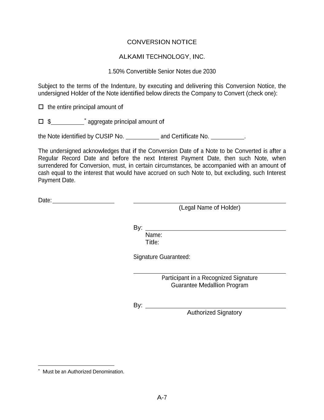 A-7 CONVERSION NOTICE ALKAMI TECHNOLOGY, INC. 1.50% Convertible Senior Notes due 2030 Subject to the terms of the Indenture, by executing and delivering this Conversion Notice, the undersigned Holder of the Note identified below directs the Company to Convert (check one): the entire principal amount of $ * aggregate principal amount of the Note identified by CUSIP No. and Certificate No. . The undersigned acknowledges that if the Conversion Date of a Note to be Converted is after a Regular Record Date and before the next Interest Payment Date, then such Note, when surrendered for Conversion, must, in certain circumstances, be accompanied with an amount of cash equal to the interest that would have accrued on such Note to, but excluding, such Interest Payment Date. Date: (Legal Name of Holder) By: Name: Title: Signature Guaranteed: Participant in a Recognized Signature Guarantee Medallion Program By: Authorized Signatory * Must be an Authorized Denomination.