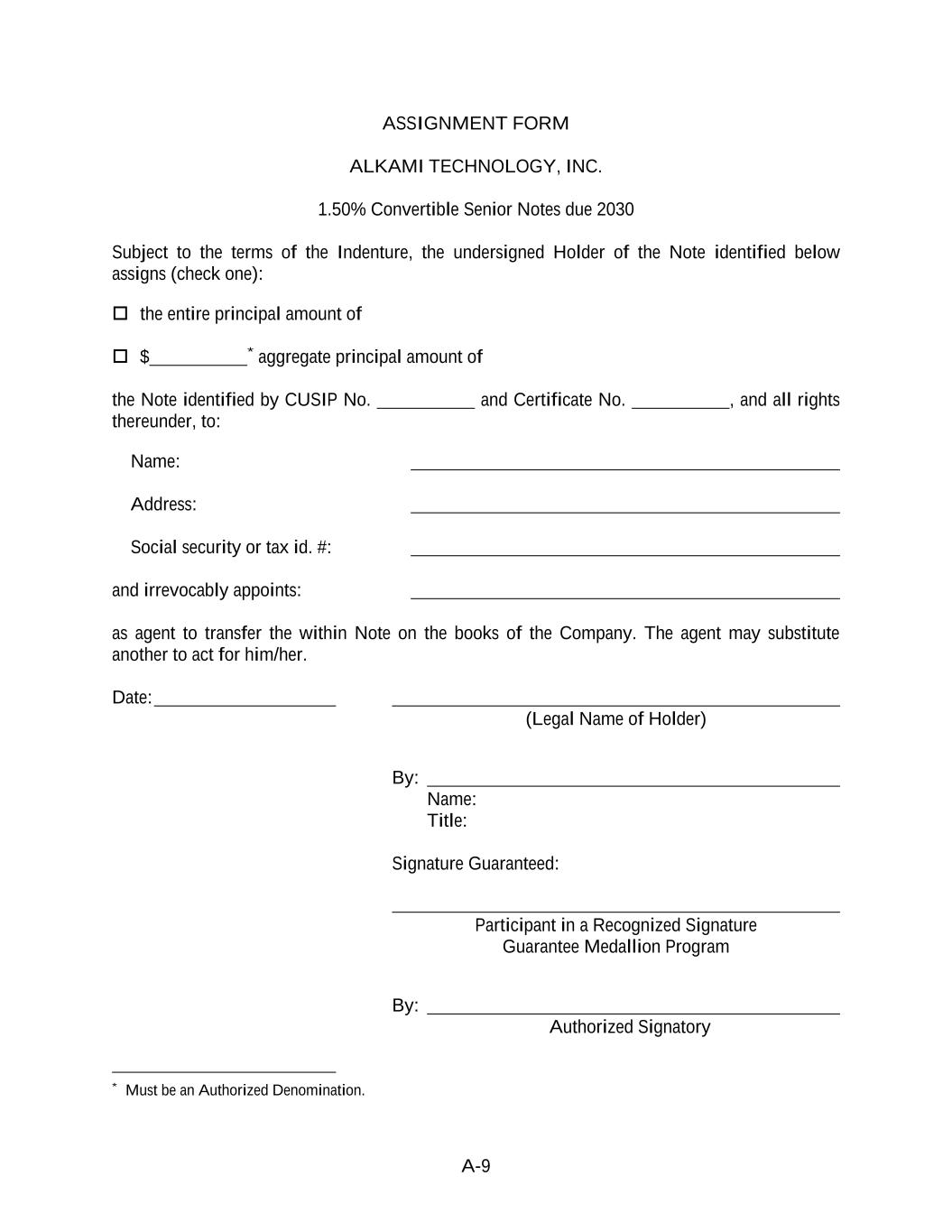 A-9 ASSIGNMENT FORM ALKAMI TECHNOLOGY, INC. 1.50% Convertible Senior Notes due 2030 Subject to the terms of the Indenture, the undersigned Holder of the Note identified below assigns (check one): the entire principal amount of $ * aggregate principal amount of the Note identified by CUSIP No. and Certificate No. , and all rights thereunder, to: Name: Address: Social security or tax id. #: and irrevocably appoints: as agent to transfer the within Note on the books of the Company. The agent may substitute another to act for him/her. Date: (Legal Name of Holder) By: Name: Title: Signature Guaranteed: Participant in a Recognized Signature Guarantee Medallion Program By: Authorized Signatory * Must be an Authorized Denomination.