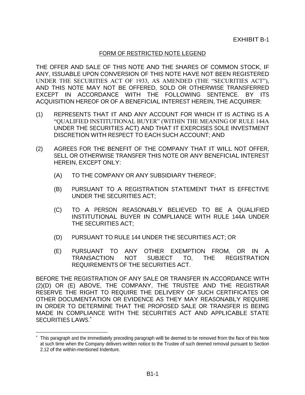 B1-1 EXHIBIT B-1 FORM OF RESTRICTED NOTE LEGEND THE OFFER AND SALE OF THIS NOTE AND THE SHARES OF COMMON STOCK, IF ANY, ISSUABLE UPON CONVERSION OF THIS NOTE HAVE NOT BEEN REGISTERED UNDER THE SECURITIES ACT OF 1933, AS AMENDED (THE “SECURITIES ACT”), AND THIS NOTE MAY NOT BE OFFERED, SOLD OR OTHERWISE TRANSFERRED EXCEPT IN ACCORDANCE WITH THE FOLLOWING SENTENCE. BY ITS ACQUISITION HEREOF OR OF A BENEFICIAL INTEREST HEREIN, THE ACQUIRER: (1) REPRESENTS THAT IT AND ANY ACCOUNT FOR WHICH IT IS ACTING IS A “QUALIFIED INSTITUTIONAL BUYER” (WITHIN THE MEANING OF RULE 144A UNDER THE SECURITIES ACT) AND THAT IT EXERCISES SOLE INVESTMENT DISCRETION WITH RESPECT TO EACH SUCH ACCOUNT; AND (2) AGREES FOR THE BENEFIT OF THE COMPANY THAT IT WILL NOT OFFER, SELL OR OTHERWISE TRANSFER THIS NOTE OR ANY BENEFICIAL INTEREST HEREIN, EXCEPT ONLY: (A) TO THE COMPANY OR ANY SUBSIDIARY THEREOF; (B) PURSUANT TO A REGISTRATION STATEMENT THAT IS EFFECTIVE UNDER THE SECURITIES ACT; (C) TO A PERSON REASONABLY BELIEVED TO BE A QUALIFIED INSTITUTIONAL BUYER IN COMPLIANCE WITH RULE 144A UNDER THE SECURITIES ACT; (D) PURSUANT TO RULE 144 UNDER THE SECURITIES ACT; OR (E) PURSUANT TO ANY OTHER EXEMPTION FROM, OR IN A TRANSACTION NOT SUBJECT TO, THE REGISTRATION REQUIREMENTS OF THE SECURITIES ACT. BEFORE THE REGISTRATION OF ANY SALE OR TRANSFER IN ACCORDANCE WITH (2)(D) OR (E) ABOVE, THE COMPANY, THE TRUSTEE AND THE REGISTRAR RESERVE THE RIGHT TO REQUIRE THE DELIVERY OF SUCH CERTIFICATES OR OTHER DOCUMENTATION OR EVIDENCE AS THEY MAY REASONABLY REQUIRE IN ORDER TO DETERMINE THAT THE PROPOSED SALE OR TRANSFER IS BEING MADE IN COMPLIANCE WITH THE SECURITIES ACT AND APPLICABLE STATE SECURITIES LAWS.* * This paragraph and the immediately preceding paragraph will be deemed to be removed from the face of this Note at such time when the Company delivers written notice to the Trustee of such deemed removal pursuant to Section 2.12 of the within-mentioned Indenture.