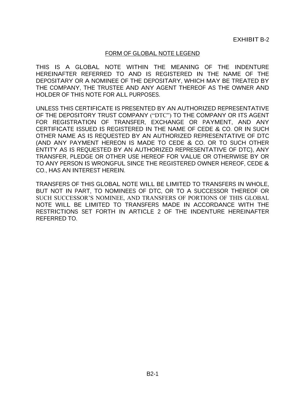 B2-1 EXHIBIT B-2 FORM OF GLOBAL NOTE LEGEND THIS IS A GLOBAL NOTE WITHIN THE MEANING OF THE INDENTURE HEREINAFTER REFERRED TO AND IS REGISTERED IN THE NAME OF THE DEPOSITARY OR A NOMINEE OF THE DEPOSITARY, WHICH MAY BE TREATED BY THE COMPANY, THE TRUSTEE AND ANY AGENT THEREOF AS THE OWNER AND HOLDER OF THIS NOTE FOR ALL PURPOSES. UNLESS THIS CERTIFICATE IS PRESENTED BY AN AUTHORIZED REPRESENTATIVE OF THE DEPOSITORY TRUST COMPANY (“DTC”) TO THE COMPANY OR ITS AGENT FOR REGISTRATION OF TRANSFER, EXCHANGE OR PAYMENT, AND ANY CERTIFICATE ISSUED IS REGISTERED IN THE NAME OF CEDE & CO. OR IN SUCH OTHER NAME AS IS REQUESTED BY AN AUTHORIZED REPRESENTATIVE OF DTC (AND ANY PAYMENT HEREON IS MADE TO CEDE & CO. OR TO SUCH OTHER ENTITY AS IS REQUESTED BY AN AUTHORIZED REPRESENTATIVE OF DTC), ANY TRANSFER, PLEDGE OR OTHER USE HEREOF FOR VALUE OR OTHERWISE BY OR TO ANY PERSON IS WRONGFUL SINCE THE REGISTERED OWNER HEREOF, CEDE & CO., HAS AN INTEREST HEREIN. TRANSFERS OF THIS GLOBAL NOTE WILL BE LIMITED TO TRANSFERS IN WHOLE, BUT NOT IN PART, TO NOMINEES OF DTC, OR TO A SUCCESSOR THEREOF OR SUCH SUCCESSOR’S NOMINEE, AND TRANSFERS OF PORTIONS OF THIS GLOBAL NOTE WILL BE LIMITED TO TRANSFERS MADE IN ACCORDANCE WITH THE RESTRICTIONS SET FORTH IN ARTICLE 2 OF THE INDENTURE HEREINAFTER REFERRED TO.
