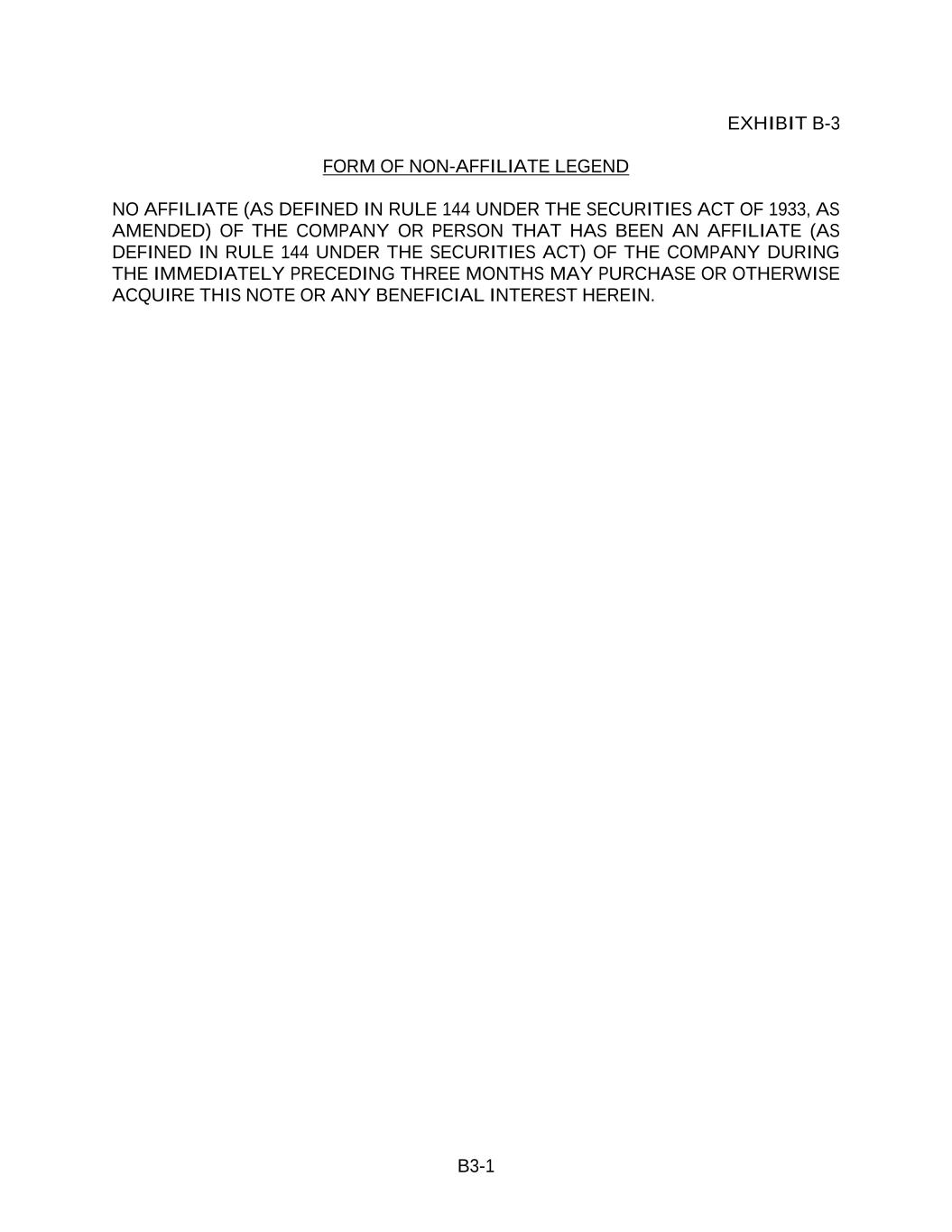 B3-1 EXHIBIT B-3 FORM OF NON-AFFILIATE LEGEND NO AFFILIATE (AS DEFINED IN RULE 144 UNDER THE SECURITIES ACT OF 1933, AS AMENDED) OF THE COMPANY OR PERSON THAT HAS BEEN AN AFFILIATE (AS DEFINED IN RULE 144 UNDER THE SECURITIES ACT) OF THE COMPANY DURING THE IMMEDIATELY PRECEDING THREE MONTHS MAY PURCHASE OR OTHERWISE ACQUIRE THIS NOTE OR ANY BENEFICIAL INTEREST HEREIN.
