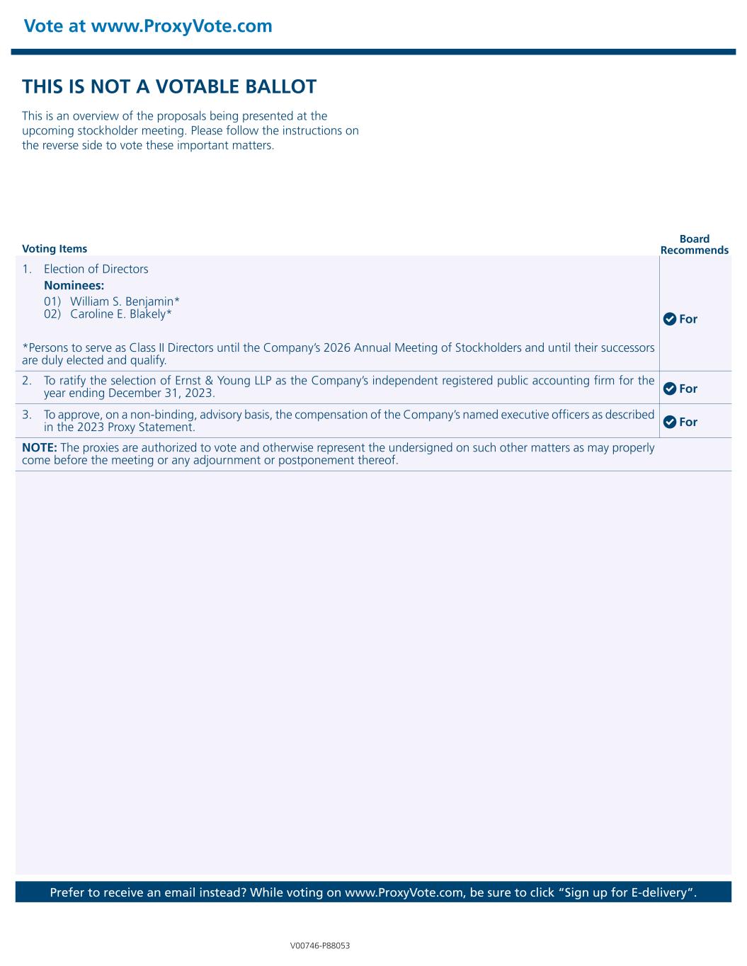 THIS IS NOT A VOTABLE BALLOT This is an overview of the proposals being presented at the upcoming stockholder meeting. Please follow the instructions on the reverse side to vote these important matters. Vote at www.ProxyVote.com Prefer to receive an email instead? While voting on www.ProxyVote.com, be sure to click “Sign up for E-delivery”. Voting Items Board Recommends V00746-P88053 01) William S. Benjamin* 02) Caroline E. Blakely* 1. Election of Directors Nominees: *Persons to serve as Class II Directors until the Company’s 2026 Annual Meeting of Stockholders and until their successors are duly elected and qualify. 2. To ratify the selection of Ernst & Young LLP as the Company’s independent registered public accounting firm for the year ending December 31, 2023. 3. To approve, on a non-binding, advisory basis, the compensation of the Company’s named executive officers as described in the 2023 Proxy Statement. NOTE: The proxies are authorized to vote and otherwise represent the undersigned on such other matters as may properly come before the meeting or any adjournment or postponement thereof. For For For
