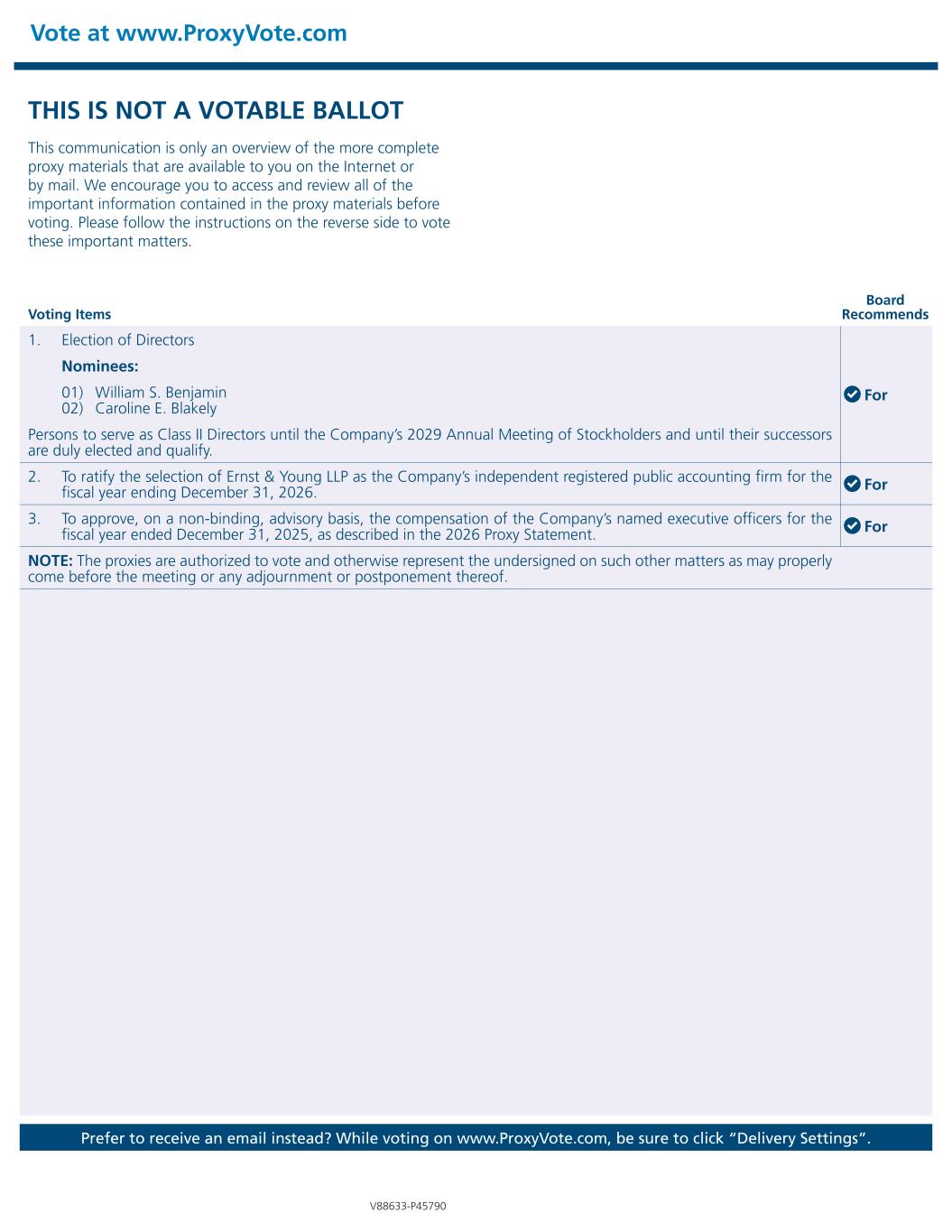 Vote at www.ProxyVote.com Prefer to receive an email instead? While voting on www.ProxyVote.com, be sure to click “Delivery Settings”. Voting Items Board Recommends V88633-P45790 THIS IS NOT A VOTABLE BALLOT This communication is only an overview of the more complete proxy materials that are available to you on the Internet or by mail. We encourage you to access and review all of the important information contained in the proxy materials before voting. Please follow the instructions on the reverse side to vote these important matters. 1. Election of Directors For Nominees: 01) William S. Benjamin 02) Caroline E. Blakely Persons to serve as Class II Directors until the Company’s 2029 Annual Meeting of Stockholders and until their successors are duly elected and qualify. 2. To ratify the selection of Ernst & Young LLP as the Company’s independent registered public accounting firm for the fiscal year ending December 31, 2026. For 3. To approve, on a non-binding, advisory basis, the compensation of the Company’s named executive officers for the fiscal year ended December 31, 2025, as described in the 2026 Proxy Statement. For NOTE: The proxies are authorized to vote and otherwise represent the undersigned on such other matters as may properly come before the meeting or any adjournment or postponement thereof.