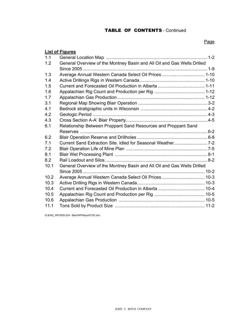 � � � �����������������������RQWLQXHG�������������������� � � 3D�H� � ������������������������ �L�������L������ ���� �HQHUDO�/RFDWLRQ�0DS������������������������������������������������������������������������������������� ��� ���� �HQHUDO�2YHUYLH��RI�WKH�0RQWQH\��DVLQ�DQG��OO�2LO�DQG��DV�:HOOV��ULOOHG� � 6LQFH������������������������������������������������������������������������������������������������������������ ��� ���� �YHUD�H��QQXDO�:HVWHUQ��DQDGD�6HOHFW�2LO�3ULFHV������������������������������������� ���� ���� �FWLYH��ULOOLQ�V�5L�V�LQ�:HVWHUQ��DQDGD������������������������������������������������������ ���� ���� �XUUHQW�DQG�)RUHFDVWHG�2LO�3URGXFWLRQ�LQ��OEHUWD���������������������������������������� ���� ���� �SSDODFKLDQ�5L���RXQW�DQG�3URGXFWLRQ�SHU�5L�������������������������������������������� ���� ���� �SSDODFKLDQ��DV�3URGXFWLRQ������������������������������������������������������������������������� ���� ���� 5H�LRQDO�0DS�6KR�LQ���ODLU�2SHUDWLRQ�������������������������������������������������������������� ���� �HGURFN�VWUDWL�UDSKLF�XQLWV�LQ�:LVFRQVLQ������������������������������������������������������������ ���� �HROR�LF�3HULRG����������������������������������������������������������������������������������������������� ��� ���� �URVV�6HFWLRQ�������ODLU�3URSHUW\������������������������������������������������������������������� ��� ���� 5HODWLRQVKLS��HW�HHQ�3URSSDQW�6DQG�5HVRXUFHV�DQG�3URSSDQW�6DQG�� � 5HVHUYHV���������������������������������������������������������������������������������������������������������� ��� ���� �ODLU�2SHUDWLRQ�5HVHUYH�DQG��ULOOKROHV��������������������������������������������������������������� ���� �XUUHQW�6DQG�(�WUDFWLRQ�6LWH��,GOHG�IRU�6HDVRQDO�:HDWKHU�������������������������������� ���� �ODLU�2SHUDWLRQ�/LIH�RI�0LQH�3ODQ�������������������������������������������������������������������� ��� ���� �ODLU�:HW�3URFHVVLQ��3ODQW������������������������������������������������������������������������������ ��� ���� 5DLO�/RDGRXW�DQG�6LORV������������������������������������������������������������������������������������ ��� ����� �HQHUDO�2YHUYLH��RI�WKH�0RQWQH\��DVLQ�DQG��OO�2LO�DQG��DV�:HOOV��ULOOHG� � 6LQFH���������������������������������������������������������������������������������������������������������� ���� ����� �YHUD�H��QQXDO�:HVWHUQ��DQDGD�6HOHFW�2LO�3ULFHV������������������������������������� ���� ����� �FWLYH��ULOOLQ��5L�V�LQ�:HVWHUQ��DQDGD�������������������������������������������������������