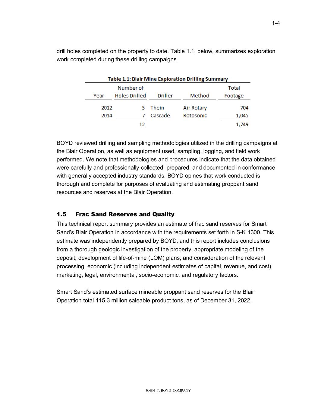 � � ���� � � � ����������������������� GULOO�KROHV�FRPSOHWHG�RQ�WKH�SURSHUW\�WR�GDWH��7DEOH������EHOR���VXPPDUL�HV�H�SORUDWLRQ� �RUN�FRPSOHWHG�GXULQJ�WKHVH�GULOOLQJ�FDPSDLJQV�� � � � %2<��UHYLH�HG�GULOOLQJ�DQG�VDPSOLQJ�PHWKRGRORJLHV�XWLOL�HG�LQ�WKH�GULOOLQJ�FDPSDLJQV�DW� WKH�%ODLU�2SHUDWLRQ��DV��HOO�DV�HTXLSPHQW�XVHG��VDPSOLQJ��ORJJLQJ��DQG�ILHOG��RUN� SHUIRUPHG��:H�QRWH�WKDW�PHWKRGRORJLHV�DQG�SURFHGXUHV�LQGLFDWH�WKDW�WKH�GDWD�REWDLQHG� �HUH�FDUHIXOO\�DQG�SURIHVVLRQDOO\�FROOHFWHG��SUHSDUHG��DQG�GRFXPHQWHG�LQ�FRQIRUPDQFH� �LWK�JHQHUDOO\�DFFHSWHG�LQGXVWU\�VWDQGDUGV��%2<��RSLQHV�WKDW��RUN�FRQGXFWHG�LV� WKRURXJK�DQG�FRPSOHWH�IRU�SXUSRVHV�RI�HYDOXDWLQJ�DQG�HVWLPDWLQJ�SURSSDQW�VDQG� UHVRXUFHV�DQG�UHVHUYHV�DW�WKH�%ODLU�2SHUDWLRQ�� � � ���� �UDF�6DQG�5�V�UY�V�DQG�4XDOL��� 7KLV�WHFKQLFDO�UHSRUW�VXPPDU\�SURYLGHV�DQ�HVWLPDWH�RI�IUDF�VDQG�UHVHUYHV�IRU�6PDUW� 6DQG�V�%ODLU�2SHUDWLRQ�LQ�DFFRUGDQFH��LWK�WKH�UHTXLUHPHQWV�VHW�IRUWK�LQ�6�.�������7KLV� HVWLPDWH��DV�LQGHSHQGHQWO\�SUHSDUHG�E\�%2<���DQG�WKLV�UHSRUW�LQFOXGHV�FRQFOXVLRQV� IURP�D�WKRURXJK�JHRORJLF�LQYHVWLJDWLRQ�RI�WKH�SURSHUW\��DSSURSULDWH�PRGHOLQJ�RI�WKH� GHSRVLW��GHYHORSPHQW�RI�OLIH�RI�PLQH��/20��SODQV��DQG�FRQVLGHUDWLRQ�RI�WKH�UHOHYDQW� SURFHVVLQJ��HFRQRPLF��LQFOXGLQJ�LQGHSHQGHQW�HVWLPDWHV�RI�FDSLWDO��UHYHQXH��DQG�FRVW��� PDUNHWLQJ��OHJDO��HQYLURQPHQWDO��VRFLR�HFRQRPLF��DQG�UHJXODWRU\�IDFWRUV��� � 6PDUW�6DQG�V�HVWLPDWHG�VXUIDFH�PLQHDEOH�SURSSDQW�VDQG�UHVHUYHV�IRU�WKH�%ODLU� 2SHUDWLRQ�WRWDO�������PLOOLRQ�VDOHDEOH�SURGXFW�WRQV��DV�RI��HFHPEHU����������� � � �