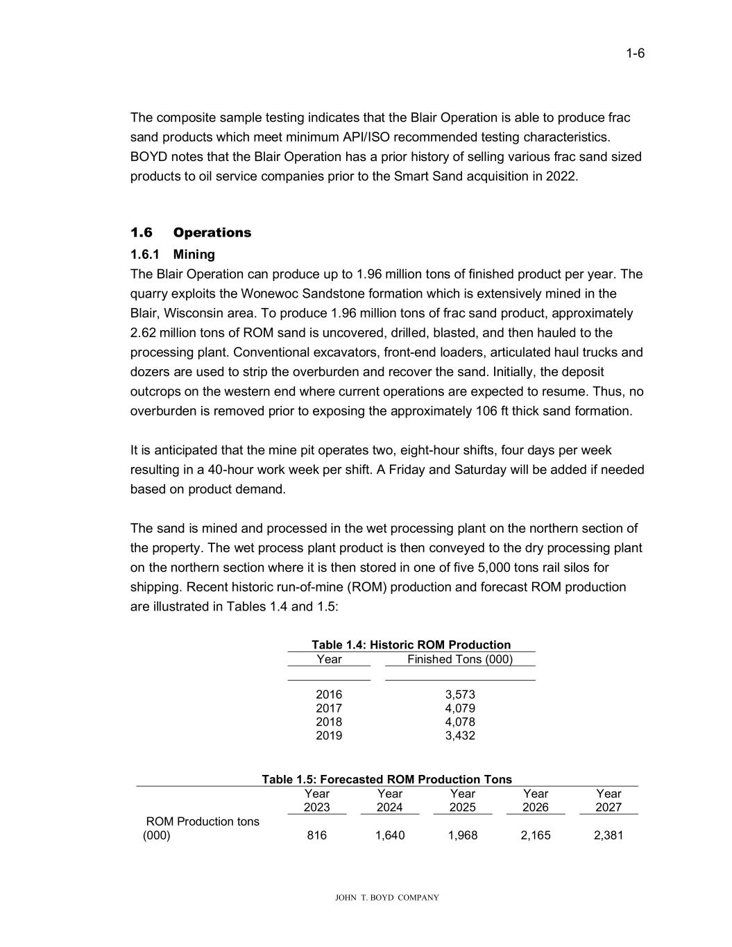 � � ���� � � � ����������������������� 7KH�FRPSRVLWH�VDPSOH�WHVWLQJ�LQGLFDWHV�WKDW�WKH�%ODLU�2SHUDWLRQ�LV�DEOH�WR�SURGXFH�IUDF� VDQG�SURGXFWV��KLFK�PHHW�PLQLPXP�$3,�,62�UHFRPPHQGHG�WHVWLQJ�FKDUDFWHULVWLFV�� %2<��QRWHV�WKDW�WKH�%ODLU�2SHUDWLRQ�KDV�D�SULRU�KLVWRU\�RI�VHOOLQJ�YDULRXV�IUDF�VDQG�VL�HG� SURGXFWV�WR�RLO�VHUYLFH�FRPSDQLHV�SULRU�WR�WKH�6PDUW�6DQG�DFTXLVLWLRQ�LQ������� � � ���� 2S�UD�LRQV�� ������ 0������ 7KH�%ODLU�2SHUDWLRQ�FDQ�SURGXFH�XS�WR������PLOOLRQ�WRQV�RI�ILQLVKHG�SURGXFW�SHU�\HDU��7KH� TXDUU\�H�SORLWV�WKH�:RQH�RF�6DQGVWRQH�IRUPDWLRQ��KLFK�LV�H�WHQVLYHO\�PLQHG�LQ�WKH� %ODLU��:LVFRQVLQ�DUHD��7R�SURGXFH������PLOOLRQ�WRQV�RI�IUDF�VDQG�SURGXFW��DSSUR�LPDWHO\� �����PLOOLRQ�WRQV�RI�520�VDQG�LV�XQFRYHUHG��GULOOHG��EODVWHG��DQG�WKHQ�KDXOHG�WR�WKH� SURFHVVLQJ�SODQW��&RQYHQWLRQDO�H�FDYDWRUV��IURQW�HQG�ORDGHUV��DUWLFXODWHG�KDXO�WUXFNV�DQG� GR�HUV�DUH�XVHG�WR�VWULS�WKH�RYHUEXUGHQ�DQG�UHFRYHU�WKH�VDQG��,QLWLDOO\��WKH�GHSRVLW� RXWFURSV�RQ�WKH��HVWHUQ�HQG��KHUH�FXUUHQW�RSHUDWLRQV�DUH�H�SHFWHG�WR�UHVXPH��7KXV��QR� RYHUEXUGHQ�LV�UHPRYHG�SULRU�WR�H�SRVLQJ�WKH�DSSUR�LPDWHO\�����IW�WKLFN�VDQG�IRUPDWLRQ�� � ,W�LV�DQWLFLSDWHG�WKDW�WKH�PLQH�SLW�RSHUDWHV�W�R��HLJKW�KRXU�VKLIWV��IRXU�GD\V�SHU��HHN� UHVXOWLQJ�LQ�D����KRXU��RUN��HHN�SHU�VKLIW��$�)ULGD\�DQG�6DWXUGD\��LOO�EH�DGGHG�LI�QHHGHG� EDVHG�RQ�SURGXFW�GHPDQG��� � 7KH�VDQG�LV�PLQHG�DQG�SURFHVVHG�LQ�WKH��HW�SURFHVVLQJ�SODQW�RQ�WKH�QRUWKHUQ�VHFWLRQ�RI� WKH�SURSHUW\��7KH��HW�SURFHVV�SODQW�SURGXFW�LV�WKHQ�FRQYH\HG�WR�WKH�GU\�SURFHVVLQJ�SODQW� RQ�WKH�QRUWKHUQ�VHFWLRQ��KHUH�LW�LV�WKHQ�VWRUHG�LQ�RQH�RI�ILYH�������WRQV�UDLO�VLORV�IRU� VKLSSLQJ��5HFHQW�KLVWRULF�UXQ�RI�PLQH��520��SURGXFWLRQ�DQG�IRUHFDVW�520�SURGXFWLRQ� DUH�LOOXVWUDWHG�LQ�7DEOHV�����DQG������ � 7DEOH��������VWRU�F�520�3URG�FW�R�� <HDU� � )LQLVKHG�7RQV������� � � � � � � ����� � ������ ����� ����� ����� � ������ ������ ������ 7DEOH������)RUHFDVWHG�520�3URG�FW�R��7R�V� � � <HDU� ����� � <HDU� ����� � <HDU� ����� � <HDU� ����� � <HDU� ����� �520�3URGXFWLRQ�WRQV� ������� � ���� � ������ � ������ � ������ � ������ �