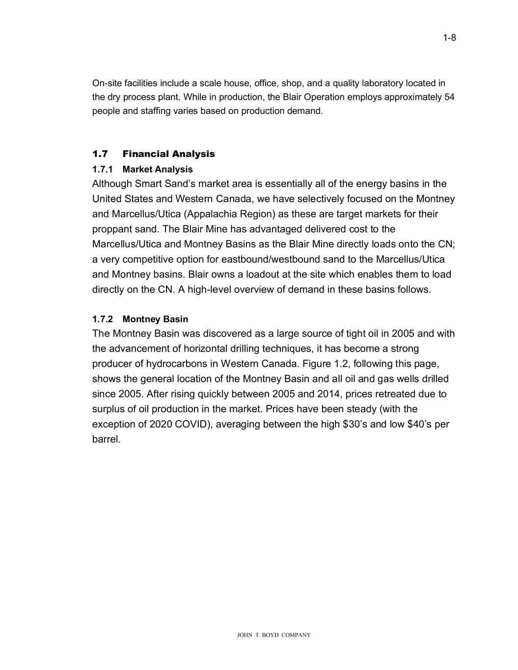 � � ���� � � � ����������������������� 2Q�VLWH�IDFLOLWLHV�LQFOXGH�D�VFDOH�KRXVH��RIILFH��VKRS��DQG�D�TXDOLW\�ODERUDWRU\�ORFDWHG�LQ� WKH�GU\�SURFHVV�SODQW��:KLOH�LQ�SURGXFWLRQ��WKH�%ODLU�2SHUDWLRQ�HPSOR\V�DSSUR�LPDWHO\���� SHRSOH�DQG�VWDIILQJ�YDULHV�EDVHG�RQ�SURGXFWLRQ�GHPDQG��� � � ���� �LQDQFLDO��QDO�VLV� ������ 0DUNHW�$�DO�V�V� $OWKRXJK�6PDUW�6DQG�V�PDUNHW�DUHD�LV�HVVHQWLDOO\�DOO�RI�WKH�HQHUJ\�EDVLQV�LQ�WKH� 8QLWHG�6WDWHV�DQG�:HVWHUQ�&DQDGD���H�KDYH�VHOHFWLYHO\�IRFXVHG�RQ�WKH�0RQWQH\� DQG�0DUFHOOXV�8WLFD��$SSDODFKLD�5HJLRQ��DV�WKHVH�DUH�WDUJHW�PDUNHWV�IRU�WKHLU� SURSSDQW�VDQG��7KH�%ODLU�0LQH�KDV�DGYDQWDJHG�GHOLYHUHG�FRVW�WR�WKH� 0DUFHOOXV�8WLFD�DQG�0RQWQH\�%DVLQV�DV�WKH�%ODLU�0LQH�GLUHFWO\�ORDGV�RQWR�WKH�&1�� D�YHU\�FRPSHWLWLYH�RSWLRQ�IRU�HDVWERXQG��HVWERXQG�VDQG�WR�WKH�0DUFHOOXV�8WLFD� DQG�0RQWQH\�EDVLQV��%ODLU�R�QV�D�ORDGRXW�DW�WKH�VLWH��KLFK�HQDEOHV�WKHP�WR�ORDG� GLUHFWO\�RQ�WKH�&1��$�KLJK�OHYHO�RYHUYLH��RI�GHPDQG�LQ�WKHVH�EDVLQV�IROOR�V�� � ������ 0R�W�H���DV��� 7KH�0RQWQH\�%DVLQ��DV�GLVFRYHUHG�DV�D�ODUJH�VRXUFH�RI�WLJKW�RLO�LQ������DQG��LWK� WKH�DGYDQFHPHQW�RI�KRUL�RQWDO�GULOOLQJ�WHFKQLTXHV��LW�KDV�EHFRPH�D�VWURQJ� SURGXFHU�RI�K\GURFDUERQV�LQ�:HVWHUQ�&DQDGD��)LJXUH������IROOR�LQJ�WKLV�SDJH�� VKR�V�WKH�JHQHUDO�ORFDWLRQ�RI�WKH�0RQWQH\�%DVLQ�DQG�DOO�RLO�DQG�JDV��HOOV�GULOOHG� VLQFH�������$IWHU�ULVLQJ�TXLFNO\�EHW�HHQ������DQG�������SULFHV�UHWUHDWHG�GXH�WR� VXUSOXV�RI�RLO�SURGXFWLRQ�LQ�WKH�PDUNHW��3ULFHV�KDYH�EHHQ�VWHDG\���LWK�WKH� H�FHSWLRQ�RI������&29,����DYHUDJLQJ�EHW�HHQ�WKH�KLJK�����V�DQG�OR������V�SHU� EDUUHO���� �