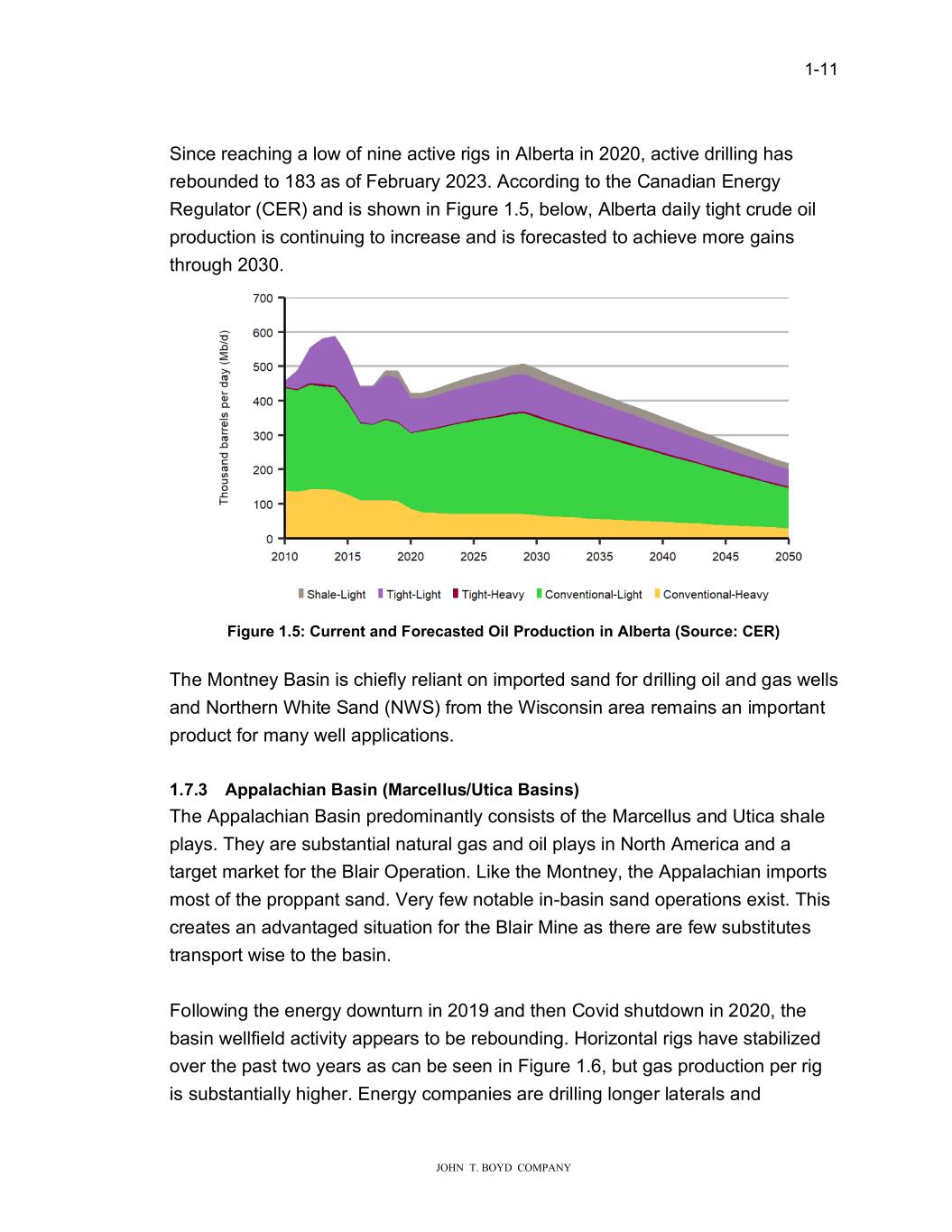 � � ����� � � � ����������������������� 6LQFH�UHDFKLQJ�D�OR��RI�QLQH�DFWLYH�ULJV�LQ�$OEHUWD�LQ�������DFWLYH�GULOOLQJ�KDV� UHERXQGHG�WR�����DV�RI�)HEUXDU\�������$FFRUGLQJ�WR�WKH�&DQDGLDQ�(QHUJ\� 5HJXODWRU��&(5��DQG�LV�VKR�Q�LQ�)LJXUH������EHOR���$OEHUWD�GDLO\�WLJKW�FUXGH�RLO� SURGXFWLRQ�LV�FRQWLQXLQJ�WR�LQFUHDVH�DQG�LV�IRUHFDVWHG�WR�DFKLHYH�PRUH�JDLQV� WKURXJK�������� � )���UH��������UUH�W�D�G�)RUHFDVWHG�2�O�3URG�FW�R�����$OEHUWD��6R�UFH���(5�� � 7KH�0RQWQH\�%DVLQ�LV�FKLHIO\�UHOLDQW�RQ�LPSRUWHG�VDQG�IRU�GULOOLQJ�RLO�DQG�JDV��HOOV� DQG�1RUWKHUQ�:KLWH�6DQG��1:6��IURP�WKH�:LVFRQVLQ�DUHD�UHPDLQV�DQ�LPSRUWDQW� SURGXFW�IRU�PDQ\��HOO�DSSOLFDWLRQV��� � ������ $SSDODF��D���DV����0DUFHOO�V�8W�FD��DV��V��� 7KH�$SSDODFKLDQ�%DVLQ�SUHGRPLQDQWO\�FRQVLVWV�RI�WKH�0DUFHOOXV�DQG�8WLFD�VKDOH� SOD\V��7KH\�DUH�VXEVWDQWLDO�QDWXUDO�JDV�DQG�RLO�SOD\V�LQ�1RUWK�$PHULFD�DQG�D� WDUJHW�PDUNHW�IRU�WKH�%ODLU�2SHUDWLRQ��/LNH�WKH�0RQWQH\��WKH�$SSDODFKLDQ�LPSRUWV� PRVW�RI�WKH�SURSSDQW�VDQG��9HU\�IH��QRWDEOH�LQ�EDVLQ�VDQG�RSHUDWLRQV�H�LVW��7KLV� FUHDWHV�DQ�DGYDQWDJHG�VLWXDWLRQ�IRU�WKH�%ODLU�0LQH�DV�WKHUH�DUH�IH��VXEVWLWXWHV� WUDQVSRUW��LVH�WR�WKH�EDVLQ�� � )ROOR�LQJ�WKH�HQHUJ\�GR�QWXUQ�LQ������DQG�WKHQ�&RYLG�VKXWGR�Q�LQ�������WKH� EDVLQ��HOOILHOG�DFWLYLW\�DSSHDUV�WR�EH�UHERXQGLQJ���RUL�RQWDO�ULJV�KDYH�VWDELOL�HG� RYHU�WKH�SDVW�W�R�\HDUV�DV�FDQ�EH�VHHQ�LQ�)LJXUH������EXW�JDV�SURGXFWLRQ�SHU�ULJ� LV�VXEVWDQWLDOO\�KLJKHU��(QHUJ\�FRPSDQLHV�DUH�GULOOLQJ�ORQJHU�ODWHUDOV�DQG�