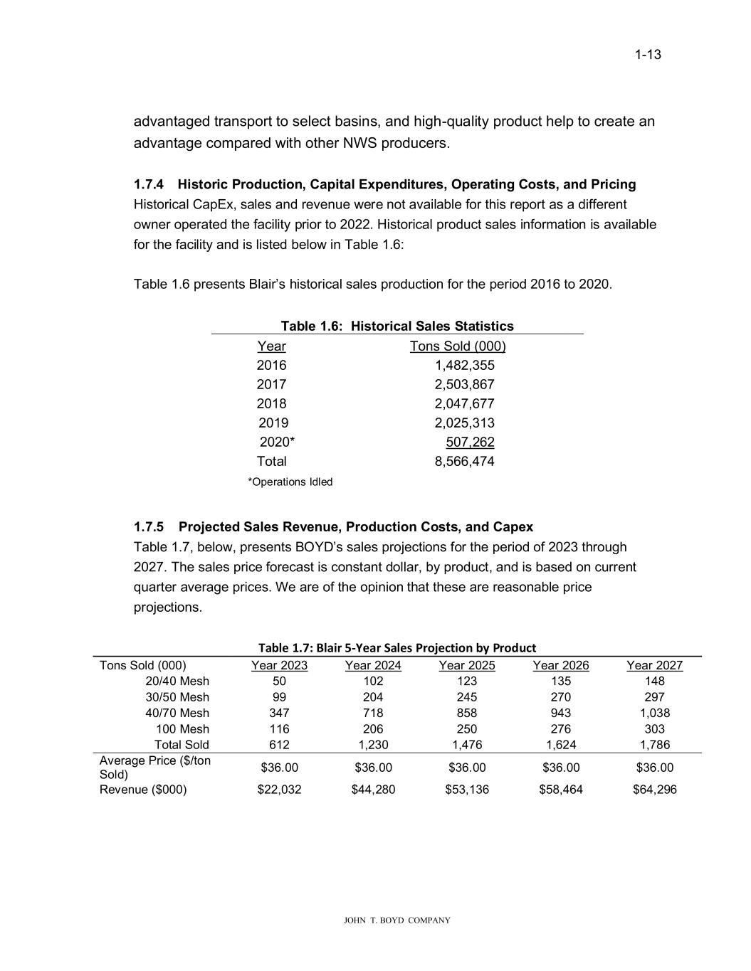 � � ����� � � � ����������������������� DGYDQWDJHG�WUDQVSRUW�WR�VHOHFW�EDVLQV��DQG�KLJK�TXDOLW\�SURGXFW�KHOS�WR�FUHDWH�DQ� DGYDQWDJH�FRPSDUHG��LWK�RWKHU�1:6�SURGXFHUV�� � ������ ��VWRU�F�3URG�FW�R����DS�WDO�(�SH�G�W�UHV��2SHUDW�����RVWV��D�G�3U�F���� �LVWRULFDO�&DS(���VDOHV�DQG�UHYHQXH��HUH�QRW�DYDLODEOH�IRU�WKLV�UHSRUW�DV�D�GLIIHUHQW� R�QHU�RSHUDWHG�WKH�IDFLOLW\�SULRU�WR��������LVWRULFDO�SURGXFW�VDOHV�LQIRUPDWLRQ�LV�DYDLODEOH� IRU�WKH�IDFLOLW\�DQG�LV�OLVWHG�EHOR��LQ�7DEOH������ � 7DEOH�����SUHVHQWV�%ODLU�V�KLVWRULFDO�VDOHV�SURGXFWLRQ�IRU�WKH�SHULRG������WR������� � 7DEOH���������VWRU�FDO�6DOHV�6WDW�VW�FV� <HDU� � 7RQV�6ROG������� � ����� � �������������������������������� �� ����� � �������������������������������� � ����� � �������������������������������� � ������ � �������������������������������� � ��������� � ��������������������������������� � 7RWDO� � �������������������������������� � ���������2SHUDWLRQV�,GOHG� � � � � ���������3URMHFWHG�6DOHV�5H�H��H��3URG�FW�R���RVWV��D�G��DSH�� 7DEOH������EHOR���SUHVHQWV�%2<��V�VDOHV�SURMHFWLRQV�IRU�WKH�SHULRG�RI������WKURXJK� ������7KH�VDOHV�SULFH�IRUHFDVW�LV�FRQVWDQW�GROODU��E\�SURGXFW��DQG�LV�EDVHG�RQ�FXUUHQW� TXDUWHU�DYHUDJH�SULFHV��:H�DUH�RI�WKH�RSLQLRQ�WKDW�WKHVH�DUH�UHDVRQDEOH�SULFH� SURMHFWLRQV�� � d��������������������������������������������������� 7RQV�6ROG������� <HDU������ <HDU������ <HDU������ <HDU������ <HDU������ ������0HVK� � ��� ���� ���� ���� ���� ������0HVK� � ��� ���� ���� ���� ���� ������0HVK� � ���� ���� ���� ���� ������ ����0HVK� � ���� ���� ���� ���� ���� 7RWDO�6ROG� �� ���� ������ ������ ������ ������ $YHUDJH�3ULFH����WRQ� 6ROG�� ������� �������� �������� �������� �������� 5HYHQXH�������� ��������� ��������� ��������� ��������� ��������� � � � �