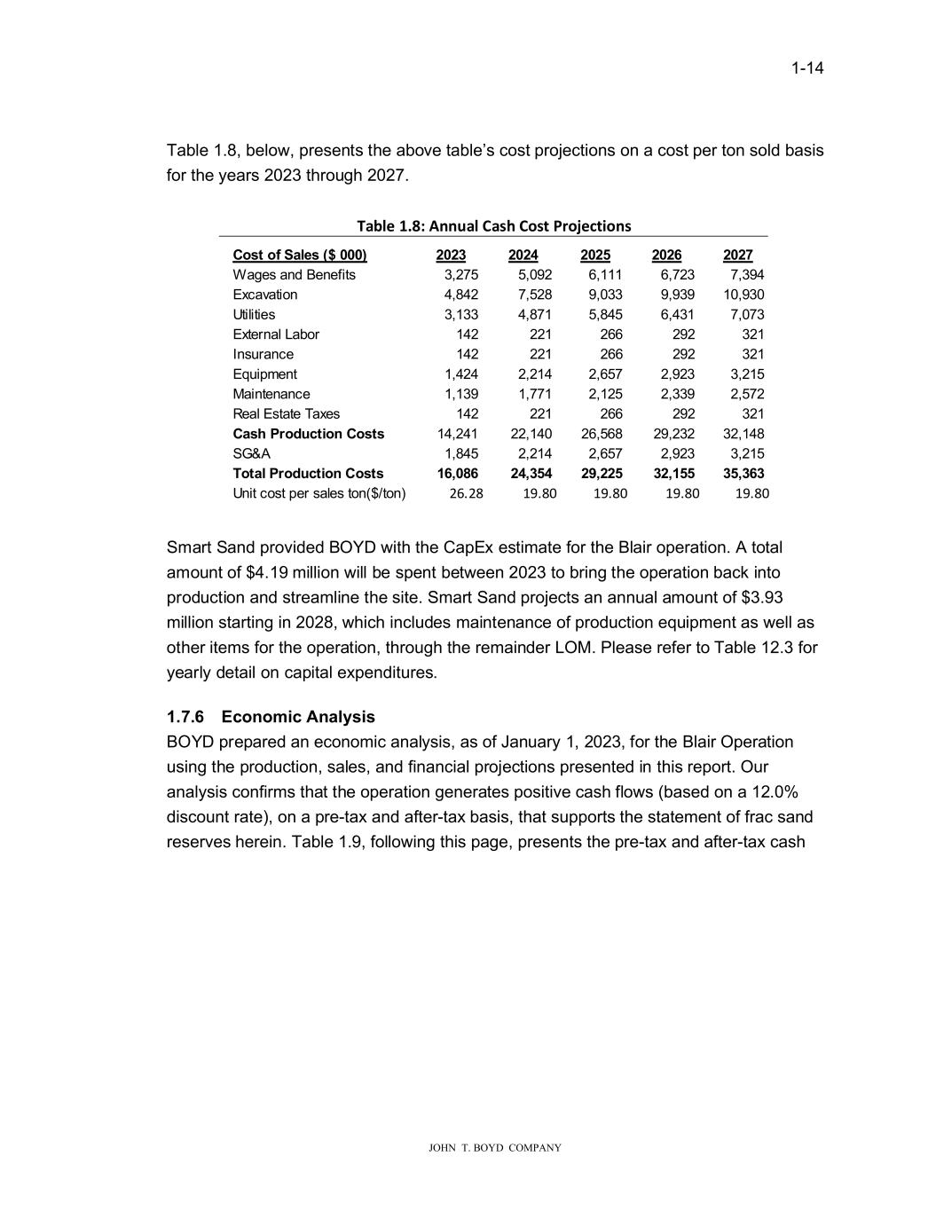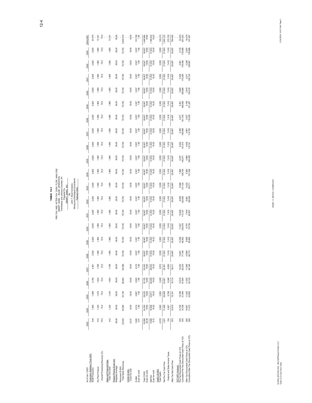 � � ����� � � � ����������������������� �RVW�RI�6DOHV�������� ���� ���� ���� ���� ���� :DJHV�DQG�%HQHILWV ���������� ����������� ���������� ����������� ���������� (�FDYDWLRQ ���������� ����������� ���������� ����������� ��������� 8WLOLWLHV ���������� ����������� ���������� ����������� ���������� (�WHUQDO�/DERU ����������� ������������ ����������� ����������� ����������� ,QVXUDQFH ����������� ������������ ����������� ����������� ����������� (TXLSPHQW ���������� ����������� ���������� ����������� ���������� 0DLQWHQDQFH ���������� ����������� ���������� ����������� ���������� 5HDO�(VWDWH�7D�HV ����������� ������������ ����������� ����������� ����������� �DV��3URG�FW�R���RVWV ��������� ���������� ��������� ���������� ��������� 6*�$ ���������� ����������� ���������� ����������� ���������� 7RWDO�3URG�FW�R���RVWV ��������� ���������� ��������� ���������� ��������� 8QLW�FRVW�SHU�VDOHV�WRQ���WRQ� ����� ����� ����� ����� ����� 7DEOH������EHOR���SUHVHQWV�WKH�DERYH�WDEOH�V�FRVW�SURMHFWLRQV�RQ�D�FRVW�SHU�WRQ�VROG�EDVLV� IRU�WKH�\HDUV������WKURXJK������� � � � � � d���������������������������������������� � � � � � � � � � � � � � � � � � � � � � � � � � � � � � � � � � � 6PDUW�6DQG�SURYLGHG�%2<���LWK�WKH�&DS(��HVWLPDWH�IRU�WKH�%ODLU�RSHUDWLRQ��$�WRWDO� DPRXQW�RI�������PLOOLRQ��LOO�EH�VSHQW�EHW�HHQ������WR�EULQJ�WKH�RSHUDWLRQ�EDFN�LQWR� SURGXFWLRQ�DQG�VWUHDPOLQH�WKH�VLWH��6PDUW�6DQG�SURMHFWV�DQ�DQQXDO�DPRXQW�RI������� PLOOLRQ�VWDUWLQJ�LQ��������KLFK�LQFOXGHV�PDLQWHQDQFH�RI�SURGXFWLRQ�HTXLSPHQW�DV��HOO�DV� RWKHU�LWHPV�IRU�WKH�RSHUDWLRQ��WKURXJK�WKH�UHPDLQGHU�/20��3OHDVH�UHIHU�WR�7DEOH������IRU� \HDUO\�GHWDLO�RQ�FDSLWDO�H�SHQGLWXUHV�� � ������ (FR�RP�F�$�DO�V�V� %2<��SUHSDUHG�DQ�HFRQRPLF�DQDO\VLV��DV�RI�-DQXDU\����������IRU�WKH�%ODLU�2SHUDWLRQ� XVLQJ�WKH�SURGXFWLRQ��VDOHV��DQG�ILQDQFLDO�SURMHFWLRQV�SUHVHQWHG�LQ�WKLV�UHSRUW��2XU� DQDO\VLV�FRQILUPV�WKDW�WKH�RSHUDWLRQ�JHQHUDWHV�SRVLWLYH�FDVK�IOR�V��EDVHG�RQ�D������� GLVFRXQW�UDWH���RQ�D�SUH�WD��DQG�DIWHU�WD��EDVLV��WKDW�VXSSRUWV�WKH�VWDWHPHQW�RI�IUDF�VDQG� UHVHUYHV�KHUHLQ��7DEOH������IROOR�LQJ�WKLV�SDJH��SUHVHQWV�WKH�SUH�WD��DQG�DIWHU�WD��FDVK�� � �