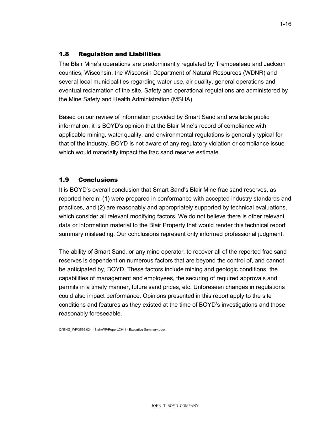 � � ����� � � � ����������������������� ���� 5��XOD�LRQ�DQG��LDELOL�L�V� 7KH�%ODLU�0LQH�V�RSHUDWLRQV�DUH�SUHGRPLQDQWO\�UHJXODWHG�E\�7UHPSHDOHDX�DQG�-DFNVRQ� FRXQWLHV��:LVFRQVLQ��WKH�:LVFRQVLQ��HSDUWPHQW�RI�1DWXUDO�5HVRXUFHV��:�15��DQG� VHYHUDO�ORFDO�PXQLFLSDOLWLHV�UHJDUGLQJ��DWHU�XVH��DLU�TXDOLW\��JHQHUDO�RSHUDWLRQV�DQG� HYHQWXDO�UHFODPDWLRQ�RI�WKH�VLWH��6DIHW\�DQG�RSHUDWLRQDO�UHJXODWLRQV�DUH�DGPLQLVWHUHG�E\� WKH�0LQH�6DIHW\�DQG��HDOWK�$GPLQLVWUDWLRQ��06�$������� � %DVHG�RQ�RXU�UHYLH��RI�LQIRUPDWLRQ�SURYLGHG�E\�6PDUW�6DQG�DQG�DYDLODEOH�SXEOLF� LQIRUPDWLRQ��LW�LV�%2<��V�RSLQLRQ�WKDW�WKH�%ODLU�0LQH�V�UHFRUG�RI�FRPSOLDQFH��LWK� DSSOLFDEOH�PLQLQJ���DWHU�TXDOLW\��DQG�HQYLURQPHQWDO�UHJXODWLRQV�LV�JHQHUDOO\�W\SLFDO�IRU� WKDW�RI�WKH�LQGXVWU\��%2<��LV�QRW�D�DUH�RI�DQ\�UHJXODWRU\�YLRODWLRQ�RU�FRPSOLDQFH�LVVXH� �KLFK��RXOG�PDWHULDOO\�LPSDFW�WKH�IUDF�VDQG�UHVHUYH�HVWLPDWH��� � � ���� �RQFOXVLRQV� ,W�LV�%2<��V�RYHUDOO�FRQFOXVLRQ�WKDW�6PDUW�6DQG�V�%ODLU�0LQH�IUDF�VDQG�UHVHUYHV��DV� UHSRUWHG�KHUHLQ�������HUH�SUHSDUHG�LQ�FRQIRUPDQFH��LWK�DFFHSWHG�LQGXVWU\�VWDQGDUGV�DQG� SUDFWLFHV��DQG�����DUH�UHDVRQDEO\�DQG�DSSURSULDWHO\�VXSSRUWHG�E\�WHFKQLFDO�HYDOXDWLRQV�� �KLFK�FRQVLGHU�DOO�UHOHYDQW�PRGLI\LQJ�IDFWRUV��:H�GR�QRW�EHOLHYH�WKHUH�LV�RWKHU�UHOHYDQW� GDWD�RU�LQIRUPDWLRQ�PDWHULDO�WR�WKH�%ODLU�3URSHUW\�WKDW��RXOG�UHQGHU�WKLV�WHFKQLFDO�UHSRUW� VXPPDU\�PLVOHDGLQJ��2XU�FRQFOXVLRQV�UHSUHVHQW�RQO\�LQIRUPHG�SURIHVVLRQDO�MXGJPHQW�� � 7KH�DELOLW\�RI�6PDUW�6DQG��RU�DQ\�PLQH�RSHUDWRU��WR�UHFRYHU�DOO�RI�WKH�UHSRUWHG�IUDF�VDQG� UHVHUYHV�LV�GHSHQGHQW�RQ�QXPHURXV�IDFWRUV�WKDW�DUH�EH\RQG�WKH�FRQWURO�RI��DQG�FDQQRW� EH�DQWLFLSDWHG�E\��%2<���7KHVH�IDFWRUV�LQFOXGH�PLQLQJ�DQG�JHRORJLF�FRQGLWLRQV��WKH� FDSDELOLWLHV�RI�PDQDJHPHQW�DQG�HPSOR\HHV��WKH�VHFXULQJ�RI�UHTXLUHG�DSSURYDOV�DQG� SHUPLWV�LQ�D�WLPHO\�PDQQHU��IXWXUH�VDQG�SULFHV��HWF��8QIRUHVHHQ�FKDQJHV�LQ�UHJXODWLRQV� FRXOG�DOVR�LPSDFW�SHUIRUPDQFH��2SLQLRQV�SUHVHQWHG�LQ�WKLV�UHSRUW�DSSO\�WR�WKH�VLWH� FRQGLWLRQV�DQG�IHDWXUHV�DV�WKH\�H�LVWHG�DW�WKH�WLPH�RI�%2<��V�LQYHVWLJDWLRQV�DQG�WKRVH� UHDVRQDEO\�IRUHVHHDEOH�� � 4��(1*B:3������������%ODLU�:3�5HSRUW�&������(�HFXWLYH�6XPPDU\�GRF��