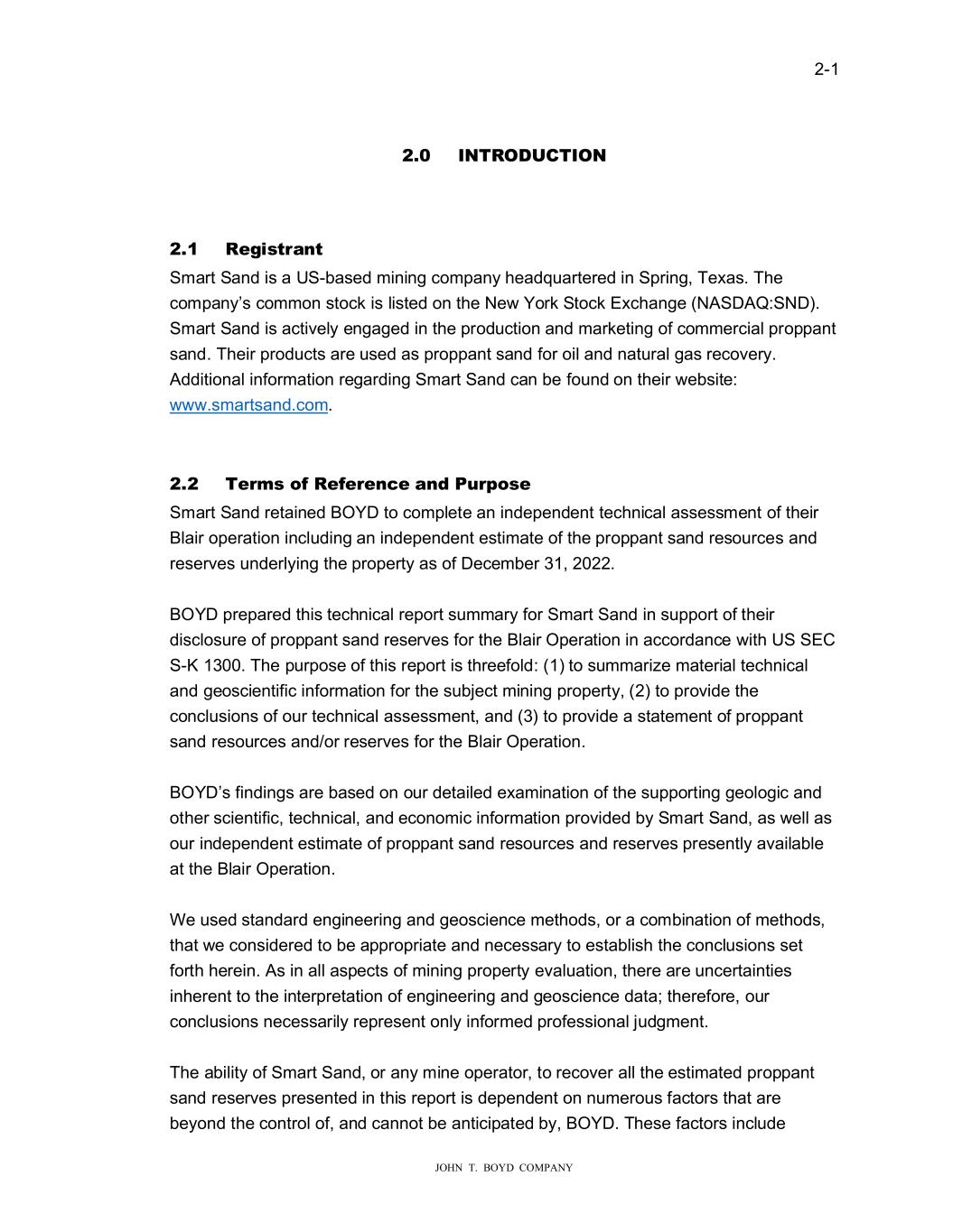 ��� ���������������������� ���� ����87�9���6800�5�� ���� �Q�URGXF�LRQ� %2<���DV�UHWDLQHG�E\�6PDUW�6DQG�WR�FRPSOHWH�DQ�LQGHSHQGHQW�UHVHUYH�HVWLPDWH�RI� PLQHUDO�UHVRXUFHV�DQG�PLQHUDO�UHVHUYHV�KHUHDIWHU�UHIHUUHG�WR�DV�SURSSDQW�VDQG� UHVRXUFH�DQG�SURSSDQW�VDQG�UHVHUYHV�IRU�WKHLU�DFWLYH�PLQLQJ�RSHUDWLRQ�ORFDWHG�LQ�%ODLU�� :LVFRQVLQ��WKH��%ODLU�2SHUDWLRQ����6PDUW�6DQG�SXUFKDVHG�WKH�%ODLU�2SHUDWLRQ�LQ�0DUFK� �����IURP��L�&UXVK�//&���L�&UXVK�//&��DV�WKH�RULJLQDO�GHYHORSHU�RI�WKH�PLQH�DQG� SURSHUW\��� 7KLV�UHSRUW�VXPPDUL�HV�WKH�UHVXOWV�RI�RXU�UHYLH��DQG�VDWLVILHV�WKH�UHTXLUHPHQWV�IRU� 6PDUW�6DQG�V�GLVFORVXUH�RI�IUDF�VDQG�UHVRXUFHV�DQG�UHVHUYHV�VHW�IRUWK�LQ�6XESDUW������ DQG�,WHP�����E������RI�WKH�6(&�V�5HJXODWLRQ�6�.��6�.��������7KLV�LV�WKH�ILUVW�WHFKQLFDO� UHSRUW�VXPPDU\�ILOHG�E\�6PDUW�6DQG�IRU�WKH�%ODLU�2SHUDWLRQ�� %2<��V�ILQGLQJV�DUH�EDVHG�RQ�RXU�GHWDLOHG�H�DPLQDWLRQ�RI�WKH�VXSSRUWLQJ�JHRORJLF�� WHFKQLFDO��DQG�HFRQRPLF�LQIRUPDWLRQ�REWDLQHG�IURP������6PDUW�6DQG�SURYLGHG�ILOHV�� ��� GLVFXVVLRQV��LWK�6PDUW�6DQG�SHUVRQQHO������UHFRUGV�RQ�ILOH��LWK�UHJXODWRU\�DJHQFLHV� ��� SXEOLF�VRXUFHV��DQG�����QRQFRQILGHQWLDO�%2<��ILOHV��2XU�LQYHVWLJDWLRQ��DV�SHUIRUPHG WR�REWDLQ�UHDVRQDEOH�DVVXUDQFH�WKDW�6PDUW�6DQG�V�SURSSDQW�VDQG�UHVRXUFH�DQG�UHVHUYH VWDWHPHQWV�DUH�IUHH�IURP�PDWHULDO�PLVVWDWHPHQW��7KLV�UHSRUW�SURYLGHV�UHVXOWV�RI�DQ LQGHSHQGHQW�HVWLPDWH�RI�WKH�SURSSDQW�VDQG�UHVRXUFHV�DQG�UHVHUYHV�XQGHUO\LQJ�WKH�%ODLU� :LVFRQVLQ�SURSHUW\��,W�VKRXOG�EH�QRWHG�WKDW�DOO�RI�WKH�SURSSDQW�VDQG�UHVRXUFHV�RQ�WKH SURSHUW\�KDYH�EHHQ�FRQYHUWHG�WR�SURSSDQW�VDQG�UHVHUYHV��DQG�WKHUH�DUH�QR�DGGLWLRQDO UHVRXUFHV�WR�UHSRUW� 7KLV�FKDSWHU�SURYLGHV�D�VXPPDU\�RI�SULPDU\�LQIRUPDWLRQ�FRQWDLQHG��LWKLQ�WKLV�WHFKQLFDO� UHSRUW�VXPPDU\�DQG�LV�VXSSRUWHG�E\�UHPDLQLQJ�SRUWLRQV�RI�WKLV�UHSRUW�LQFOXGLQJ�WH�W�� ILJXUHV��DQG�WDEOHV��:HLJKWV�DQG�PHDVXUHPHQWV�DUH�H�SUHVVHG�LQ�86�FXVWRPDU\�XQLWV�� 8QOHVV�QRWHG��WKH�HIIHFWLYH�GDWH�RI�WKH�LQIRUPDWLRQ��LQFOXGLQJ�HVWLPDWHV�RI�SURSSDQW�VDQG� UHVHUYHV��LV��HFHPEHU����������� ���� 3URS�U�����VFULS�LRQ�� 6PDUW�6DQG�V�%ODLU�2SHUDWLRQ�LV�D�VXUIDFH�PLQLQJ�RSHUDWLRQ�ORFDWHG�LQ�7UHPSHDOHDX�DQG� -DFNVRQ�FRXQWLHV��:LVFRQVLQ��3URSSDQW�VDQG�LV�PLQHG�IURP�WKH�:RQH�RF�)RUPDWLRQ� 6DQGVWRQH���KLFK�KDV�KLVWRULFDOO\�EHHQ�WKH�VXEMHFW�RI�H�WHQVLYH�SURSSDQW�VDQG�PLQLQJ�LQ� WKH�DUHD��6PDUW�6DQG�FRQWUROV�DSSUR�LPDWHO\�������FRQWLJXRXV�DFUHV�RI�SURSHUW\��KLFK� LV�R�QHG�IHH�VLPSOH��7KH�JHQHUDO�ORFDWLRQ�RI�WKLV�SURSHUW\��WKH��%ODLU�2SHUDWLRQ���LV� SURYLGHG�RQ�)LJXUH������RQ�WKH�IROOR�LQJ�SDJH��