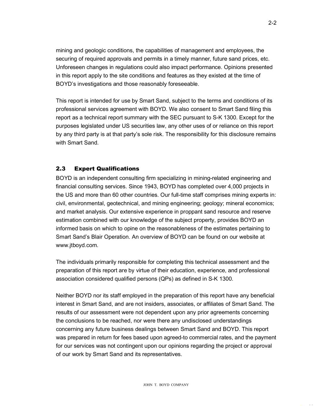 �������������������������� � ���������G������������������������ � � � � )HEU�DU\���������� )LOH����������� � � � 0U���KULVWRSKHU��UHHQ���3�� �RQWUROOHU� 6PDUW�6DQG��,QFRUSRUDWHG� �����)ORUDO�9DOH��R�OHYDUG��6�LWH����� �DUGOH\��3��������� � 6�EMHFW�� 7HFKQLFDO�5HSRUW�6�PPDU\� )UDF�6DQG�5HVR�UFHV�DQG�5HVHUYHV� �ODLU�0LQH� � � -DFNVRQ�DQG�7UHPSHOHD���R�QWLHV��:LVFRQVLQ� � �HDU�0U���UHHQ�� � 7KLV�6.������FRPSOLDQW�WHFKQLFDO�UHSRUW�V�PPDU\�SURYLGHV� WKH�UHV�OWV�RI�-RKQ�7���R\G��RPSDQ\�V���2����LQGHSHQGHQW� D�GLW�RI�WKH�IUDF��SURSSDQW��VDQG�UHVR�UFHV�DQG�UHVHUYHV�IRU� 6PDUW�6DQG��,QF��V��6PDUW�6DQG��KROGLQJV�DV�RI��HFHPEHU� ���������� � :H��LVK�WR�DFNQR�OHGJH�WKH�FRRSHUDWLRQ�RI�6PDUW�6DQG� PDQDJHPHQW�DQG�VWDII�IRU�SURYLGLQJ�WKH�WHFKQLFDO��ILQDQFLDO�� DQG�OHJDO�LQIRUPDWLRQ��VHG�LQ�FRPSOHWLQJ�WKLV�SURMHFW��2�U� ILQGLQJV�DUH�EDVHG�RQ��2���V�H�WHQVLYH�H�SHULHQFH�LQ� SUHSDULQJ�IUDF�VDQG�UHVR�UFH�DQG�UHVHUYH�HVWLPDWHV��VHG�LQ� 86�6HF�ULWLHV�DQG�(�FKDQJH��RPPLVVLRQ��6(���ILOLQJV��DQG� R�U�NQR�OHGJH�RI�IUDF�VDQG�PLQLQJ�LQ�:LVFRQVLQ�DQG� WKUR�JKR�W�1RUWK��PHULFD�� � 5HVSHFWI�OO\�V�EPLWWHG�� � -2�1��7����2�����203�1�� �\�� � � � -RKQ�7���R\G�,,� 3UHVLGHQW�DQG��(2� � 4��(1�B:3�������������ODLU�:3�5HSRUW��RYHU��HWWHU�GRF�� � � ��D��PD�� � � -�PH�� ���R�G� � � � ���V������D������� � � -R���7���R�G�,,� � � � �D�D����� ��������D������� � � 5R���G�����H�L�� � � � ��������V�����V�� � � 5R�H�W�-��)��PH�� � -L��H�J��-��R���+��� � � -R������ HL��� � � 0LF��H��)�� LF�� � � �L��L�P�3�� R�I� � � � �D�D����� ������������V��DO�D� � � -�FT�H�� ��6WHH�H��PS� � � � �D�D����� ��������������D� � � 5R�JMLH��-HII���L� � � � �D�D����� �����������������P����D� � � ����R��)������H��� � � � � � � ����VE������ � � �����7R����H�WH���R��H���G��6�LWH����� � � ���R�����J��3�������� � � ��������������� � � ���������������)��� � � MW�R�GS�MW�R�G�FRP� � � � � ������� � � ��������������� � � MW�R�GG�MW�R�G�FRP� � � � ���VED���� � � ��������������� � � MW�R�G���MW�R�G�FRP� � � � ���M����� � � ���������������� � � MW�R�GF��MW�R�G�FRP� � � � �����D�� � � ��������������� � � MW�R�GFR� MW�R�G�FRP� � � � � � ����M�E������P� �