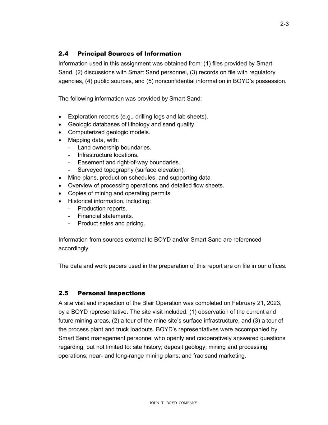 � � ���� � � � ������������������������ ���� 3U�Q��SDO�6R�U��V�RI��QIRUPD��RQ�� ,QIRUPDWLRQ���HG�LQ�WKL��D��L�QPHQW��D��REWDLQHG�IURP������ILOH��SURYLGHG�E\�6PDUW� 6DQG������GL�F���LRQ���LWK�6PDUW�6DQG�SHU�RQQHO������UHFRUG��RQ�ILOH��LWK�UH��ODWRU\� D�HQFLH�������S�EOLF��R�UFH���DQG�����QRQFRQILGHQWLDO�LQIRUPDWLRQ�LQ��2�����SR��H��LRQ�� � �KH�IROOR�LQ��LQIRUPDWLRQ��D��SURYLGHG�E\�6PDUW�6DQG�� � •� (�SORUDWLRQ�UHFRUG���H�����GULOOLQ��OR���DQG�ODE��KHHW���� •� �HROR�LF�GDWDED�H��RI�OLWKROR�\�DQG��DQG�T�DOLW\�� •� �RPS�WHUL�HG��HROR�LF�PRGHO��� •� 0DSSLQ��GDWD���LWK�� �� /DQG�R�QHU�KLS�ER�QGDULH��� �� ,QIUD�WU�FW�UH�ORFDWLRQ��� �� (D�HPHQW�DQG�UL�KW�RI��D\�ER�QGDULH���� �� 6�UYH\HG�WRSR�UDSK\����UIDFH�HOHYDWLRQ��� •� 0LQH�SODQ���SURG�FWLRQ��FKHG�OH���DQG���SSRUWLQ��GDWD�� •� 2YHUYLH��RI�SURFH��LQ��RSHUDWLRQ��DQG�GHWDLOHG�IOR���KHHW��� •� �RSLH��RI�PLQLQ��DQG�RSHUDWLQ��SHUPLW��� •� �L�WRULFDO�LQIRUPDWLRQ��LQFO�GLQ��� �� 3URG�FWLRQ�UHSRUW��� �� )LQDQFLDO��WDWHPHQW��� �� 3URG�FW��DOH��DQG�SULFLQ��� � ,QIRUPDWLRQ�IURP��R�UFH��H�WHUQDO�WR��2���DQG�RU�6PDUW�6DQG�DUH�UHIHUHQFHG� DFFRUGLQ�O\�� � �KH�GDWD�DQG��RUN�SDSHU����HG�LQ�WKH�SUHSDUDWLRQ�RI�WKL��UHSRUW�DUH�RQ�ILOH�LQ�R�U�RIILFH���� � � ���� 3�UVRQDO��QVS����RQV� $��LWH�YL�LW�DQG�LQ�SHFWLRQ�RI�WKH��ODLU�2SHUDWLRQ��D��FRPSOHWHG�RQ�)HEU�DU\����������� E\�D��2���UHSUH�HQWDWLYH���KH��LWH�YL�LW�LQFO�GHG������RE�HUYDWLRQ�RI�WKH�F�UUHQW�DQG� I�W�UH�PLQLQ��DUHD�������D�WR�U�RI�WKH�PLQH��LWH�����UIDFH�LQIUD�WU�FW�UH��DQG�����D�WR�U�RI� WKH�SURFH���SODQW�DQG�WU�FN�ORDGR�W����2�����UHSUH�HQWDWLYH���HUH�DFFRPSDQLHG�E\� 6PDUW�6DQG�PDQD�HPHQW�SHU�RQQHO��KR�RSHQO\�DQG�FRRSHUDWLYHO\�DQ��HUHG�T�H�WLRQ�� UH�DUGLQ���E�W�QRW�OLPLWHG�WR���LWH�KL�WRU\��GHSR�LW��HROR�\��PLQLQ��DQG�SURFH��LQ�� RSHUDWLRQ���QHDU��DQG�ORQ��UDQ�H�PLQLQ��SODQ���DQG�IUDF��DQG�PDUNHWLQ���� � � �