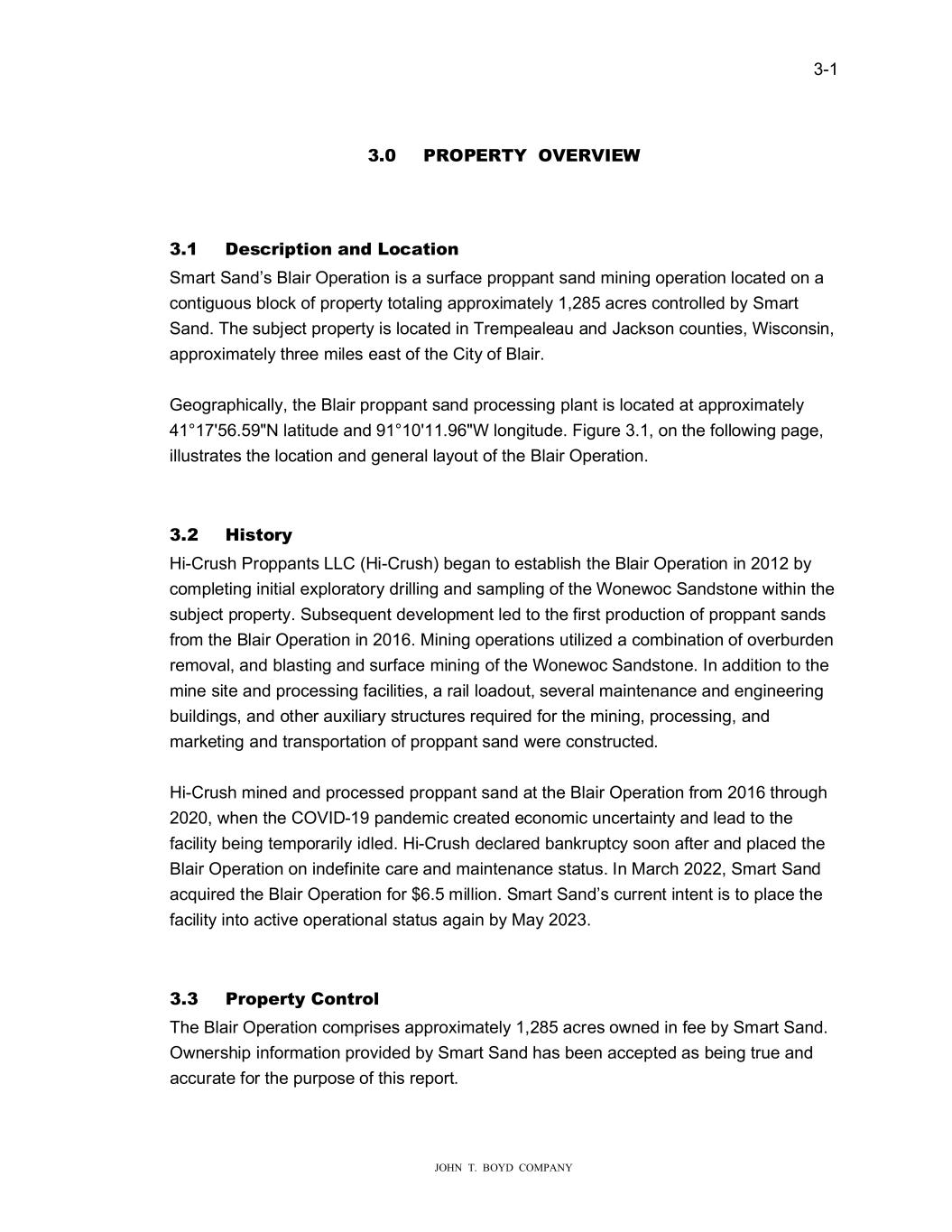 � � ���� � � � ������������������������ ���� 3523�57���2��5�,��� � � ���� �HV��L�WLR��D����R�DWLR�� 6PDUW�6DQG�V�%ODLU�2SHUDWLRQ�LV�D�V�UIDFH�SURSSDQW�VDQG�PLQLQJ�RSHUDWLRQ�ORFDWHG�RQ�D� FRQWLJ�R�V�EORFN�RI�SURSHUW\�WRWDOLQJ�DSSUR�LPDWHO\�������DFUHV�FRQWUROOHG�E\�6PDUW� 6DQG��7�H�V�EMHFW�SURSHUW\�LV�ORFDWHG�LQ�7UHPSHDOHD��DQG�-DFNVRQ�FR�QWLHV��:LVFRQVLQ�� DSSUR�LPDWHO\�W�UHH�PLOHV�HDVW�RI�W�H��LW\�RI�%ODLU�� � �HRJUDS�LFDOO\��W�H�%ODLU�SURSSDQW�VDQG�SURFHVVLQJ�SODQW�LV�ORFDWHG�DW�DSSUR�LPDWHO\� ������������1�ODWLW�GH�DQG�������������:�ORQJLW�GH��)LJ�UH������RQ�W�H�IROOR�LQJ�SDJH�� LOO�VWUDWHV�W�H�ORFDWLRQ�DQG�JHQHUDO�OD\R�W�RI�W�H�%ODLU�2SHUDWLRQ�� � � ���� �LVWR��� �L��U�V��3URSSDQWV�������L��U�V���EHJDQ�WR�HVWDEOLV��W�H�%ODLU�2SHUDWLRQ�LQ������E\� FRPSOHWLQJ�LQLWLDO�H�SORUDWRU\�GULOOLQJ�DQG�VDPSOLQJ�RI�W�H�:RQH�RF�6DQGVWRQH��LW�LQ�W�H� V�EMHFW�SURSHUW\��6�EVHT�HQW�GH�HORSPHQW�OHG�WR�W�H�ILUVW�SURG�FWLRQ�RI�SURSSDQW�VDQGV� IURP�W�H�%ODLU�2SHUDWLRQ�LQ�������0LQLQJ�RSHUDWLRQV��WLOL�HG�D�FRPELQDWLRQ�RI�R�HUE�UGHQ� UHPR�DO��DQG�EODVWLQJ�DQG�V�UIDFH�PLQLQJ�RI�W�H�:RQH�RF�6DQGVWRQH��,Q�DGGLWLRQ�WR�W�H� PLQH�VLWH�DQG�SURFHVVLQJ�IDFLOLWLHV��D�UDLO�ORDGR�W��VH�HUDO�PDLQWHQDQFH�DQG�HQJLQHHULQJ� E�LOGLQJV��DQG�RW�HU�D��LOLDU\�VWU�FW�UHV�UHT�LUHG�IRU�W�H�PLQLQJ��SURFHVVLQJ��DQG� PDUNHWLQJ�DQG�WUDQVSRUWDWLRQ�RI�SURSSDQW�VDQG��HUH�FRQVWU�FWHG�� � �L��U�V��PLQHG�DQG�SURFHVVHG�SURSSDQW�VDQG�DW�W�H�%ODLU�2SHUDWLRQ�IURP������W�UR�J�� ��������HQ�W�H��29,'����SDQGHPLF�FUHDWHG�HFRQRPLF��QFHUWDLQW\�DQG�OHDG�WR�W�H� IDFLOLW\�EHLQJ�WHPSRUDULO\�LGOHG���L��U�V��GHFODUHG�EDQNU�SWF\�VRRQ�DIWHU�DQG�SODFHG�W�H� %ODLU�2SHUDWLRQ�RQ�LQGHILQLWH�FDUH�DQG�PDLQWHQDQFH�VWDW�V��,Q�0DUF��������6PDUW�6DQG� DFT�LUHG�W�H�%ODLU�2SHUDWLRQ�IRU������PLOOLRQ��6PDUW�6DQG�V�F�UUHQW�LQWHQW�LV�WR�SODFH�W�H� IDFLOLW\�LQWR�DFWL�H�RSHUDWLRQDO�VWDW�V�DJDLQ�E\�0D\������� � � ���� 3�R�H�W���R�W�RO� 7�H�%ODLU�2SHUDWLRQ�FRPSULVHV�DSSUR�LPDWHO\�������DFUHV�R�QHG�LQ�IHH�E\�6PDUW�6DQG�� 2�QHUV�LS�LQIRUPDWLRQ�SUR�LGHG�E\�6PDUW�6DQG��DV�EHHQ�DFFHSWHG�DV�EHLQJ�WU�H�DQG� DFF�UDWH�IRU�W�H�S�USRVH�RI�W�LV�UHSRUW�� �