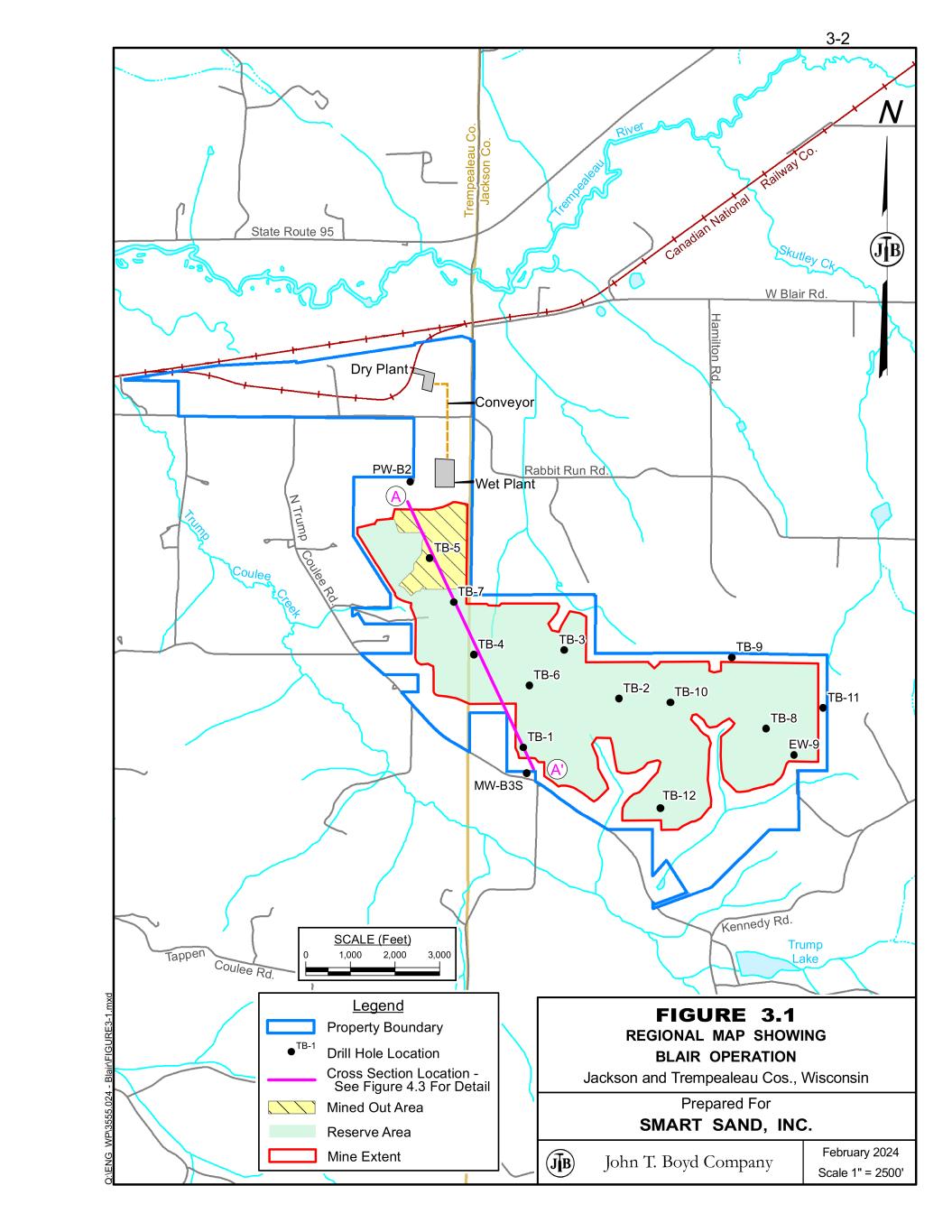 Coulee Rd. Tappen Kennedy Rd. Trump Lake Rabbit Run Rd. H a m ilto n R d . W Blair Rd. Canadian N atio nal R ailw ay C o. Tr em pe al ea u River T re m p e a l e a u C o . Ja ck s o n C o . Skutley Ck. State Route 95 Trum p Coulee C reek N T ru m p C oulee R d. TB-12 TB-1 TB-2 TB-3TB-4 TB-5 TB-6 TB-7 TB-8 TB-9 EW-9 TB-10 TB-11 PW-B2 MW-B3S Q :\ E N G _ W P \3 5 5 5 .0 2 4 - B la ir \F IG U R E 3 -1 .m xd 3-2 0 1,000 2,000 3,000 SCALE (Feet) Dry Plant Wet Plant Conveyor February 2024 Scale 1" = 2500' �������������������� FIGURE 3.1 REGIONAL MAP SHOWING BLAIR OPERATION Jackson and Trempealeau Cos., Wisconsin Prepared For SMART SAND, INC. �A �A' Legend Property Boundary Reserve Area Drill Hole Location Mined Out Area TB-1 Mine Extent Cross Section Location - See Figure 4.3 For Detail