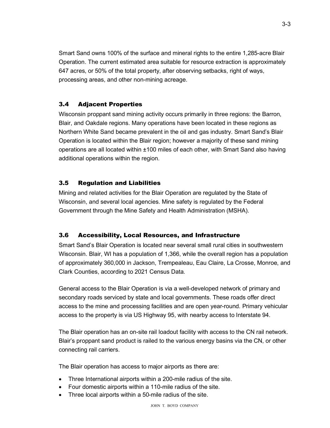 � � ���� � � � ������������������������ 6PDUW�6DQG�R�QV������RI�W�H�V�UIDFH�DQG�PLQHUDO�ULJ�WV�WR�W�H�HQWLUH�������DFUH�%ODLU� 2SHUDWLRQ��7�H�F�UUHQW�HVWLPDWHG�DUHD�V�LWDEOH�IRU�UHVR�UFH�H�WUDFWLRQ�LV�DSSUR�LPDWHO\� ����DFUHV��RU�����RI�W�H�WRWDO�SURSHUW\��DIWHU�REVHU�LQJ�VHWEDFNV��ULJ�W�RI��D\V�� SURFHVVLQJ�DUHDV��DQG�RW�HU�QRQ�PLQLQJ�DFUHDJH��� � � ���� ���D�H�W�3�R�H�WLHV� :LVFRQVLQ�SURSSDQW�VDQG�PLQLQJ�DFWL�LW\�RFF�UV�SULPDULO\�LQ�W�UHH�UHJLRQV��W�H�%DUURQ�� %ODLU��DQG�2DNGDOH�UHJLRQV��0DQ\�RSHUDWLRQV��D�H�EHHQ�ORFDWHG�LQ�W�HVH�UHJLRQV�DV� 1RUW�HUQ�:�LWH�6DQG�EHFDPH�SUH�DOHQW�LQ�W�H�RLO�DQG�JDV�LQG�VWU\��6PDUW�6DQG�V�%ODLU� 2SHUDWLRQ�LV�ORFDWHG��LW�LQ�W�H�%ODLU�UHJLRQ���R�H�HU�D�PDMRULW\�RI�W�HVH�VDQG�PLQLQJ� RSHUDWLRQV�DUH�DOO�ORFDWHG��LW�LQ������PLOHV�RI�HDF��RW�HU���LW��6PDUW�6DQG�DOVR��D�LQJ� DGGLWLRQDO�RSHUDWLRQV��LW�LQ�W�H�UHJLRQ�� � � ���� 5H��ODWLR��D����LDELOLWLHV� 0LQLQJ�DQG�UHODWHG�DFWL�LWLHV�IRU�W�H�%ODLU�2SHUDWLRQ�DUH�UHJ�ODWHG�E\�W�H�6WDWH�RI� :LVFRQVLQ��DQG�VH�HUDO�ORFDO�DJHQFLHV��0LQH�VDIHW\�LV�UHJ�ODWHG�E\�W�H�)HGHUDO� �R�HUQPHQW�W�UR�J��W�H�0LQH�6DIHW\�DQG��HDOW��$GPLQLVWUDWLRQ��06�$����� � � ���� ���HVVLELOLW����R�DO�5HVR���HV��D���,�I�DVW���W��H� 6PDUW�6DQG�V�%ODLU�2SHUDWLRQ�LV�ORFDWHG�QHDU�VH�HUDO�VPDOO�U�UDO�FLWLHV�LQ�VR�W��HVWHUQ� :LVFRQVLQ��%ODLU��:,��DV�D�SRS�ODWLRQ�RI����������LOH�W�H�R�HUDOO�UHJLRQ��DV�D�SRS�ODWLRQ� RI�DSSUR�LPDWHO\���������LQ�-DFNVRQ��7UHPSHDOHD���(D���ODLUH���D��URVVH��0RQURH��DQG� �ODUN��R�QWLHV��DFFRUGLQJ�WR�������HQV�V�'DWD��� � �HQHUDO�DFFHVV�WR�W�H�%ODLU�2SHUDWLRQ�LV��LD�D��HOO�GH�HORSHG�QHW�RUN�RI�SULPDU\�DQG� VHFRQGDU\�URDGV�VHU�LFHG�E\�VWDWH�DQG�ORFDO�JR�HUQPHQWV��7�HVH�URDGV�RIIHU�GLUHFW� DFFHVV�WR�W�H�PLQH�DQG�SURFHVVLQJ�IDFLOLWLHV�DQG�DUH�RSHQ�\HDU�UR�QG��3ULPDU\��H�LF�ODU� DFFHVV�WR�W�H�SURSHUW\�LV��LD�86��LJ��D\������LW��QHDUE\�DFFHVV�WR�,QWHUVWDWH����� � 7�H�%ODLU�RSHUDWLRQ��DV�DQ�RQ�VLWH�UDLO�ORDGR�W�IDFLOLW\��LW��DFFHVV�WR�W�H��1�UDLO�QHW�RUN�� %ODLU�V�SURSSDQW�VDQG�SURG�FW�LV�UDLOHG�WR�W�H��DULR�V�HQHUJ\�EDVLQV��LD�W�H��1��RU�RW�HU� FRQQHFWLQJ�UDLO�FDUULHUV�� � 7�H�%ODLU�RSHUDWLRQ��DV�DFFHVV�WR�PDMRU�DLUSRUWV�DV�W�HUH�DUH�� •� 7�UHH�,QWHUQDWLRQDO�DLUSRUWV��LW�LQ�D�����PLOH�UDGL�V�RI�W�H�VLWH�� •� )R�U�GRPHVWLF�DLUSRUWV��LW�LQ�D�����PLOH�UDGL�V�RI�W�H�VLWH�� •� 7�UHH�ORFDO�DLUSRUWV��LW�LQ�D����PLOH�UDGL�V�RI�W�H�VLWH��