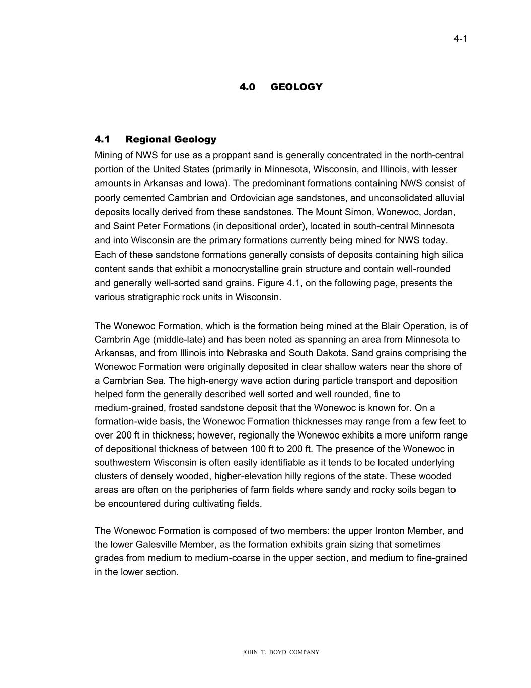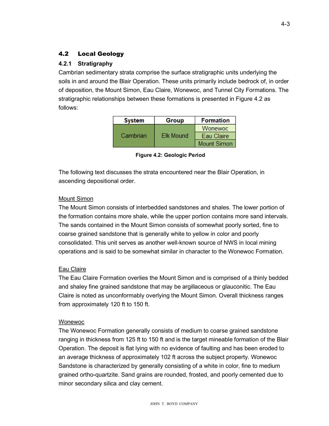 � � ���� � � � ����������������������� ���� ��ROR���� 7KH�%ODLU�2SHUDWLRQ�V�WDUJHW�VLOLFD�EHDULQJ�IRUPDWLRQ�LV�WKH�:RQH�RF�6DQGVWRQH���KLFK� LV�D�PDVVLYH�IRUPDWLRQ�LQ�DUHDO�H�WHQW�DQG�WKLFNQHVV��$HULDOO\��LW�H�WHQGV�IURP�0LQQHVRWD� WR�$UNDQVDV�DQG�IURP�:LVFRQVLQ�LQWR�1HEUDVND�DQG�6RXWK��DNRWD��2Q�D�UHJLRQDO�EDVLV�� WKH�:RQH�RF�UDQJHV�LQ�WKLFNQHVV�IURP�D�IH��IHHW�WR�RYHU�����IW���LWK�D�JHQHUDO�WKLFNQHVV� EHW�HHQ�����IW�WR�����IW��UHDFKLQJ�RYHU�����IW�WKLFN�LQ�SRUWLRQV�RI�QRUWKHUQ�:LVFRQVLQ�� � 7KH�VXUIDFH�RI�WKH�%ODLU�2SHUDWLRQ�LV�RYHUODLQ�E\�D�FRPELQDWLRQ�RI�VKDOH��FOD\H\�VDQGV�� DQG�VRLOV�PDWHULDO�WKDW�UDQJHV�LQ�WKLFNQHVV�IURP���IW�WR�����IW���LWK�DQ�DYHUDJH�WKLFNQHVV� RI�DSSUR�LPDWHO\����IW�WKURXJKRXW�WKH�PLQHDEOH�SRUWLRQ�RI�WKH�SURSHUW\�� � 7KH�:RQH�RF�GHSRVLW��LWKLQ�WKH�%ODLU�2SHUDWLRQ�SURSHUW\�LV�IODW�O\LQJ��LWK�QR�HYLGHQFH�RI� IDXOWLQJ��DQG�KDV�EHHQ�SDUWLDOO\�HURGHG�WR�DQ�DYHUDJH�WKLFNQHVV�RI�DSSUR�LPDWHO\�����IW�� 7KH�:RQH�RF�6DQGVWRQH�FDQ�EH�JHQHUDOO\�GHVFULEHG�DV��HOO�VRUWHG���HOO�URXQGHG��ILQH� WR�PHGLXP�VL�H�IURVWHG�JUDLQV�RI�H�FHSWLRQDOO\�SXUH�TXDUW��VDQGV���KLFK�DUH�IUHH�IURP� GHOHWHULRXV�PDWHULDOV�DQG��HDNO\�FHPHQWHG��$V�VXFK��WKH�VDQG�LV�YDOXHG�LQ�WKH� PDUNHWSODFH�IRU�LWV�KLJK�VLOLFD�FRQWHQW��JUDLQ�URXQGQHVV��JUDLQ�VWUHQJWK�DQG�RWKHU� DWWUDFWLYH�SURSSDQW�VDQG�SURSHUWLHV��� � *UDLQ�VL�H�GLVWULEXWLRQ�DQG�RYHUEXUGHQ�WKLFNQHVV�GULYHV�WKH�PLQH�SODQQLQJ��6DQG� LQWHUYDOV�VDPSOHG�LQGLFDWH�JUDLQ�VL�H�EHFRPHV�FRDUVHU�LQ�WKH�PLGGOH�SRUWLRQV�RI�WKH� PLQHDEOH�LQWHUYDO��7KHVH�FRDUVHU�LQWHUYDOV�DUH�DSSUR�LPDWHO\����IW�WKLFN�DQG�\LHOG� EHW�HHQ�����DQG�����������PHVK�PDWHULDO�� � 7KH�RYHUEXUGHQ�LV�DW�LWV�WKLQQHVW�RQ�WKH��HVWHUQ�SRUWLRQ�RI�WKH�SURSHUW\��KHUH�WKH� :RQH�RF�6DQGVWRQH�RXWFURSV��2YHUEXUGHQ�PDWHULDO�LQ�WKLV�DUHD�FDQ�EH�UHPRYHG��LWK� VLPSOH�FRQYHQWLRQDO�H�WUDFWLRQ�DQG�VFUDSLQJ�PHWKRGV��&RQYHUVHO\��WKH�RYHUEXUGHQ�LV� WKLFNHVW�LQ�WKH�VRXWK�DQG�HDVWHUQ�HGJH�RI�WKH�SURSHUW\��EHQHDWK�VHYHUDO�VKDOOR��ULGJHV��� ,Q�DUHDV�RI�WKH�KLJKHVW�WRSRJUDSK\��WKH�RYHUEXUGHQ��LOO�PRVW�OLNHO\�EHFRPH�FRPSHWHQW� DQG�UHTXLUH�GULOOLQJ�DQG�EODVWLQJ�EHIRUH�H�FDYDWLRQ���� � � ���� ��SORUD�LRQ�� %DVHG�RQ�DYDLODEOH�LQIRUPDWLRQ��WKHUH��HUH�W�R�H�SORUDWLRQ�GULOOLQJ�SURJUDPV�SHUIRUPHG� RQ�WKH�%ODLU�SURSHUW\��ILUVW�LQ������DQG�D�VHFRQG�LQ�������2YHUDOO��WKHUH�KDYH�EHHQ����� � �