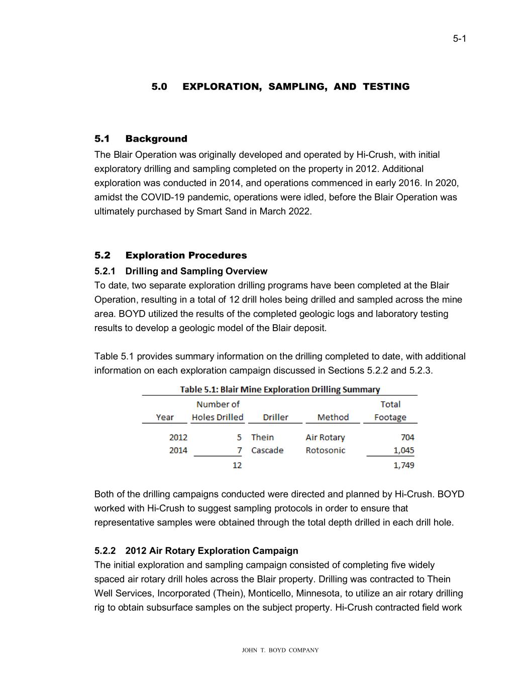 � � ���� � � � ������������������������ ���� ��3�25��,21�����03�,1�����1�������,1�� � � ���� �D�N��RX�G� 7KH�%ODLU�2SHUDWLRQ��DV�RUL�LQDOO\�GHYHORSHG�DQG�RSHUDWHG�E\�+L��U�VK���LWK�LQLWLDO� H�SORUDWRU\�GULOOLQ��DQG�VDPSOLQ��FRPSOHWHG�RQ�WKH�SURSHUW\�LQ��������GGLWLRQDO� H�SORUDWLRQ��DV�FRQG�FWHG�LQ�������DQG�RSHUDWLRQV�FRPPHQFHG�LQ�HDUO\�������,Q������� DPLGVW�WKH��29,�����SDQGHPLF��RSHUDWLRQV��HUH�LGOHG��EHIRUH�WKH�%ODLU�2SHUDWLRQ��DV� �OWLPDWHO\�S�UFKDVHG�E\�6PDUW�6DQG�LQ�0DUFK������� � � ���� ��SOR�D�LR��3�R��GX��V� ������ ���OO�Q��DQG�6DPSO�Q��2�������� 7R�GDWH��W�R�VHSDUDWH�H�SORUDWLRQ�GULOOLQ��SUR�UDPV�KDYH�EHHQ�FRPSOHWHG�DW�WKH�%ODLU� 2SHUDWLRQ��UHV�OWLQ��LQ�D�WRWDO�RI����GULOO�KROHV�EHLQ��GULOOHG�DQG�VDPSOHG�DFURVV�WKH�PLQH� DUHD��%2<���WLOL�HG�WKH�UHV�OWV�RI�WKH�FRPSOHWHG��HROR�LF�OR�V�DQG�ODERUDWRU\�WHVWLQ�� UHV�OWV�WR�GHYHORS�D��HROR�LF�PRGHO�RI�WKH�%ODLU�GHSRVLW�� � 7DEOH�����SURYLGHV�V�PPDU\�LQIRUPDWLRQ�RQ�WKH�GULOOLQ��FRPSOHWHG�WR�GDWH���LWK�DGGLWLRQDO� LQIRUPDWLRQ�RQ�HDFK�H�SORUDWLRQ�FDPSDL�Q�GLVF�VVHG�LQ�6HFWLRQV�������DQG�������� � � %RWK�RI�WKH�GULOOLQ��FDPSDL�QV�FRQG�FWHG��HUH�GLUHFWHG�DQG�SODQQHG�E\�+L��U�VK��%2<�� �RUNHG��LWK�+L��U�VK�WR�V���HVW�VDPSOLQ��SURWRFROV�LQ�RUGHU�WR�HQV�UH�WKDW� UHSUHVHQWDWLYH�VDPSOHV��HUH�REWDLQHG�WKUR��K�WKH�WRWDO�GHSWK�GULOOHG�LQ�HDFK�GULOO�KROH�� � ������ ���������5R�D���(�SOR�D��RQ��DPSD��Q� 7KH�LQLWLDO�H�SORUDWLRQ�DQG�VDPSOLQ��FDPSDL�Q�FRQVLVWHG�RI�FRPSOHWLQ��ILYH��LGHO\� VSDFHG�DLU�URWDU\�GULOO�KROHV�DFURVV�WKH�%ODLU�SURSHUW\���ULOOLQ���DV�FRQWUDFWHG�WR�7KHLQ� :HOO�6HUYLFHV��,QFRUSRUDWHG��7KHLQ���0RQWLFHOOR��0LQQHVRWD��WR��WLOL�H�DQ�DLU�URWDU\�GULOOLQ�� UL��WR�REWDLQ�V�EV�UIDFH�VDPSOHV�RQ�WKH�V�EMHFW�SURSHUW\��+L��U�VK�FRQWUDFWHG�ILHOG��RUN�