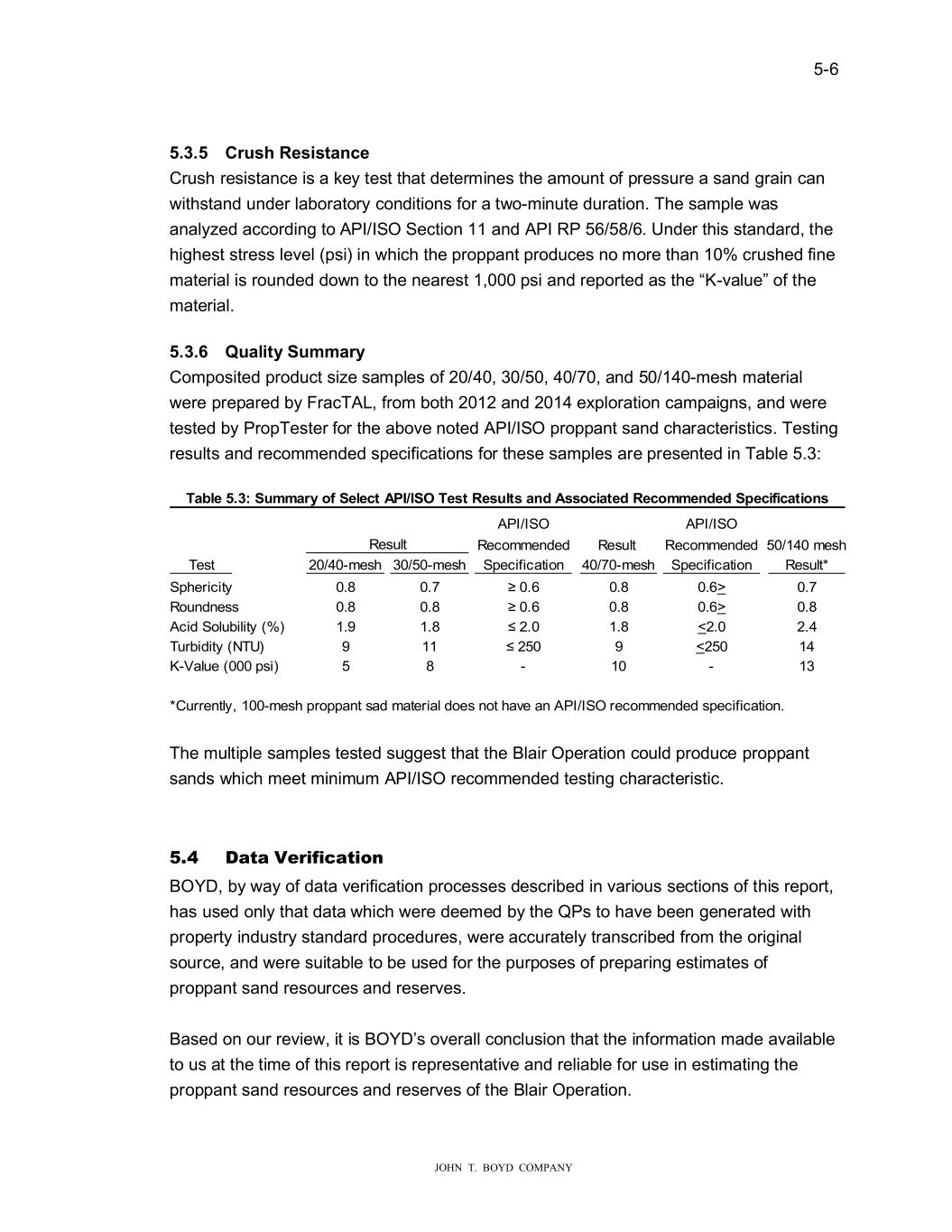� � ���� � � � ������������������������ �DEO�������6�PPD���RI�6�O�����3���62������5���O���DQG����R��D��G�5��RPP�QG�G�6S���I��D��RQ� �3,�,62 �3,�,62 5HV�OW 5HFRPPHQGHG 5HV�OW� 5HFRPPHQGHG �������PHVK 7HVW ������PHVK ������PHVK 6SHFLILFDWLRQ ������PHVK 6SHFLILFDWLRQ 5HV�OW� 6SKHULFLW\ ��� ��� ≥�0.6 ��� ���� ��� 5R�QGQHVV ��� ��� ≥�0.6 ��� ���� ��� �FLG�6RO�ELOLW\���� ��� ��� ≤�2.0 ��� ���� ��� 7�UELGLW\��178� � �� ≤�250 � ���� �� .�9DO�H������SVL� � � � �� � �� ���UUHQWO\������PHVK�SURSSDQW�VDG�PDWHULDO�GRHV�QRW�KDYH�DQ��3,�,62�UHFRPPHQGHG�VSHFLILFDWLRQ� ������ ������5�����DQ��� �U�VK�UHVLVWDQFH�LV�D�NH\�WHVW�WKDW�GHWHUPLQHV�WKH�DPR�QW�RI�SUHVV�UH�D�VDQG��UDLQ�FDQ� �LWKVWDQG��QGHU�ODERUDWRU\�FRQGLWLRQV�IRU�D�W�R�PLQ�WH�G�UDWLRQ��7KH�VDPSOH��DV� DQDO\�HG�DFFRUGLQ��WR��3,�,62�6HFWLRQ����DQG��3,�53����������8QGHU�WKLV�VWDQGDUG��WKH� KL�KHVW�VWUHVV�OHYHO��SVL��LQ��KLFK�WKH�SURSSDQW�SURG�FHV�QR�PRUH�WKDQ�����FU�VKHG�ILQH� PDWHULDO�LV�UR�QGHG�GR�Q�WR�WKH�QHDUHVW�������SVL�DQG�UHSRUWHG�DV�WKH��.�YDO�H��RI�WKH� PDWHULDO�� � ������ 4�DO����6�PPD��� �RPSRVLWHG�SURG�FW�VL�H�VDPSOHV�RI����������������������DQG��������PHVK�PDWHULDO� �HUH�SUHSDUHG�E\�)UDF7�/��IURP�ERWK������DQG������H�SORUDWLRQ�FDPSDL�QV��DQG��HUH� WHVWHG�E\�3URS7HVWHU�IRU�WKH�DERYH�QRWHG��3,�,62�SURSSDQW�VDQG�FKDUDFWHULVWLFV��7HVWLQ�� UHV�OWV�DQG�UHFRPPHQGHG�VSHFLILFDWLRQV�IRU�WKHVH�VDPSOHV�DUH�SUHVHQWHG�LQ�7DEOH������ � � � � � � � � � � 7KH�P�OWLSOH�VDPSOHV�WHVWHG�V���HVW�WKDW�WKH�%ODLU�2SHUDWLRQ�FR�OG�SURG�FH�SURSSDQW� VDQGV��KLFK�PHHW�PLQLP�P��3,�,62�UHFRPPHQGHG�WHVWLQ��FKDUDFWHULVWLF�� � � ���� �D�D����LIL�D�LR�� %2<���E\��D\�RI�GDWD�YHULILFDWLRQ�SURFHVVHV�GHVFULEHG�LQ�YDULR�V�VHFWLRQV�RI�WKLV�UHSRUW�� KDV��VHG�RQO\�WKDW�GDWD��KLFK��HUH�GHHPHG�E\�WKH�43V�WR�KDYH�EHHQ��HQHUDWHG��LWK� SURSHUW\�LQG�VWU\�VWDQGDUG�SURFHG�UHV���HUH�DFF�UDWHO\�WUDQVFULEHG�IURP�WKH�RUL�LQDO� VR�UFH��DQG��HUH�V�LWDEOH�WR�EH��VHG�IRU�WKH�S�USRVHV�RI�SUHSDULQ��HVWLPDWHV�RI� SURSSDQW�VDQG�UHVR�UFHV�DQG�UHVHUYHV�� � %DVHG�RQ�R�U�UHYLH���LW�LV�%2<��V�RYHUDOO�FRQFO�VLRQ�WKDW�WKH�LQIRUPDWLRQ�PDGH�DYDLODEOH� WR��V�DW�WKH�WLPH�RI�WKLV�UHSRUW�LV�UHSUHVHQWDWLYH�DQG�UHOLDEOH�IRU��VH�LQ�HVWLPDWLQ��WKH� SURSSDQW�VDQG�UHVR�UFHV�DQG�UHVHUYHV�RI�WKH�%ODLU�2SHUDWLRQ�� �