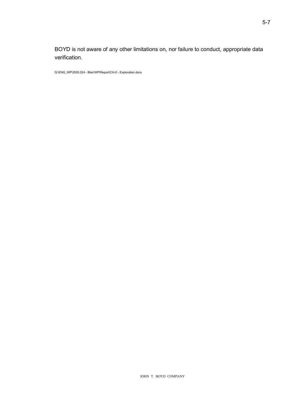 � � ���� � � � ������������������������ ��HROR�LF�OR��LQ��DQG�VDPSOLQ���R�W�WR��HROR�LVWV�HPSOR\HG�E\�6�PPLW�(QYLURVRO�WLRQV� �6�PPLW���6W��3D�O��0LQQHVRWD�� � �LU�URWDU\�GULOOLQ���WLOL�HV�D�URWDWLQ��LPSDFW�KDPPHU�GULOOLQ��ELW�WR�EUHDN��S�WKH�VWUDWD�WKDW� DUH�EHLQ��GULOOHG�WKUR��K��+L�K�SUHVV�UHG�DLU�GULYHV�WKH�LPSDFWLQ��DQG�URWDWLQ��IRUFHV�RI� WKH�KDPPHU�ELW�WR�DGYDQFH�GULOO�KROH�GHSWKV��KLOH�DOVR�FRROLQ��WKH�ELW�G�ULQ��GULOOLQ��� ��WWLQ�V�WKDW�DUH�SURG�FHG�DV�WKH�ELW�DGYDQFHV�GR�Q�KROH�DUH�IRUFHG�EDFN��S�WKH�GULOO� KROH�DQG�WR�WKH�V�UIDFH�WR�NHHS�WKH�KROH�FOHDU�DV�WKH�F�WWLQ��KHDG�DGYDQFHV��6DPSOHV� DUH�REWDLQHG�IURP�DLU�URWDU\�GULOOV�E\�SODFLQ��D�FKLS�WUD\�EHQHDWK�WKH�F\FORQH�FK�WH�RQ�WKH� GULOOLQ��UL���6DPSOHV�IRU�WKLV�FDPSDL�Q��HUH��DWKHUHG�IRU�HDFK����IW�LQWHUYDO�WKDW�WKH�GULOO� UL��DGYDQFHG�WR�D�WRWDO�GHSWK�UDQ�LQ��IURP�����IW�WR�����IW�� � 6DPSOHV�REWDLQHG�IRU�HDFK����IW�U�Q��HUH�FRQHG�DQG�T�DUWHUHG�LQ�WKH�ILHOG���LWK�G�SOLFDWH� VDPSOHV�RI�HDFK����IW�U�Q�WDNHQ��(DFK�VDPSOH��DV�SODFHG�LQWR�D�KHDY\�PLO�SODVWLF�ED�� WKDW��DV�ODEHOHG��LWK�GULOO�KROH�QDPH��WRS�DQG�ERWWRP�GHSWK��DQG��KHWKHU�HDFK�VDPSOH� �DV�DQ����6DPSOH��RU�D��%�6DPSOH���6DPSOH�ED�V��HUH�WKHQ�SODFHG�LQWR�E�FNHWV���LWK� OLGV�VHF�UHG�DQG�FRQWHQWV�RI�HDFK�E�FNHW�QRWHG��7KH����6DPSOH��VHW��DV�VHQW�WR� )UDF7�/��//���)UDF7�/���6W��3D�O��0LQQHVRWD�IRU�VDPSOH�SUHSDUDWLRQ�DQG�SDUWLFOH�VL�H� DQDO\VHV���KLOH�WKH��%�6DPSOH��VHW��DV�SODFHG�LQWR�VWRUD�H�E\�+L��U�VK�IRU�DUFKLYDO� S�USRVHV�� � )UDF7�/��DV�DOVR�GLUHFWHG�E\�+L��U�VK�WR�FUHDWH�W�R�VHWV�RI�FRPSRVLWH��SURG�FW�VL�H�� �����������������������������PHVK��VDPSOHV���KLFK��R�OG�UHSUHVHQW�WKH�I�OO\�SURFHVVHG� ��DVKHG�DQG�GULHG��PDWHULDO�WKDW�LV�U�Q�WKUR��K�WKH�SURFHVVLQ��SODQW��IURP�VDPSOH� PDWHULDO�RI�W�R�GLIIHUHQW�GULOO�KROHV��7KHVH�FRPSRVLWH�VDPSOHV��HUH�VHQW�WR�3URS�7HVWHU�� �\SU�V��7H�DV��WR�KDYH��3,�53�����,62�����������3,�,62��WHVWLQ��FRPSOHWHG�� � ������ �����5R�R�RQ���(�SOR�D��RQ��DPSD��Q� 7KH������H�SORUDWLRQ�DQG�VDPSOLQ��FDPSDL�Q�FRQVLVWHG�RI�FRPSOHWLQ��VHYHQ�URWRVRQLF� GULOO�KROHV�RQ�WKH�%ODLU�SURSHUW\��LQ�RUGHU�WR�VHUYH�DV�DQ�LQILOO�GULOOLQ��FDPSDL�Q�DQG�REWDLQ� DGGLWLRQDO�GHWDLOHG�LQIRUPDWLRQ�RQ�WKH�GHSRVLW�IRU�PLQH�SODQQLQ��DQG�SODQW�GHVL�Q��7KH� �����GULOOLQ��FDPSDL�Q��DV�FRQWUDFWHG�WR��DVFDGH�(QYLURQPHQWDO���DVFDGH���/LWWOH�)DOOV�� 0LQQHVRWD��WR��WLOL�H�D�URWRVRQLF�GULOOLQ��UL��WR�REWDLQ�V�EV�UIDFH�VDPSOH�PDWHULDOV���LWK� ILHOG��RUN�D�DLQ�FRQWUDFWHG�WR�6�PPLW�� � 5RWRVRQLF�GULOOLQ���WLOL�HV�D�URWDWLQ��DQG�YLEUDWRU\�GULOOLQ��KHDG�WKDW�DGYDQFHV�D�KROOR�� GULOOLQ��ELW�DQG�FRUH�EDUUHOV�GR�Q�KROH��7KLV�GULOOLQ��PHWKRG�SURYLGHV��RRG�UHFRYHU\� UHV�OWV��LWK�D�QHDUO\��QGLVW�UEHG�GULOOLQ��FRUH�LQ�VWUDWD�WKDW�LV�SRRU�WR��QFRQVROLGDWHG�LQ� QDW�UH���V�WKH�ELW�DGYDQFHV�GR�Q�KROH��URWDWLRQDO�IRUFHV�DQG�GLIIHUHQW�YLEUDWLRQ�