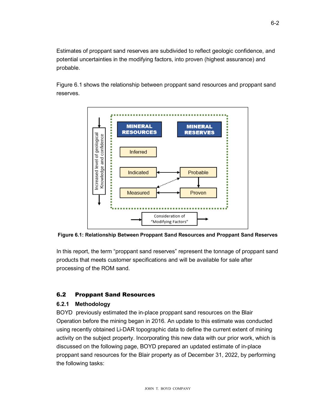 � � ���� � � ������������������������ (�WLPDWH��RI�SURSSDQW��DQG�UH�HUYH��DUH���EGLYLGHG�WR�UHIOHFW�JHRORJLF�FRQILGHQFH��DQG� SRWHQWLDO��QFHUWDLQWLH��LQ�WKH�PRGLI\LQJ�IDFWRU���LQWR�SURYHQ��KLJKH�W�D���UDQFH��DQG� SUREDEOH�� � )LJ�UH������KR���WKH�UHODWLRQ�KLS�EHW�HHQ�SURSSDQW��DQG�UH�R�UFH��DQG�SURSSDQW��DQG� UH�HUYH��� � � ������������������R�V��S���������3�RSS����6������VR��F�V�����3�RSS����6������V����V� � ,Q�WKL��UHSRUW��WKH�WHUP��SURSSDQW��DQG�UH�HUYH���UHSUH�HQW�WKH�WRQQDJH�RI�SURSSDQW��DQG� SURG�FW��WKDW�PHHW��F��WRPHU��SHFLILFDWLRQ��DQG��LOO�EH�DYDLODEOH�IRU��DOH�DIWHU� SURFH��LQJ�RI�WKH�520��DQG�� � � ���� 3URSSD���6D�����VR�U��V� ������ ����R�R�R���� %2<���SUHYLR��O\�H�WLPDWHG�WKH�LQ�SODFH�SURSSDQW��DQG�UH�R�UFH��RQ�WKH�%ODLU� 2SHUDWLRQ�EHIRUH�WKH�PLQLQJ�EHJDQ�LQ��������Q��SGDWH�WR�WKL��H�WLPDWH��D��FRQG�FWHG� ��LQJ�UHFHQWO\�REWDLQHG�/L���5�WRSRJUDSKLF�GDWD�WR�GHILQH�WKH�F�UUHQW�H�WHQW�RI�PLQLQJ� DFWLYLW\�RQ�WKH���EMHFW�SURSHUW\��,QFRUSRUDWLQJ�WKL��QH��GDWD��LWK�R�U�SULRU��RUN���KLFK�L�� GL�F���HG�RQ�WKH�IROOR�LQJ�SDJH��%2<��SUHSDUHG�DQ��SGDWHG�H�WLPDWH�RI�LQ�SODFH� SURSSDQW��DQG�UH�R�UFH��IRU�WKH�%ODLU�SURSHUW\�D��RI��HFHPEHU�����������E\�SHUIRUPLQJ� WKH�IROOR�LQJ�WD�N��� �