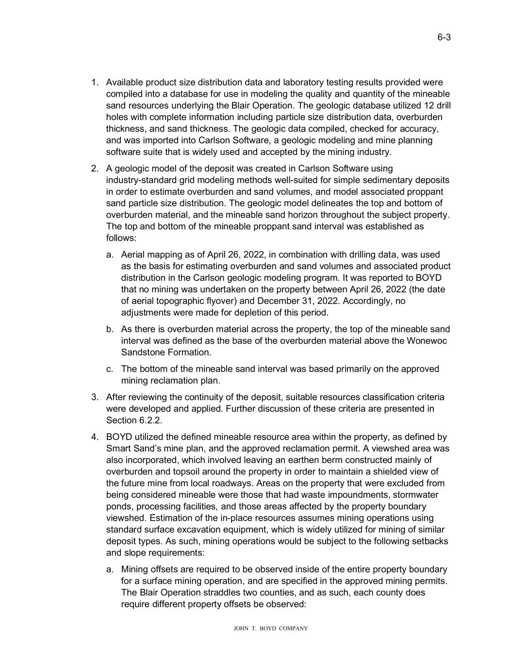 � � ���� � � ������������������������ ��� �YDLODEOH�SURG�FW��L�H�GL�WULE�WLRQ�GDWD�DQG�ODERUDWRU\�WH�WLQJ�UH��OW��SURYLGHG��HUH� FRPSLOHG�LQWR�D�GDWDED�H�IRU���H�LQ�PRGHOLQJ�WKH�T�DOLW\�DQG�T�DQWLW\�RI�WKH�PLQHDEOH� �DQG�UH�R�UFH���QGHUO\LQJ�WKH�%ODLU�2SHUDWLRQ��7KH�JHRORJLF�GDWDED�H��WLOL�HG����GULOO� KROH���LWK�FRPSOHWH�LQIRUPDWLRQ�LQFO�GLQJ�SDUWLFOH��L�H�GL�WULE�WLRQ�GDWD��RYHUE�UGHQ� WKLFNQH����DQG��DQG�WKLFNQH����7KH�JHRORJLF�GDWD�FRPSLOHG��FKHFNHG�IRU�DFF�UDF\�� DQG��D��LPSRUWHG�LQWR��DUO�RQ�6RIW�DUH��D�JHRORJLF�PRGHOLQJ�DQG�PLQH�SODQQLQJ� �RIW�DUH���LWH�WKDW�L���LGHO\���HG�DQG�DFFHSWHG�E\�WKH�PLQLQJ�LQG��WU\��� ��� ��JHRORJLF�PRGHO�RI�WKH�GHSR�LW��D��FUHDWHG�LQ��DUO�RQ�6RIW�DUH���LQJ� LQG��WU\��WDQGDUG�JULG�PRGHOLQJ�PHWKRG���HOO���LWHG�IRU��LPSOH��HGLPHQWDU\�GHSR�LW�� LQ�RUGHU�WR�H�WLPDWH�RYHUE�UGHQ�DQG��DQG�YRO�PH���DQG�PRGHO�D��RFLDWHG�SURSSDQW� �DQG�SDUWLFOH��L�H�GL�WULE�WLRQ��7KH�JHRORJLF�PRGHO�GHOLQHDWH��WKH�WRS�DQG�ERWWRP�RI� RYHUE�UGHQ�PDWHULDO��DQG�WKH�PLQHDEOH��DQG�KRUL�RQ�WKUR�JKR�W�WKH���EMHFW�SURSHUW\�� 7KH�WRS�DQG�ERWWRP�RI�WKH�PLQHDEOH�SURSSDQW��DQG�LQWHUYDO��D��H�WDEOL�KHG�D�� IROOR���� D�� �HULDO�PDSSLQJ�D��RI��SULO�����������LQ�FRPELQDWLRQ��LWK�GULOOLQJ�GDWD���D����HG� D��WKH�ED�L��IRU�H�WLPDWLQJ�RYHUE�UGHQ�DQG��DQG�YRO�PH��DQG�D��RFLDWHG�SURG�FW� GL�WULE�WLRQ�LQ�WKH��DUO�RQ�JHRORJLF�PRGHOLQJ�SURJUDP��,W��D��UHSRUWHG�WR�%2<�� WKDW�QR�PLQLQJ��D���QGHUWDNHQ�RQ�WKH�SURSHUW\�EHW�HHQ��SULO�����������WKH�GDWH� RI�DHULDO�WRSRJUDSKLF�IO\RYHU��DQG��HFHPEHU������������FFRUGLQJO\��QR� DGM��WPHQW���HUH�PDGH�IRU�GHSOHWLRQ�RI�WKL��SHULRG�� E�� ���WKHUH�L��RYHUE�UGHQ�PDWHULDO�DFUR���WKH�SURSHUW\��WKH�WRS�RI�WKH�PLQHDEOH��DQG� LQWHUYDO��D��GHILQHG�D��WKH�ED�H�RI�WKH�RYHUE�UGHQ�PDWHULDO�DERYH�WKH�:RQH�RF� 6DQG�WRQH�)RUPDWLRQ��� F�� 7KH�ERWWRP�RI�WKH�PLQHDEOH��DQG�LQWHUYDO��D��ED�HG�SULPDULO\�RQ�WKH�DSSURYHG� PLQLQJ�UHFODPDWLRQ�SODQ�� ��� �IWHU�UHYLH�LQJ�WKH�FRQWLQ�LW\�RI�WKH�GHSR�LW����LWDEOH�UH�R�UFH��FOD��LILFDWLRQ�FULWHULD� �HUH�GHYHORSHG�DQG�DSSOLHG��)�UWKHU�GL�F���LRQ�RI�WKH�H�FULWHULD�DUH�SUH�HQWHG�LQ� 6HFWLRQ�������� ��� %2<���WLOL�HG�WKH�GHILQHG�PLQHDEOH�UH�R�UFH�DUHD��LWKLQ�WKH�SURSHUW\��D��GHILQHG�E\� 6PDUW�6DQG���PLQH�SODQ��DQG�WKH�DSSURYHG�UHFODPDWLRQ�SHUPLW����YLH��KHG�DUHD��D�� DO�R�LQFRUSRUDWHG���KLFK�LQYROYHG�OHDYLQJ�DQ�HDUWKHQ�EHUP�FRQ�WU�FWHG�PDLQO\�RI� RYHUE�UGHQ�DQG�WRS�RLO�DUR�QG�WKH�SURSHUW\�LQ�RUGHU�WR�PDLQWDLQ�D��KLHOGHG�YLH��RI� WKH�I�W�UH�PLQH�IURP�ORFDO�URDG�D\����UHD��RQ�WKH�SURSHUW\�WKDW��HUH�H�FO�GHG�IURP� EHLQJ�FRQ�LGHUHG�PLQHDEOH��HUH�WKR�H�WKDW�KDG��D�WH�LPSR�QGPHQW����WRUP�DWHU� SRQG���SURFH��LQJ�IDFLOLWLH���DQG�WKR�H�DUHD��DIIHFWHG�E\�WKH�SURSHUW\�ER�QGDU\� YLH��KHG��(�WLPDWLRQ�RI�WKH�LQ�SODFH�UH�R�UFH��D���PH��PLQLQJ�RSHUDWLRQ����LQJ� �WDQGDUG���UIDFH�H�FDYDWLRQ�HT�LSPHQW���KLFK�L���LGHO\��WLOL�HG�IRU�PLQLQJ�RI��LPLODU� GHSR�LW�W\SH��������FK��PLQLQJ�RSHUDWLRQ���R�OG�EH���EMHFW�WR�WKH�IROOR�LQJ��HWEDFN�� DQG��ORSH�UHT�LUHPHQW��� D�� 0LQLQJ�RII�HW��DUH�UHT�LUHG�WR�EH�RE�HUYHG�LQ�LGH�RI�WKH�HQWLUH�SURSHUW\�ER�QGDU\� IRU�D���UIDFH�PLQLQJ�RSHUDWLRQ��DQG�DUH��SHFLILHG�LQ�WKH�DSSURYHG�PLQLQJ�SHUPLW��� 7KH�%ODLU�2SHUDWLRQ��WUDGGOH��W�R�FR�QWLH���DQG�D����FK��HDFK�FR�QW\�GRH�� UHT�LUH�GLIIHUHQW�SURSHUW\�RII�HW��EH�RE�HUYHG��