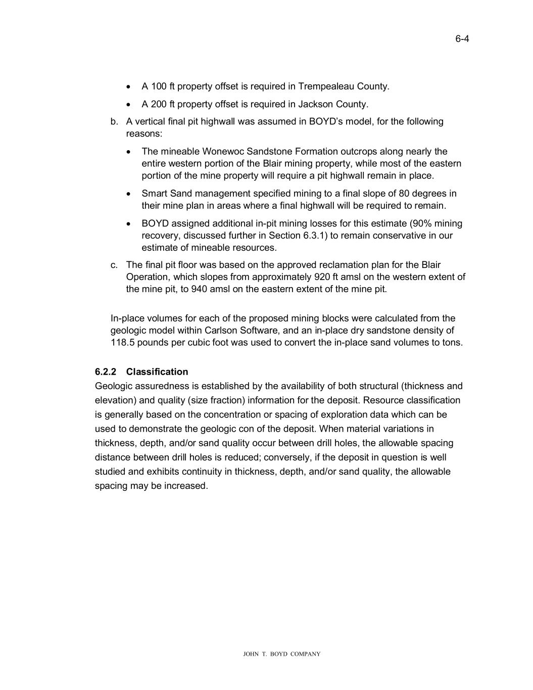 � � ���� � � ������������������������ •� ������IW�SURSHUW\�RII�HW�L��UHT�LUHG�LQ�7UHPSHDOHD���R�QW\�� •� ������IW�SURSHUW\�RII�HW�L��UHT�LUHG�LQ�-DFN�RQ��R�QW\�� E�� ��YHUWLFDO�ILQDO�SLW�KLJK�DOO��D��D���PHG�LQ�%2<����PRGHO��IRU�WKH�IROOR�LQJ� UHD�RQ��� •� 7KH�PLQHDEOH�:RQH�RF�6DQG�WRQH�)RUPDWLRQ�R�WFURS��DORQJ�QHDUO\�WKH� HQWLUH��H�WHUQ�SRUWLRQ�RI�WKH�%ODLU�PLQLQJ�SURSHUW\���KLOH�PR�W�RI�WKH�HD�WHUQ� SRUWLRQ�RI�WKH�PLQH�SURSHUW\��LOO�UHT�LUH�D�SLW�KLJK�DOO�UHPDLQ�LQ�SODFH�� •� 6PDUW�6DQG�PDQDJHPHQW��SHFLILHG�PLQLQJ�WR�D�ILQDO��ORSH�RI����GHJUHH��LQ� WKHLU�PLQH�SODQ�LQ�DUHD���KHUH�D�ILQDO�KLJK�DOO��LOO�EH�UHT�LUHG�WR�UHPDLQ�� •� %2<��D��LJQHG�DGGLWLRQDO�LQ�SLW�PLQLQJ�OR��H��IRU�WKL��H�WLPDWH������PLQLQJ� UHFRYHU\��GL�F���HG�I�UWKHU�LQ�6HFWLRQ��������WR�UHPDLQ�FRQ�HUYDWLYH�LQ�R�U� H�WLPDWH�RI�PLQHDEOH�UH�R�UFH��� F�� 7KH�ILQDO�SLW�IORRU��D��ED�HG�RQ�WKH�DSSURYHG�UHFODPDWLRQ�SODQ�IRU�WKH�%ODLU� 2SHUDWLRQ���KLFK��ORSH��IURP�DSSUR�LPDWHO\�����IW�DP�O�RQ�WKH��H�WHUQ�H�WHQW�RI� WKH�PLQH�SLW��WR�����DP�O�RQ�WKH�HD�WHUQ�H�WHQW�RI�WKH�PLQH�SLW�� � ,Q�SODFH�YRO�PH��IRU�HDFK�RI�WKH�SURSR�HG�PLQLQJ�EORFN���HUH�FDOF�ODWHG�IURP�WKH� JHRORJLF�PRGHO��LWKLQ��DUO�RQ�6RIW�DUH��DQG�DQ�LQ�SODFH�GU\��DQG�WRQH�GHQ�LW\�RI� ������SR�QG��SHU�F�ELF�IRRW��D����HG�WR�FRQYHUW�WKH�LQ�SODFH��DQG�YRO�PH��WR�WRQ��� � ������ ���VV���F���R�� �HRORJLF�D���UHGQH���L��H�WDEOL�KHG�E\�WKH�DYDLODELOLW\�RI�ERWK��WU�FW�UDO��WKLFNQH���DQG� HOHYDWLRQ��DQG�T�DOLW\���L�H�IUDFWLRQ��LQIRUPDWLRQ�IRU�WKH�GHSR�LW��5H�R�UFH�FOD��LILFDWLRQ� L��JHQHUDOO\�ED�HG�RQ�WKH�FRQFHQWUDWLRQ�RU��SDFLQJ�RI�H�SORUDWLRQ�GDWD��KLFK�FDQ�EH� ��HG�WR�GHPRQ�WUDWH�WKH�JHRORJLF�FRQ�RI�WKH�GHSR�LW��:KHQ�PDWHULDO�YDULDWLRQ��LQ� WKLFNQH����GHSWK��DQG�RU��DQG�T�DOLW\�RFF�U�EHW�HHQ�GULOO�KROH���WKH�DOOR�DEOH��SDFLQJ� GL�WDQFH�EHW�HHQ�GULOO�KROH��L��UHG�FHG��FRQYHU�HO\��LI�WKH�GHSR�LW�LQ�T�H�WLRQ�L���HOO� �W�GLHG�DQG�H�KLELW��FRQWLQ�LW\�LQ�WKLFNQH����GHSWK��DQG�RU��DQG�T�DOLW\��WKH�DOOR�DEOH� �SDFLQJ�PD\�EH�LQFUHD�HG�� � � �