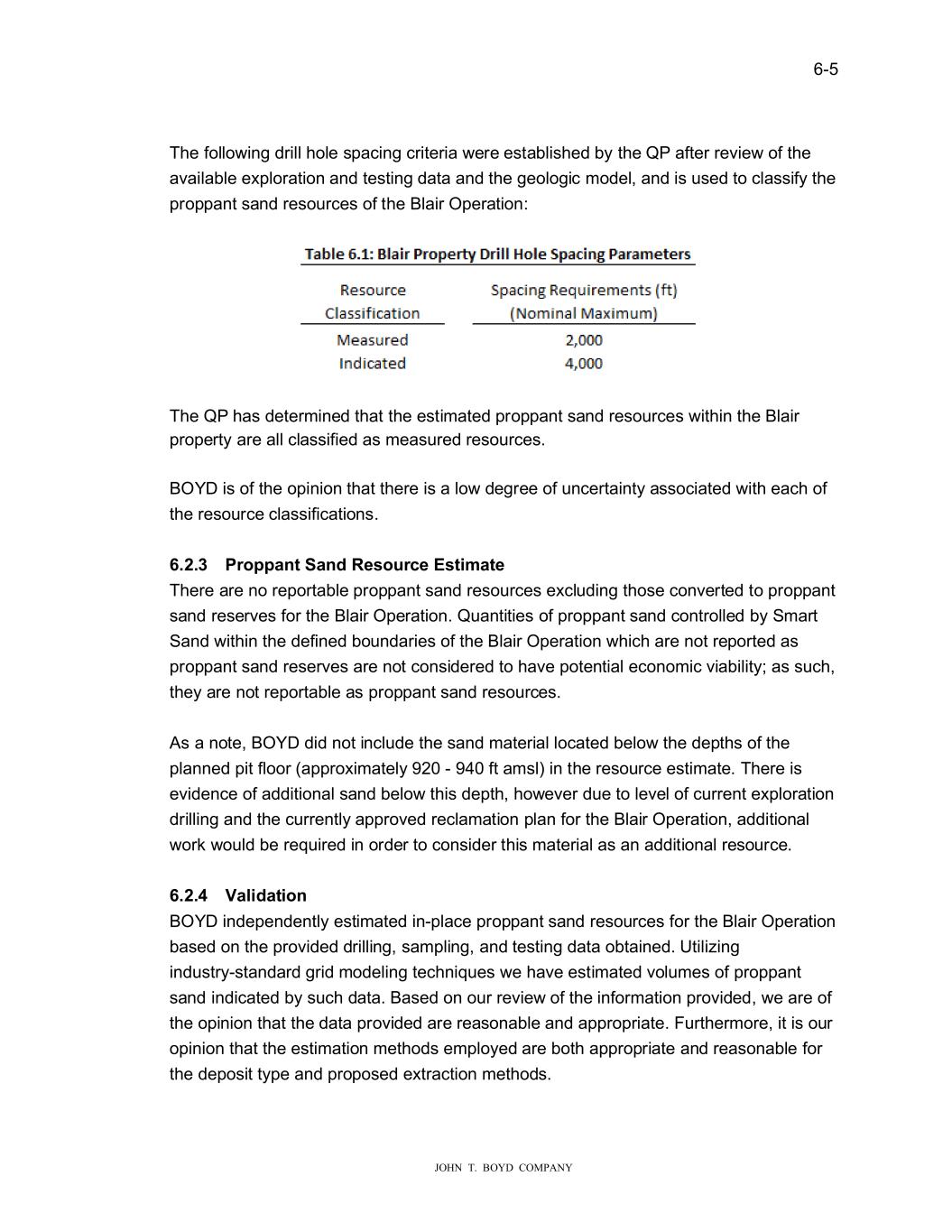 � � ���� � � ������������������������ 7KH�IROOR�LQJ�GULOO�KROH��SDFLQJ�FULWHULD��HUH�H�WDEOL�KHG�E\�WKH�43�DIWHU�UHYLH��RI�WKH� DYDLODEOH�H�SORUDWLRQ�DQG�WH�WLQJ�GDWD�DQG�WKH�JHRORJLF�PRGHO��DQG�L����HG�WR�FOD��LI\�WKH� SURSSDQW��DQG�UH�R�UFH��RI�WKH�%ODLU�2SHUDWLRQ�� � � � 7KH�43�KD��GHWHUPLQHG�WKDW�WKH�H�WLPDWHG�SURSSDQW��DQG�UH�R�UFH���LWKLQ�WKH�%ODLU� SURSHUW\�DUH�DOO�FOD��LILHG�D��PHD��UHG�UH�R�UFH���� � %2<��L��RI�WKH�RSLQLRQ�WKDW�WKHUH�L��D�OR��GHJUHH�RI��QFHUWDLQW\�D��RFLDWHG��LWK�HDFK�RI� WKH�UH�R�UFH�FOD��LILFDWLRQ��� � ������ 3�RSS����6������VR��F���V��P���� 7KHUH�DUH�QR�UHSRUWDEOH�SURSSDQW��DQG�UH�R�UFH��H�FO�GLQJ�WKR�H�FRQYHUWHG�WR�SURSSDQW� �DQG�UH�HUYH��IRU�WKH�%ODLU�2SHUDWLRQ��4�DQWLWLH��RI�SURSSDQW��DQG�FRQWUROOHG�E\�6PDUW� 6DQG��LWKLQ�WKH�GHILQHG�ER�QGDULH��RI�WKH�%ODLU�2SHUDWLRQ��KLFK�DUH�QRW�UHSRUWHG�D�� SURSSDQW��DQG�UH�HUYH��DUH�QRW�FRQ�LGHUHG�WR�KDYH�SRWHQWLDO�HFRQRPLF�YLDELOLW\��D����FK�� WKH\�DUH�QRW�UHSRUWDEOH�D��SURSSDQW��DQG�UH�R�UFH��� � ���D�QRWH��%2<��GLG�QRW�LQFO�GH�WKH��DQG�PDWHULDO�ORFDWHG�EHOR��WKH�GHSWK��RI�WKH� SODQQHG�SLW�IORRU��DSSUR�LPDWHO\�����������IW�DP�O��LQ�WKH�UH�R�UFH�H�WLPDWH��7KHUH�L�� HYLGHQFH�RI�DGGLWLRQDO��DQG�EHOR��WKL��GHSWK��KR�HYHU�G�H�WR�OHYHO�RI�F�UUHQW�H�SORUDWLRQ� GULOOLQJ�DQG�WKH�F�UUHQWO\�DSSURYHG�UHFODPDWLRQ�SODQ�IRU�WKH�%ODLU�2SHUDWLRQ��DGGLWLRQDO� �RUN��R�OG�EH�UHT�LUHG�LQ�RUGHU�WR�FRQ�LGHU�WKL��PDWHULDO�D��DQ�DGGLWLRQDO�UH�R�UFH�� � ������ ��������R�� %2<��LQGHSHQGHQWO\�H�WLPDWHG�LQ�SODFH�SURSSDQW��DQG�UH�R�UFH��IRU�WKH�%ODLU�2SHUDWLRQ� ED�HG�RQ�WKH�SURYLGHG�GULOOLQJ���DPSOLQJ��DQG�WH�WLQJ�GDWD�REWDLQHG��8WLOL�LQJ� LQG��WU\��WDQGDUG�JULG�PRGHOLQJ�WHFKQLT�H���H�KDYH�H�WLPDWHG�YRO�PH��RI�SURSSDQW� �DQG�LQGLFDWHG�E\���FK�GDWD��%D�HG�RQ�R�U�UHYLH��RI�WKH�LQIRUPDWLRQ�SURYLGHG���H�DUH�RI� WKH�RSLQLRQ�WKDW�WKH�GDWD�SURYLGHG�DUH�UHD�RQDEOH�DQG�DSSURSULDWH��)�UWKHUPRUH��LW�L��R�U� RSLQLRQ�WKDW�WKH�H�WLPDWLRQ�PHWKRG��HPSOR\HG�DUH�ERWK�DSSURSULDWH�DQG�UHD�RQDEOH�IRU� WKH�GHSR�LW�W\SH�DQG�SURSR�HG�H�WUDFWLRQ�PHWKRG��� � �