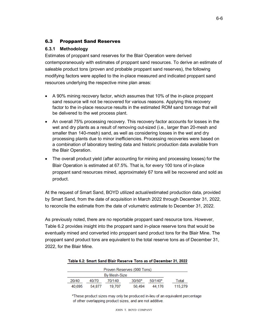 � � ���� � � ������������������������ ���� 3URSSD���6D�����V�U��V� ������ ����R�R�R���� (�WLPDWH��RI�SURSSDQW��DQG�UH�HUYH��IRU�WKH�%ODLU�2SHUDWLRQ��HUH�GHULYHG� FRQWHPSRUDQHR��O\��LWK�H�WLPDWH��RI�SURSSDQW��DQG�UH�R�UFH���7R�GHULYH�DQ�H�WLPDWH�RI� �DOHDEOH�SURG�FW�WRQ���SURYHQ�DQG�SUREDEOH�SURSSDQW��DQG�UH�HUYH����WKH�IROOR�LQJ� PRGLI\LQJ�IDFWRU���HUH�DSSOLHG�WR�WKH�LQ�SODFH�PHD��UHG�DQG�LQGLFDWHG�SURSSDQW��DQG� UH�R�UFH���QGHUO\LQJ�WKH�UH�SHFWLYH�PLQH�SODQ�DUHD��� � •� ������PLQLQJ�UHFRYHU\�IDFWRU���KLFK�D���PH��WKDW�����RI�WKH�LQ�SODFH�SURSSDQW� �DQG�UH�R�UFH��LOO�QRW�EH�UHFRYHUHG�IRU�YDULR���UHD�RQ����SSO\LQJ�WKL��UHFRYHU\� IDFWRU�WR�WKH�LQ�SODFH�UH�R�UFH�UH��OW��LQ�WKH�H�WLPDWHG�520��DQG�WRQQDJH�WKDW��LOO� EH�GHOLYHUHG�WR�WKH��HW�SURFH���SODQW�� •� �Q�RYHUDOO�����SURFH��LQJ�UHFRYHU\��7KL��UHFRYHU\�IDFWRU�DFFR�QW��IRU�OR��H��LQ�WKH� �HW�DQG�GU\�SODQW��D��D�UH��OW�RI�UHPRYLQJ�R�W��L�HG��L�H���ODUJHU�WKDQ����PH�K�DQG� �PDOOHU�WKDQ�����PH�K���DQG��D���HOO�D��FRQ�LGHULQJ�OR��H��LQ�WKH��HW�DQG�GU\� SURFH��LQJ�SODQW��G�H�WR�PLQRU�LQHIILFLHQFLH���3URFH��LQJ�UHFRYHULH���HUH�ED�HG�RQ� D�FRPELQDWLRQ�RI�ODERUDWRU\�WH�WLQJ�GDWD�DQG�KL�WRULF�SURG�FWLRQ�GDWD�DYDLODEOH�IURP� WKH�%ODLU�2SHUDWLRQ�� •� 7KH�RYHUDOO�SURG�FW�\LHOG��DIWHU�DFFR�QWLQJ�IRU�PLQLQJ�DQG�SURFH��LQJ�OR��H���IRU�WKH� %ODLU�2SHUDWLRQ�L��H�WLPDWHG�DW��������7KDW�L���IRU�HYHU\�����WRQ��RI�LQ�SODFH� SURSSDQW��DQG�UH�R�UFH��PLQHG��DSSUR�LPDWHO\����WRQ���LOO�EH�UHFRYHUHG�DQG��ROG�D�� SURG�FW�� � �W�WKH�UHT�H�W�RI�6PDUW�6DQG��%2<���WLOL�HG�DFW�DO�H�WLPDWHG�SURG�FWLRQ�GDWD��SURYLGHG� E\�6PDUW�6DQG��IURP�WKH�GDWH�RI�DFT�L�LWLRQ�LQ�0DUFK������WKUR�JK��HFHPEHU����������� WR�UHFRQFLOH�WKH�H�WLPDWH�IURP�WKH�GDWH�RI�YRO�PHWULF�H�WLPDWH�WR��HFHPEHU����������� � ���SUHYLR��O\�QRWHG��WKHUH�DUH�QR�UHSRUWDEOH�SURSSDQW��DQG�UH�R�UFH�WRQ����R�HYHU�� 7DEOH�����SURYLGH��LQ�LJKW�LQWR�WKH�SURSSDQW��DQG�LQ�SODFH�UH�HUYH�WRQ��WKDW��R�OG�EH� HYHQW�DOO\�PLQHG�DQG�FRQYHUWHG�LQWR�SURSSDQW��DQG�SURG�FW�WRQ��IRU�WKH�%ODLU�0LQH��7KH� SURSSDQW��DQG�SURG�FW�WRQ��DUH�HT�LYDOHQW�WR�WKH�WRWDO�UH�HUYH�WRQ��D��RI��HFHPEHU����� ������IRU�WKH�%ODLU�0LQH�� � �