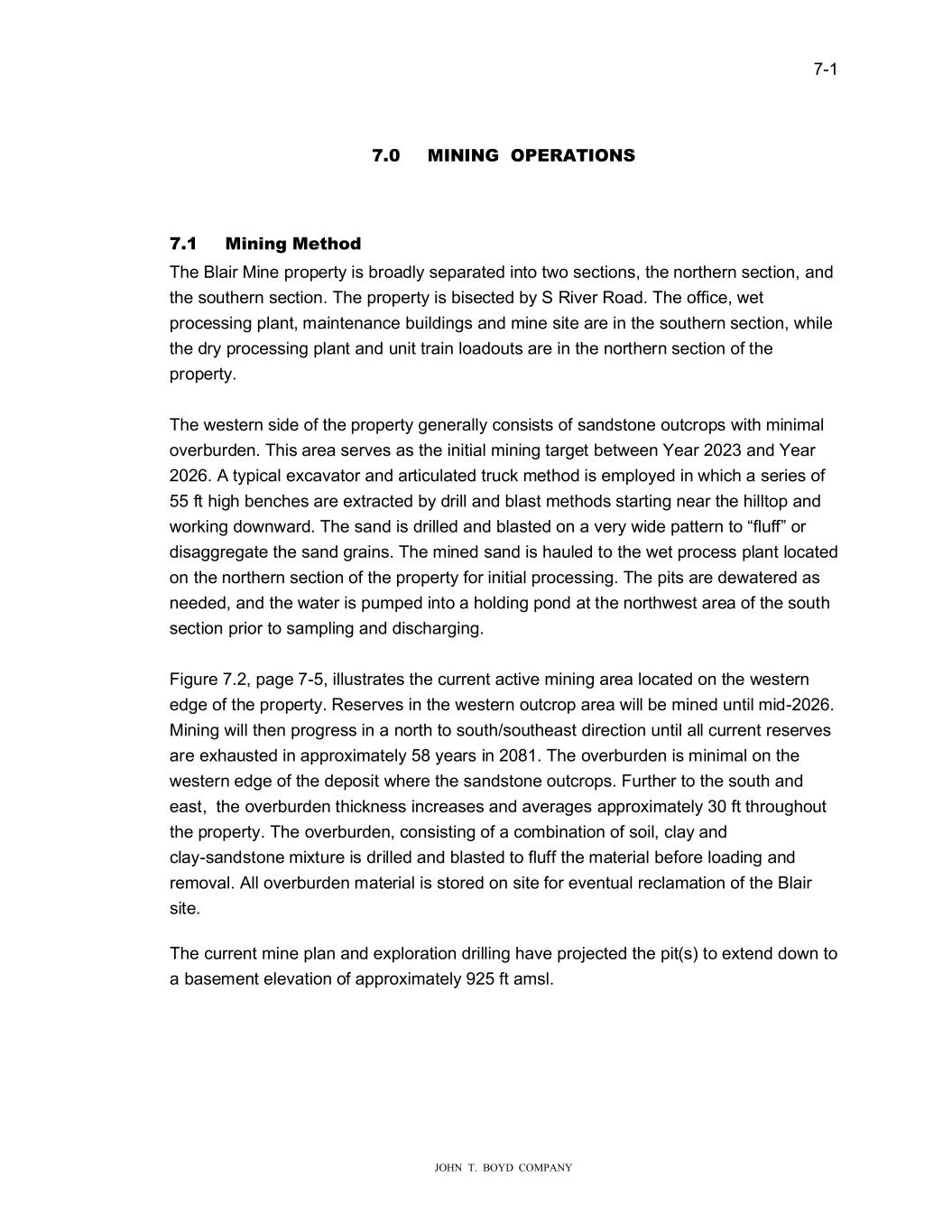 � � ���� � � � ������������������������ ���� 0,1,1���23���7,21�� � � ���� 0������0���RG� 7�H�%ODL��0LQH�S�RSH�W\�LV�E�RDGO\�VHSD�DWHG�LQWR�W�R�VHFWLRQV��W�H�QR�W�H�Q�VHFWLRQ��DQG� W�H�VR�W�H�Q�VHFWLRQ��7�H�S�RSH�W\�LV�ELVHFWHG�E\�6�5LYH��5RDG��7�H�RIILFH���HW� S�RFHVVLQ��SODQW��PDLQWHQDQFH�E�LOGLQ�V�DQG�PLQH�VLWH�D�H�LQ�W�H�VR�W�H�Q�VHFWLRQ����LOH� W�H�G�\�S�RFHVVLQ��SODQW�DQG��QLW�W�DLQ�ORDGR�WV�D�H�LQ�W�H�QR�W�H�Q�VHFWLRQ�RI�W�H� S�RSH�W\�� �� 7�H��HVWH�Q�VLGH�RI�W�H�S�RSH�W\��HQH�DOO\�FRQVLVWV�RI�VDQGVWRQH�R�WF�RSV��LW��PLQLPDO� RYH�E��GHQ��7�LV�D�HD�VH�YHV�DV�W�H�LQLWLDO�PLQLQ��WD��HW�EHW�HHQ��HD�������DQG��HD�� ��������W\SLFDO�H�FDYDWR��DQG�D�WLF�ODWHG�W��FN�PHW�RG�LV�HPSOR\HG�LQ���LF��D�VH�LHV�RI� ���IW��L���EHQF�HV�D�H�H�W�DFWHG�E\�G�LOO�DQG�EODVW�PHW�RGV�VWD�WLQ��QHD��W�H��LOOWRS�DQG� �R�NLQ��GR�Q�D�G��7�H�VDQG�LV�G�LOOHG�DQG�EODVWHG�RQ�D�YH�\��LGH�SDWWH�Q�WR��IO�II��R�� GLVD���H�DWH�W�H�VDQG���DLQV��7�H�PLQHG�VDQG�LV��D�OHG�WR�W�H��HW�S�RFHVV�SODQW�ORFDWHG� RQ�W�H�QR�W�H�Q�VHFWLRQ�RI�W�H�S�RSH�W\�IR��LQLWLDO�S�RFHVVLQ���7�H�SLWV�D�H�GH�DWH�HG�DV� QHHGHG��DQG�W�H��DWH��LV�S�PSHG�LQWR�D��ROGLQ��SRQG�DW�W�H�QR�W��HVW�D�HD�RI�W�H�VR�W�� VHFWLRQ�S�LR��WR�VDPSOLQ��DQG�GLVF�D��LQ��� � )L���H������SD�H������LOO�VW�DWHV�W�H�F���HQW�DFWLYH�PLQLQ��D�HD�ORFDWHG�RQ�W�H��HVWH�Q� HG�H�RI�W�H�S�RSH�W\��5HVH�YHV�LQ�W�H��HVWH�Q�R�WF�RS�D�HD��LOO�EH�PLQHG��QWLO�PLG������� 0LQLQ���LOO�W�HQ�S�R��HVV�LQ�D�QR�W��WR�VR�W��VR�W�HDVW�GL�HFWLRQ��QWLO�DOO�F���HQW��HVH�YHV� D�H�H��D�VWHG�LQ�DSS�R�LPDWHO\����\HD�V�LQ�������7�H�RYH�E��GHQ�LV�PLQLPDO�RQ�W�H� �HVWH�Q�HG�H�RI�W�H�GHSRVLW���H�H�W�H�VDQGVWRQH�R�WF�RSV��)��W�H��WR�W�H�VR�W��DQG� HDVW���W�H�RYH�E��GHQ�W�LFNQHVV�LQF�HDVHV�DQG�DYH�D�HV�DSS�R�LPDWHO\����IW�W��R���R�W� W�H�S�RSH�W\��7�H�RYH�E��GHQ��FRQVLVWLQ��RI�D�FRPELQDWLRQ�RI�VRLO��FOD\�DQG� FOD\�VDQGVWRQH�PL�W��H�LV�G�LOOHG�DQG�EODVWHG�WR�IO�II�W�H�PDWH�LDO�EHIR�H�ORDGLQ��DQG� �HPRYDO���OO�RYH�E��GHQ�PDWH�LDO�LV�VWR�HG�RQ�VLWH�IR��HYHQW�DO��HFODPDWLRQ�RI�W�H�%ODL�� VLWH���� � 7�H�F���HQW�PLQH�SODQ�DQG�H�SOR�DWLRQ�G�LOOLQ���DYH�S�RMHFWHG�W�H�SLW�V��WR�H�WHQG�GR�Q�WR� D�EDVHPHQW�HOHYDWLRQ�RI�DSS�R�LPDWHO\�����IW�DPVO�� � � �