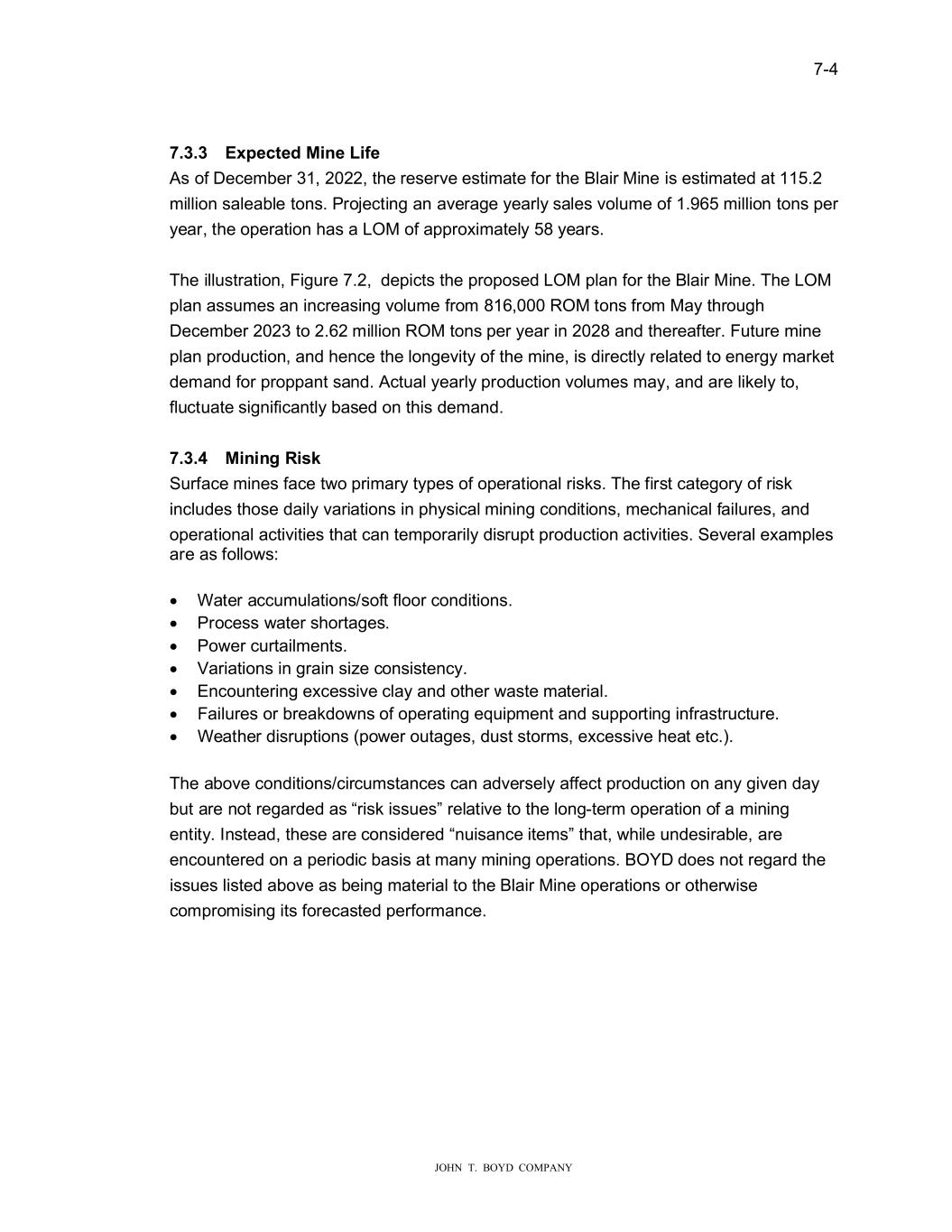 � � ���� � � � ������������������������ ������� ��SHFWH���L�H��LIH� �V�RI��HFHPEH������������W�H��HVH�YH�HVWLPDWH�IR��W�H�%ODL��0LQH�LV�HVWLPDWHG�DW������� PLOOLRQ�VDOHDEOH�WRQV��3�RMHFWLQ��DQ�DYH�D�H�\HD�O\�VDOHV�YRO�PH�RI�������PLOOLRQ�WRQV�SH�� \HD���W�H�RSH�DWLRQ��DV�D�/20�RI�DSS�R�LPDWHO\����\HD�V��� � 7�H�LOO�VW�DWLRQ��)L���H�������GHSLFWV�W�H�S�RSRVHG�/20�SODQ�IR��W�H�%ODL��0LQH��7�H�/20� SODQ�DVV�PHV�DQ�LQF�HDVLQ��YRO�PH�I�RP���������520�WRQV�I�RP�0D\�W��R���� �HFHPEH�������WR������PLOOLRQ�520�WRQV�SH��\HD��LQ������DQG�W�H�HDIWH���)�W��H�PLQH� SODQ�S�RG�FWLRQ��DQG��HQFH�W�H�ORQ�HYLW\�RI�W�H�PLQH��LV�GL�HFWO\��HODWHG�WR�HQH��\�PD�NHW� GHPDQG�IR��S�RSSDQW�VDQG���FW�DO�\HD�O\�S�RG�FWLRQ�YRO�PHV�PD\��DQG�D�H�OLNHO\�WR�� IO�FW�DWH�VL�QLILFDQWO\�EDVHG�RQ�W�LV�GHPDQG��� � ������ �L�L����L��� 6��IDFH�PLQHV�IDFH�W�R�S�LPD�\�W\SHV�RI�RSH�DWLRQDO��LVNV��7�H�IL�VW�FDWH�R�\�RI��LVN� LQFO�GHV�W�RVH�GDLO\�YD�LDWLRQV�LQ�S�\VLFDO�PLQLQ��FRQGLWLRQV��PHF�DQLFDO�IDLO��HV��DQG�� RSH�DWLRQDO�DFWLYLWLHV�W�DW�FDQ�WHPSR�D�LO\�GLV��SW�S�RG�FWLRQ�DFWLYLWLHV��6HYH�DO�H�DPSOHV� D�H�DV�IROOR�V�� � •� :DWH��DFF�P�ODWLRQV�VRIW�IORR��FRQGLWLRQV�� •� 3�RFHVV��DWH��V�R�WD�HV�� •� 3R�H��F��WDLOPHQWV�� •� 9D�LDWLRQV�LQ���DLQ�VL�H�FRQVLVWHQF\�� •� (QFR�QWH�LQ��H�FHVVLYH�FOD\�DQG�RW�H���DVWH�PDWH�LDO�� •� )DLO��HV�R��E�HDNGR�QV�RI�RSH�DWLQ��HT�LSPHQW�DQG�V�SSR�WLQ��LQI�DVW��FW��H�� •� :HDW�H��GLV��SWLRQV��SR�H��R�WD�HV��G�VW�VWR�PV��H�FHVVLYH��HDW�HWF���� � 7�H�DERYH�FRQGLWLRQV�FL�F�PVWDQFHV�FDQ�DGYH�VHO\�DIIHFW�S�RG�FWLRQ�RQ�DQ\��LYHQ�GD\� E�W�D�H�QRW��H�D�GHG�DV���LVN�LVV�HV���HODWLYH�WR�W�H�ORQ��WH�P�RSH�DWLRQ�RI�D�PLQLQ�� HQWLW\��,QVWHDG��W�HVH�D�H�FRQVLGH�HG��Q�LVDQFH�LWHPV��W�DW����LOH��QGHVL�DEOH��D�H� HQFR�QWH�HG�RQ�D�SH�LRGLF�EDVLV�DW�PDQ\�PLQLQ��RSH�DWLRQV��%2���GRHV�QRW��H�D�G�W�H� LVV�HV�OLVWHG�DERYH�DV�EHLQ��PDWH�LDO�WR�W�H�%ODL��0LQH�RSH�DWLRQV�R��RW�H��LVH� FRPS�RPLVLQ��LWV�IR�HFDVWHG�SH�IR�PDQFH��� � � �