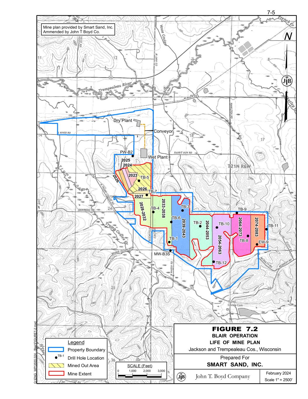 TB-12 2 0 5 4 -2 0 6 3 2 0 4 4 -2 0 5 3 2 0 3 9 -2 0 4 3 2 0 6 4 -2 0 7 3 2 0 3 3 -2 0 3 8 2 0 7 4 -2 0 8 3 2 0 2 8 -2 0 3 2 2023 2027 2025 2024 2026 20 26 TB-1 TB-2 TB-3TB-4 TB-5 TB-6 TB-7 TB-9 EW-9 TB-10 TB-11 PW-B2 MW-B3S TB-8 7-5 0 1,000 2,000 3,000 SCALE (Feet) Dry Plant Wet Plant Conveyor Mine plan provided by Smart Sand, Inc. Ammended by John T Boyd Co. February 2024 Scale 1" = 2500' �������������������� FIGURE 7.2 BLAIR OPERATION LIFE OF MINE PLAN Jackson and Trempealeau Cos., Wisconsin Prepared For SMART SAND, INC. Q :\ E N G _ W P \3 5 5 5 .0 2 4 - B la ir \F IG U R E 7 -2 .m xd Legend Property Boundary Mine Extent Drill Hole Location Mined Out Area TB-1