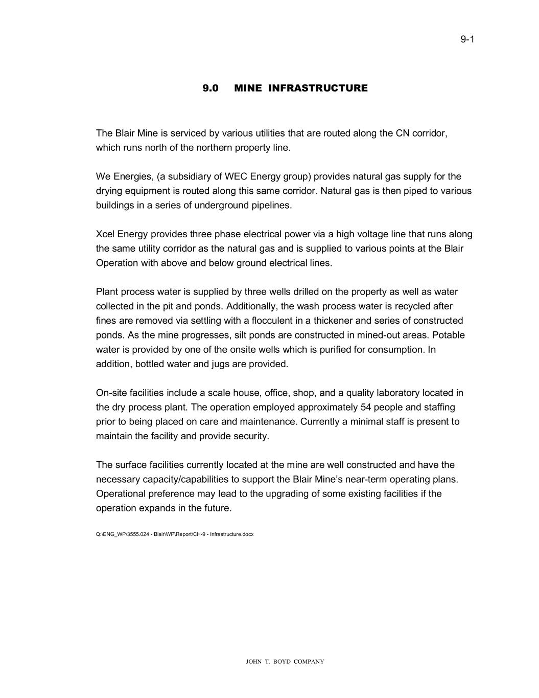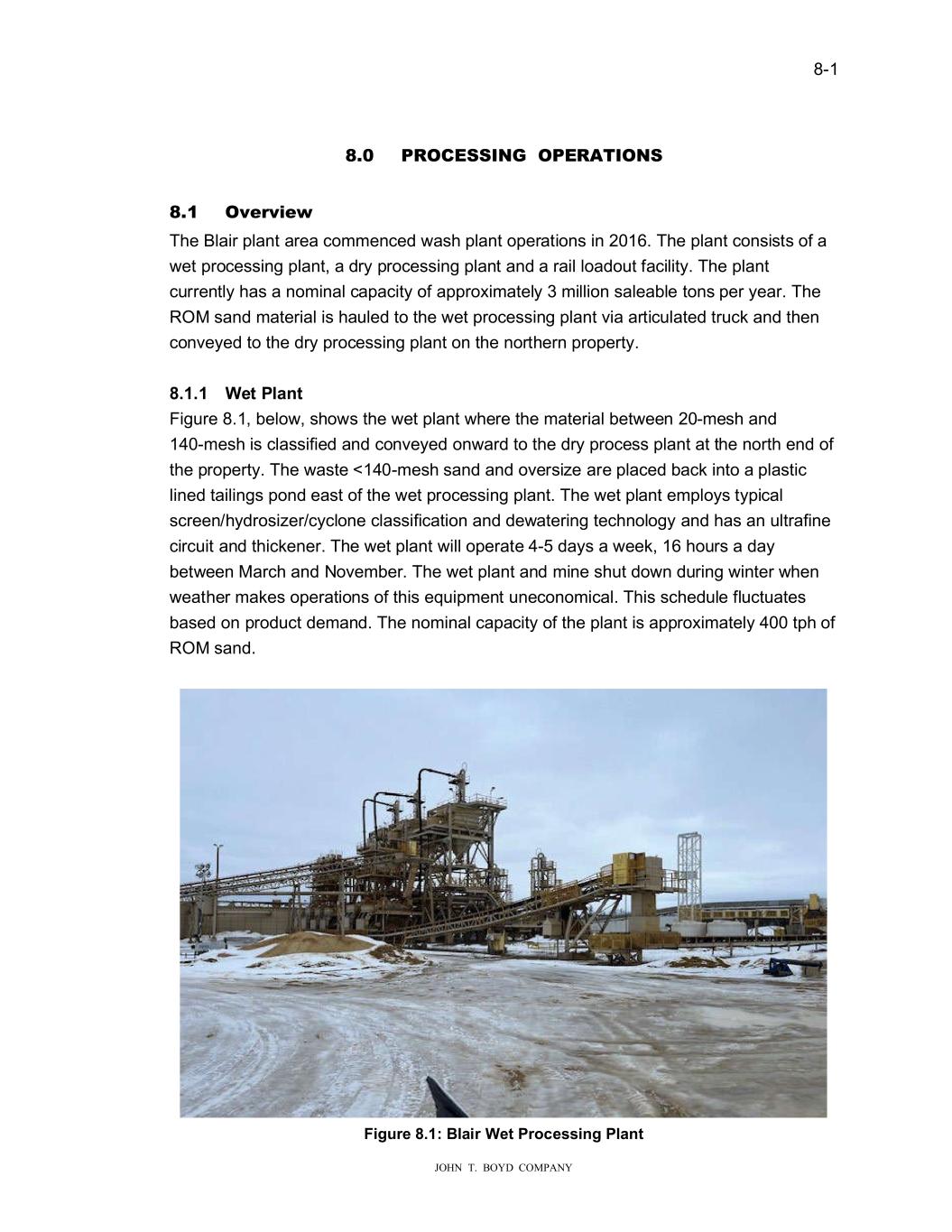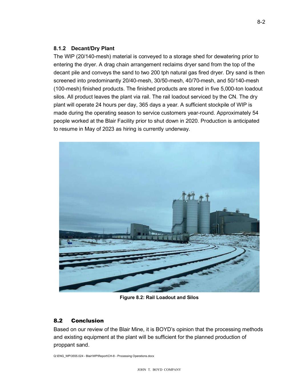 � � ���� � � � ����������������������� 7KH�DYHUDJH�SURFHVV�\LHOG�LV�UHSRUWHG�WR�EH������DV�VXFK����PLOOLRQ�520�WRQV�DUH� H�SHFWHG�WR�SURGXFH�DSSUR�LPDWHO\���������WRQV�RI�ILQLVKHG�SURGXFW��� � 7KH�/20�SODQ��FRQWDLQHG�LQ�&KDSWHU����DVVXPHV�D�VWHDG\�VWDWH�LQFUHDVH�LQ�VDOHV� YROXPH�IURP������WR������XQWLO�QRPLQDO�SODQW�FDSDFLW\�RI������PLOOLRQ�WRQV�LV�DFKLHYHG�LQ� ������7KH�PLQH�DQG�SODQW��LOO�RSHUDWH�DW�WKLV�UDWH�XQWLO�������KHQ�WKH�GHSRVLW�LV� GHSOHWHG��)XWXUH�PLQH�SODQ�SURGXFWLRQ��DQG�KHQFH�WKH�ORQJHYLW\�RI�WKH�PLQH��LV�GLUHFWO\� UHODWHG�WR�HQHUJ\�PDUNHW�GHPDQG�IRU�)UDF�VDQG��$FWXDO�\HDUO\�SURGXFWLRQ�YROXPHV�PD\�� DQG�DUH�OLNHO\�WR��IOXFWXDWH�VLJQLILFDQWO\�EDVHG�RQ�WKLV�GHPDQG��� � ������ 3URFHVV���� 7KH�%ODLU�SODQW�FRPPHQFHG��DVK�SODQW�RSHUDWLRQV�LQ�������,W�VKXW�GR�Q�LQ������GXH�WR� WKH�&29,�����SDQGHPLF�DQG�KDV�EHHQ�RQ�FDUH�DQG�PDLQWHQDQFH�VLQFH�WKHQ��7KH�520� VDQG�PDWHULDO�LV�KDXOHG�WR�DQ�LQ�SLW�IHHG�KRSSHU��KHUH�LW�LV�FUXVKHG�DQG�FRQYH\HG�WR�D� �HW�SURFHVV�SODQW��)ROOR�LQJ�UHPRYDO�RI�RYHUVL�H�DQG��DVWH�������PHVK��PDWHULDO��WKH� VDQG�LV�FRQYH\HG�WR�WKH�GU\LQJ�DQG�VFUHHQLQJ�SODQW��)LQLVKHG�SURGXFW�LV�VWRUHG�LQ�VLORV� DQG�LV�UDLOHG�WR�PXOWLSOH�RLO�DQG�JDV��HOO�VHUYLFH�FXVWRPHUV�YLD�WKH�&DQDGLDQ�1DWLRQDO� 5DLO�D\��&1���� � 7KH��HW�SODQW�HPSOR\V�W\SLFDO�VFUHHQ�K\GURVL�HU�F\FORQH�FODVVLILFDWLRQ�DQG�GH�DWHULQJ� WHFKQRORJ\�DQG�DOVR�KDV�DQ�XOWUDILQH�FLUFXLW�DQG�WKLFNHQHU��7KH��HW�SODQW�RSHUDWHV���� KRXUV�D�GD\������GD\V�D��HHN�EHW�HHQ�0DUFK�DQG�1RYHPEHU��:LQWHU��HDWKHU�VKXWV�WKH� PLQH�DQG��HW�SURFHVVLQJ�SODQW�GR�Q��$�VXEVWDQWLDO�VWRFNSLOH�LV�FUHDWHG�WR�DOOR��WKH�GU\� SURFHVVLQJ�SODQW�WR�FRQWLQXH�WR�UXQ����KRXUV�D�GD\������GD\V�D�\HDU��$Q�RYHUODQG� FRQYH\RU�WUDQVSRUWV�WKH��HW�SURFHVV�IHHG�WR�W�R�����WRQV�SHU�KRXU��WSK��QDWXUDO�JDV�ILUHG� GU\HU���U\�VDQG�LV�WKHQ�VFUHHQHG�LQWR�SUHGRPLQDQWO\�������PHVK��������PHVK�� ������PHVK��DQG��������PHVK������PHVK��ILQLVKHG�SURGXFWV��7KH�ILQLVKHG�SURGXFWV�DUH� VWRUHG�LQ�ILYH�������WRQ�ORDGRXW�VLORV�EHIRUH�EHLQJ�UDLOHG�WR�FXVWRPHUV�� � ������ ,�IUDVWU�FW�UH� (OHFWULFLW\�IRU�WKH�%ODLU�0LQH�LV�VHUYLFHG�E\�;FHO�(QHUJ\��WKDW�LV�URXWHG�DORQJ�WKH�&1� FRUULGRU���KLFK�UXQV�QRUWK�RI�WKH�QRUWKHUQ�SURSHUW\�OLQH��7KH�SLSHOLQH�SURYLGLQJ�QDWXUDO� JDV�VXSSO\�IRU�WKH�GU\LQJ�HTXLSPHQW�LV�DOVR�URXWHG�DORQJ�WKLV�FRUULGRU�DQG�LV�VXSSOLHG�E\� :H�(QHUJLHV��3ODQW�SURFHVV��DWHU�LV�VXSSOLHG�E\��HOOV�GULOOHG�RQ�WKH�SURSHUW\�DV��HOO�DV� �DWHU�FROOHFWHG�LQ�WKH�SLW�DQG�SRQGV��$GGLWLRQDOO\��WKH��DVK�SURFHVV��DWHU�LV�UHF\FOHG� DIWHU�ILQHV�DUH�UHPRYHG�YLD�VHWWOLQJ��LWK�D�IORFFXOHQW�LQ�D�WKLFNHQHU�DQG�VHULHV�RI� FRQVWUXFWHG�SRQGV��3RWDEOH��DWHU�LV�SURYLGHG�E\�RQH�RI�WKH��HOOV�RQ�VLWH�DQG�E\��DWHU� ERWWOHV�DQG�MXJV�GHOLYHUHG���� �