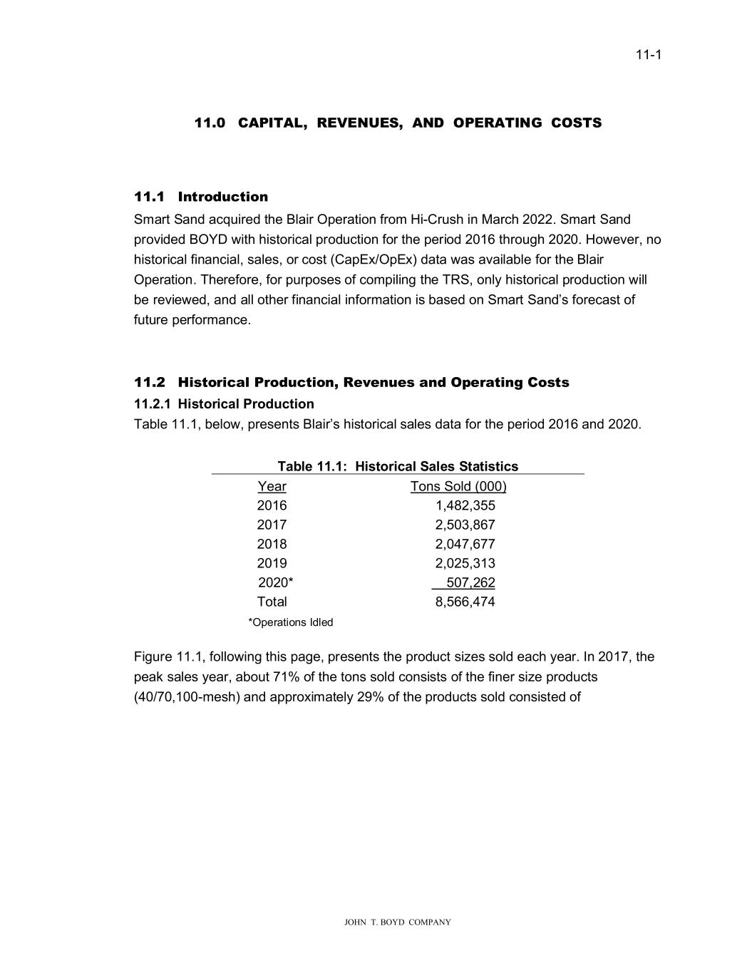 ���� ���������������������� ����� ��3,����������1�������1���23����,1����2���� ����� ,��URG���LR�� 6PDUW�6DQG�DFT�LUHG�W�H�%ODLU�2SHUDWLRQ�IURP��L�&U�V��LQ�0DUF��������6PDUW�6DQG� SURYLGHG�%2����LW���LVWRULFDO�SURG�FWLRQ�IRU�W�H�SHULRG������W�UR�����������R�HYHU��QR� �LVWRULFDO�ILQDQFLDO��VDOHV��RU�FRVW��&DS(��2S(���GDWD��DV�DYDLODEOH�IRU�W�H�%ODLU� 2SHUDWLRQ��7�HUHIRUH��IRU�S�USRVHV�RI�FRPSLOLQ��W�H�756��RQO\��LVWRULFDO�SURG�FWLRQ��LOO� EH�UHYLH�HG��DQG�DOO�RW�HU�ILQDQFLDO�LQIRUPDWLRQ�LV�EDVHG�RQ�6PDUW�6DQG�V�IRUHFDVW�RI� I�W�UH�SHUIRUPDQFH�� ����� �LV�RUL�DO�3URG���LR����H�H��HV�D�G�2SHUD�L����RV�V� ������� �L����LF�O�3����F�L��� 7DEOH�������EHOR���SUHVHQWV�%ODLU�V��LVWRULFDO�VDOHV�GDWD�IRU�W�H�SHULRG������DQG������� 7�EOH���������L����LF�O�6�OH��6���L��LF�� �HDU� 7RQV�6ROG������� ����� ����������� ����� ����������� ����� ����������� ����� ����������� �������� ������������ 7RWDO� ����������� �2SHUDWLRQV�,GOHG )L��UH�������IROOR�LQ��W�LV�SD�H��SUHVHQWV�W�H�SURG�FW�VL�HV�VROG�HDF��\HDU��,Q�������W�H� SHDN�VDOHV�\HDU��DER�W�����RI�W�H�WRQV�VROG�FRQVLVWV�RI�W�H�ILQHU�VL�H�SURG�FWV� �����������PHV���DQG�DSSUR�LPDWHO\�����RI�W�H�SURG�FWV�VROG�FRQVLVWHG�RI�