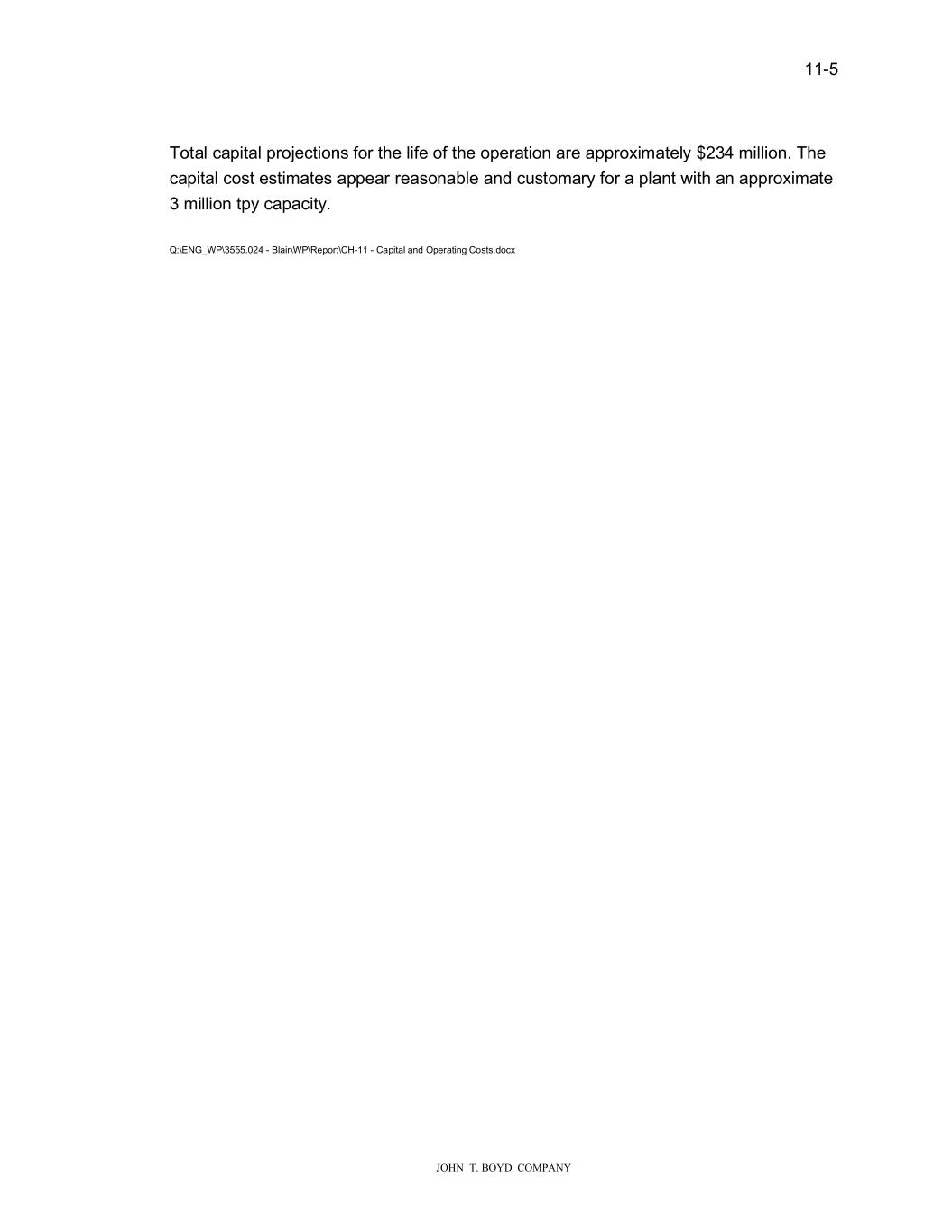 ���� ���������������������� 7RWDO�FDSLWDO�SURMHFWLRQV�IRU�W�H�OLIH�RI�W�H�RSHUDWLRQ�DUH�DSSUR�LPDWHO\������PLOOLRQ��7�H� FDSLWDO�FRVW�HVWLPDWHV�DSSHDU�UHDVRQDEOH�DQG�F�VWRPDU\�IRU�D�SODQW��LW��DQ�DSSUR�LPDWH� ��PLOOLRQ�WS\�FDSDFLW\�� 4��(1*B:3������������%ODLU�:3�5HSRUW�&�������&DSLWDO�DQG�2SHUDWLQ��&RVWV�GRF�